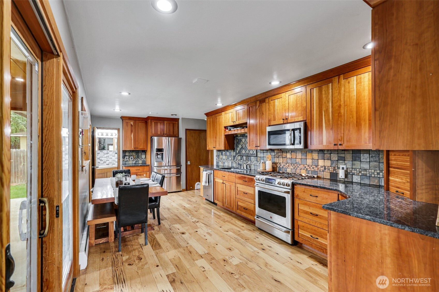 Step into comfort and versatility with this unique Ritzville home, designed for both everyday living and multi-generational convenience. Featuring two kitchens, two utility rooms, and a bathroom on each level, the layout is ideal for multifamily living. The main floor primary suite offers privacy with its own en-suite bath.Enjoy modern amenities such as radiant heating, solar panels, and a Blaze King wood stove for efficiency and year-round comfort. The beautifully updated kitchen anchors the home, while outside, the covered patio with heaters and a built-in fire-cooking station.The property is complete with a two-car garage, a large shop with RV parking capacity, and a fully fenced back yard!