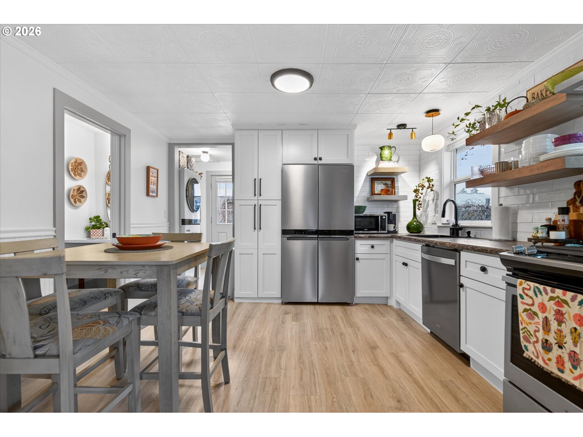 Welcome to 1005 Walnut. This professionally remodeled home has been thoughtfully updated from top to bottom, inside and out. Offering 2 bedrooms and 1.5 baths, the home may be modest in size at 820 square feet, but every inch has been maximized for efficiency and comfort. Interior improvements include new flooring, fresh paint and trim, updated stainless steel appliances, a stackable laundry setup, and a new hot water heater, creating a clean, modern living space that feels both functional and inviting. Outside, updates continue with a newer roof, refreshed siding, an inground sprinkler system, and a privacy fence. The detached garage features updated siding and an electric door, ideal for vehicle parking or a workshop. Situated on a corner lot adjacent to public space and just a short distance from historic downtown Baker City, this move-in-ready home offers modern convenience in a prime location.
