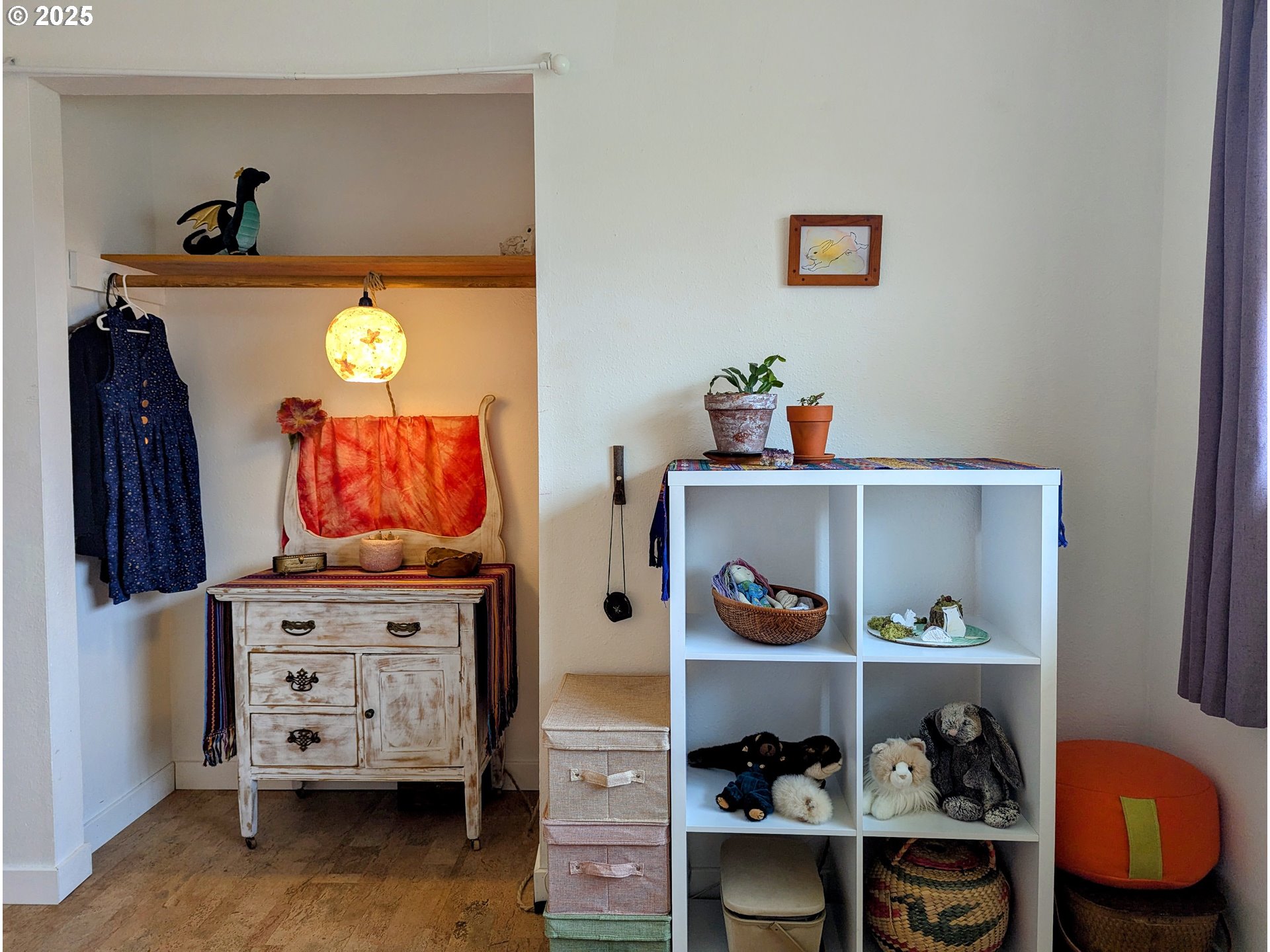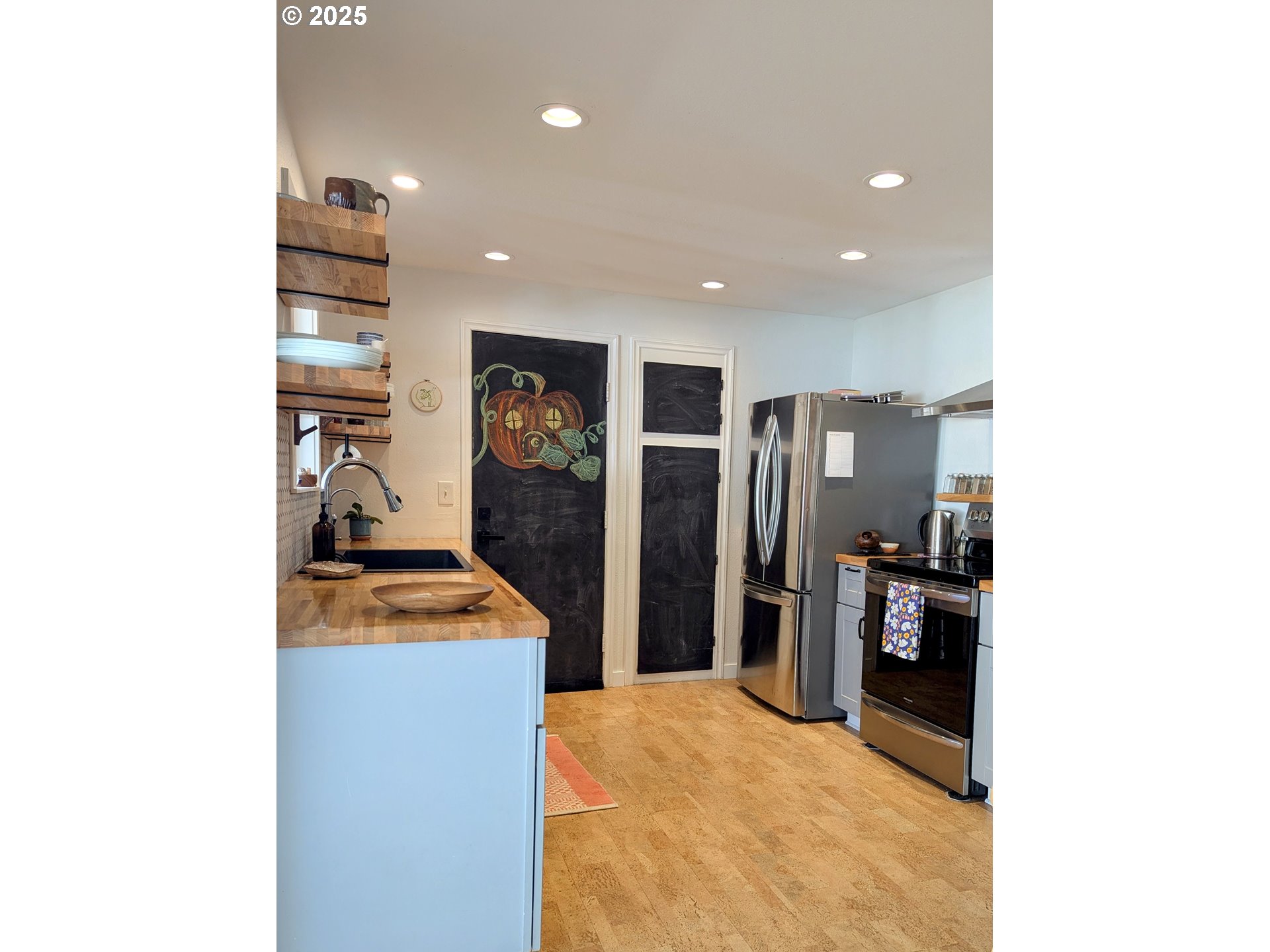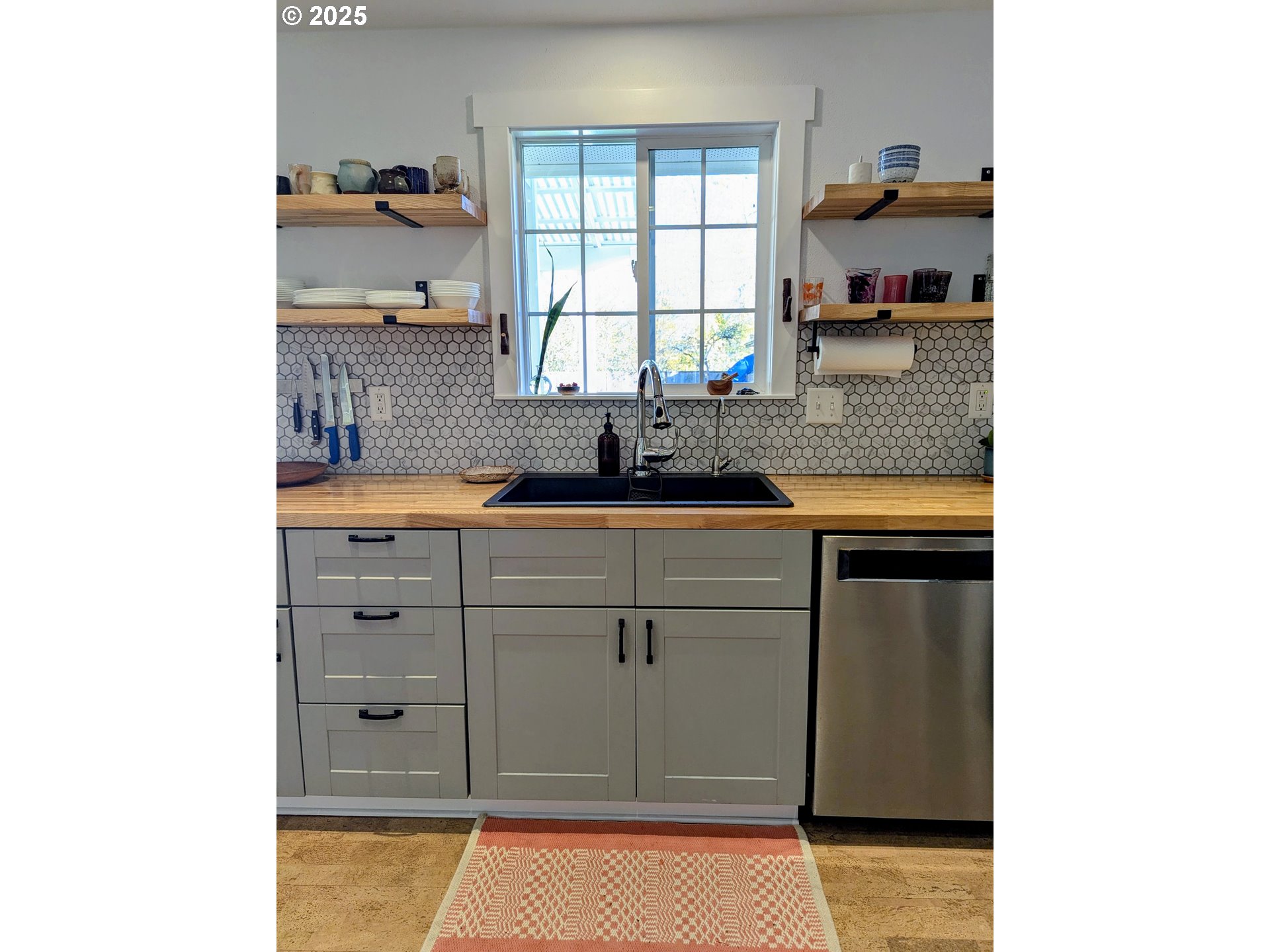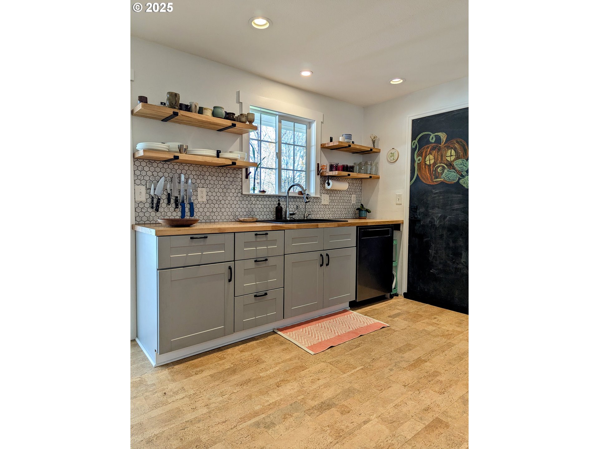 This beautifully maintained 3-bedroom, 1-bath home combines comfort, character, and convenience in a desirable Northeast Corvallis neighborhood. The updated open-concept kitchen - dining - living area creates an inviting space perfect for everyday living. The kitchen features warm wood countertops, modern cabinets, open shelving, stainless steel finishes, filtered water at the sink. Cork flooring runs throughout the home for a warm, cohesive feel. The remodeled bath offers waterproof vinyl flooring, and a clean subway tile finish. Additional updates include fresh exterior paint in 2025, new lighting and ceiling fans throughout, brand new water heater -just installed, plus a newer roof installed 4 years ago. The attached 1-car garage offers easy parking and extra storage as well as additional parking in the drive with space for 3 more midsized vehicles or an RV. Outside, you’ll find a spacious, beautifully landscaped backyard designed for relaxation and play. Enjoy a large above-ground playhouse and slide with a chicken run beneath, raised garden beds, fruit trees, berries, and a vibrant patch of perennial flowers. Enjoy the convenience of being within blocks of Village Green Park and close proximity to schools and shopping. This move-in-ready home is an exceptional value in a sought-after area.