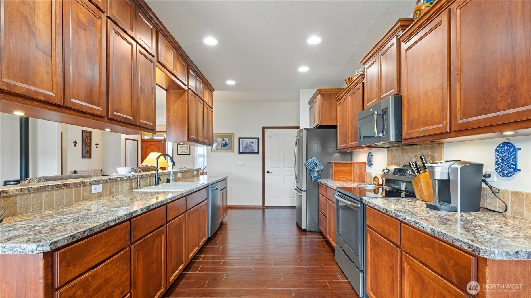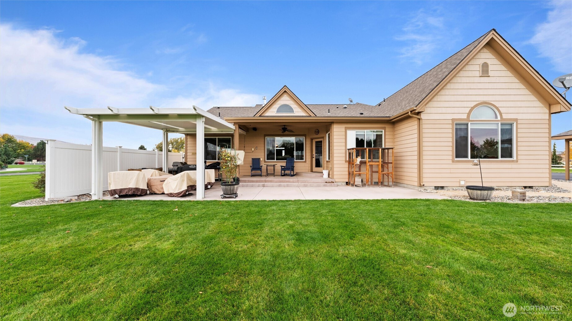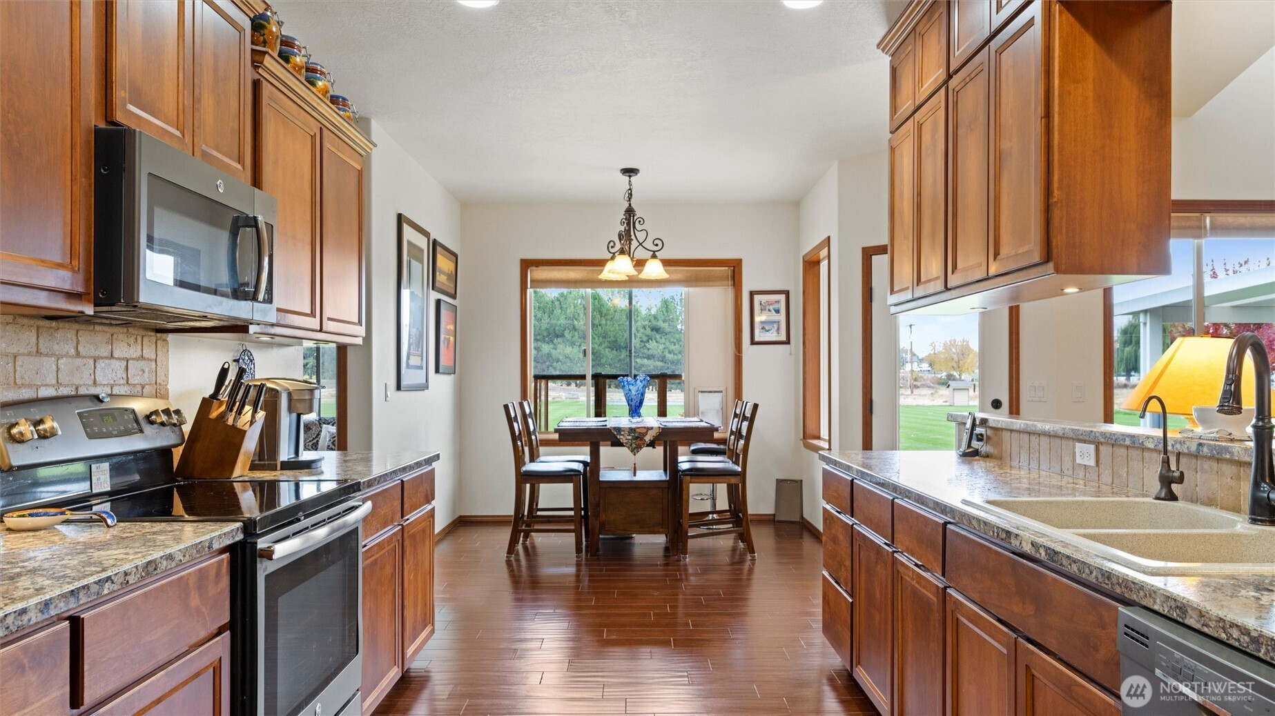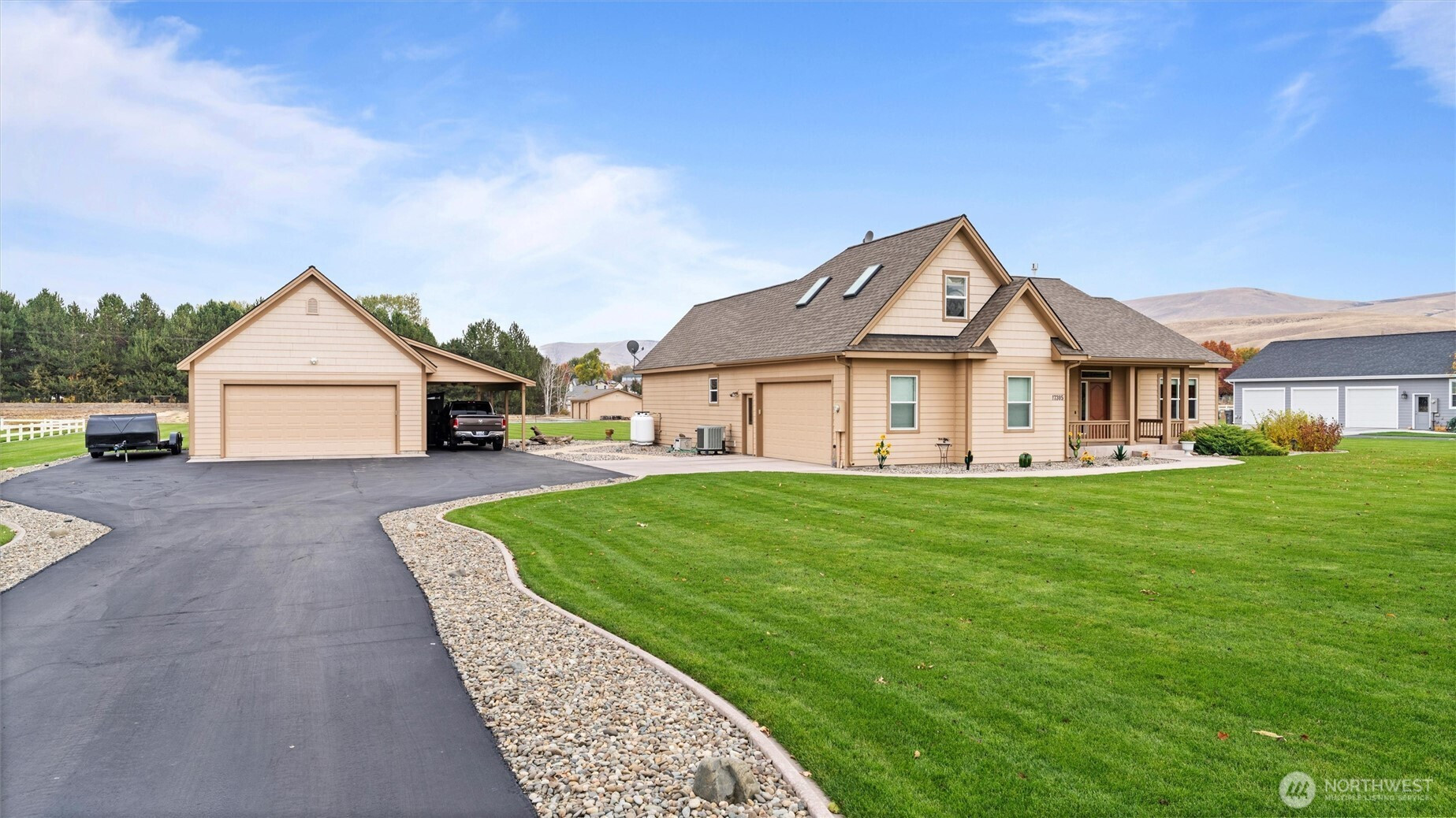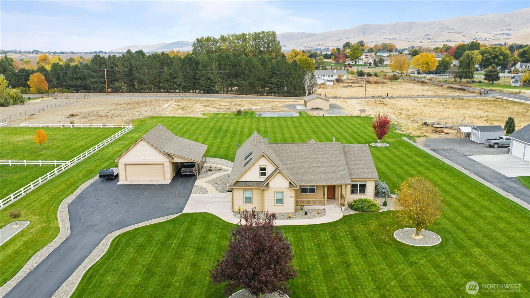 Welcome home to this beautifully maintained 2.48-acre property in one of Prosser’s most picturesque neighborhoods. This 1,882 sq. ft. home features 3 bedrooms plus a bonus room, an open-concept living area, and a formal dining space with Mt. Adams views on clear days. The kitchen boasts custom Alder cabinets with soft-close doors and full-extension drawers. Step onto the covered patio, perfect for outdoor living with hot tub hookups. The property includes an attached 2-car garage, a 24x36 heated shop with car lift and finished upstairs room, plus a second 24x30 shop with 200-amp service. RV pad, mature landscaping, organic garden space, and stunning sunsets complete this Prosser gem.