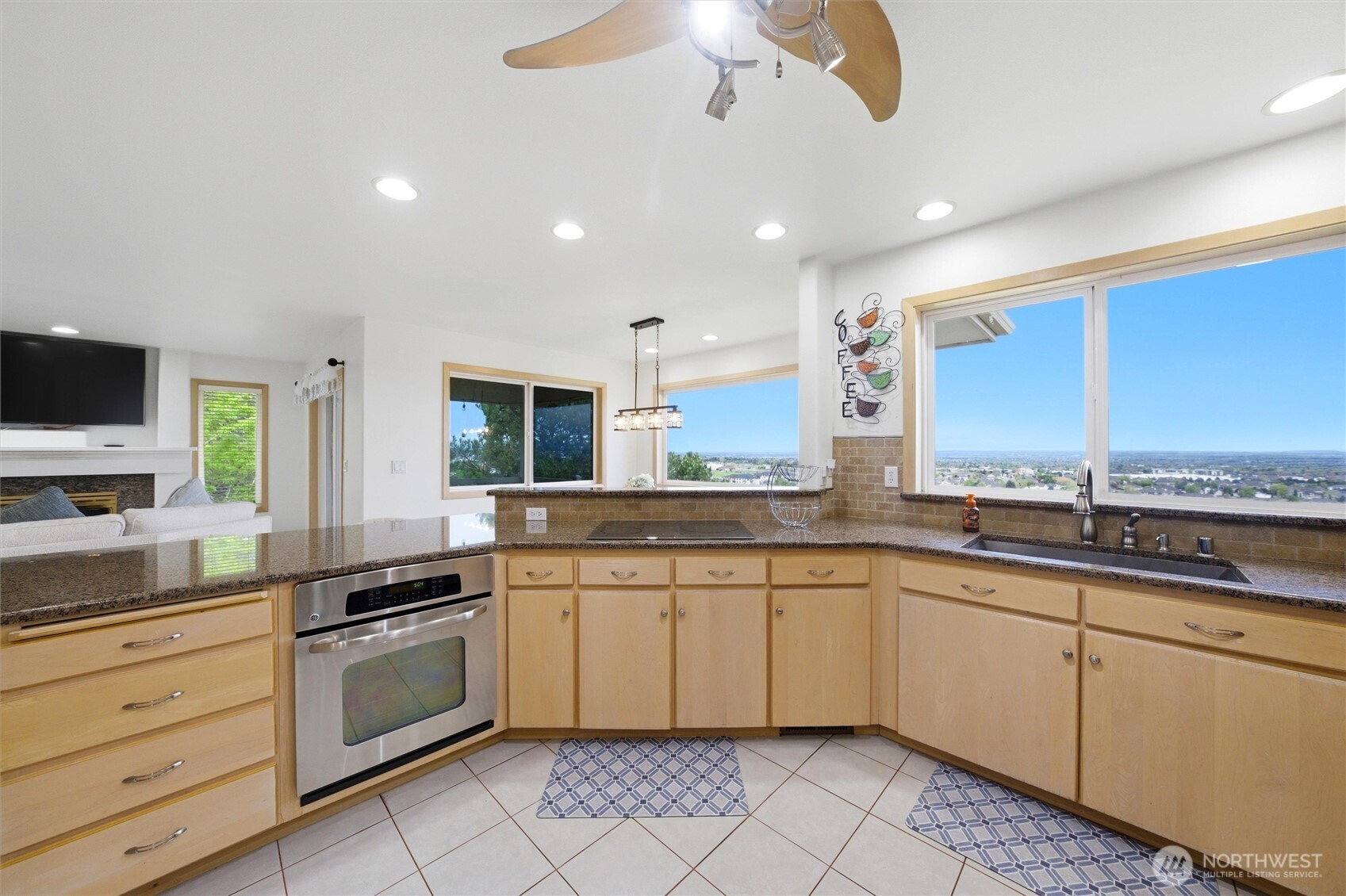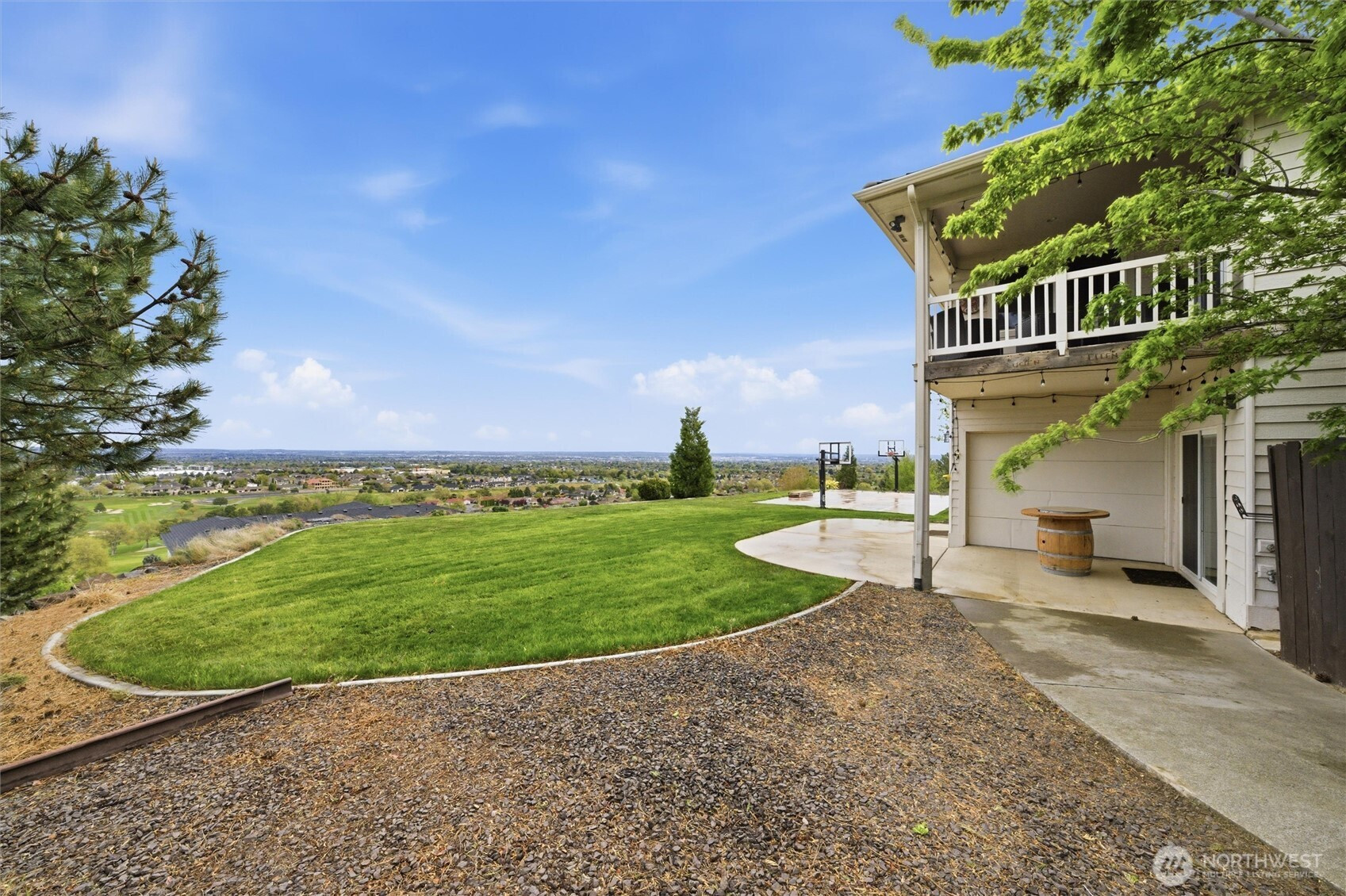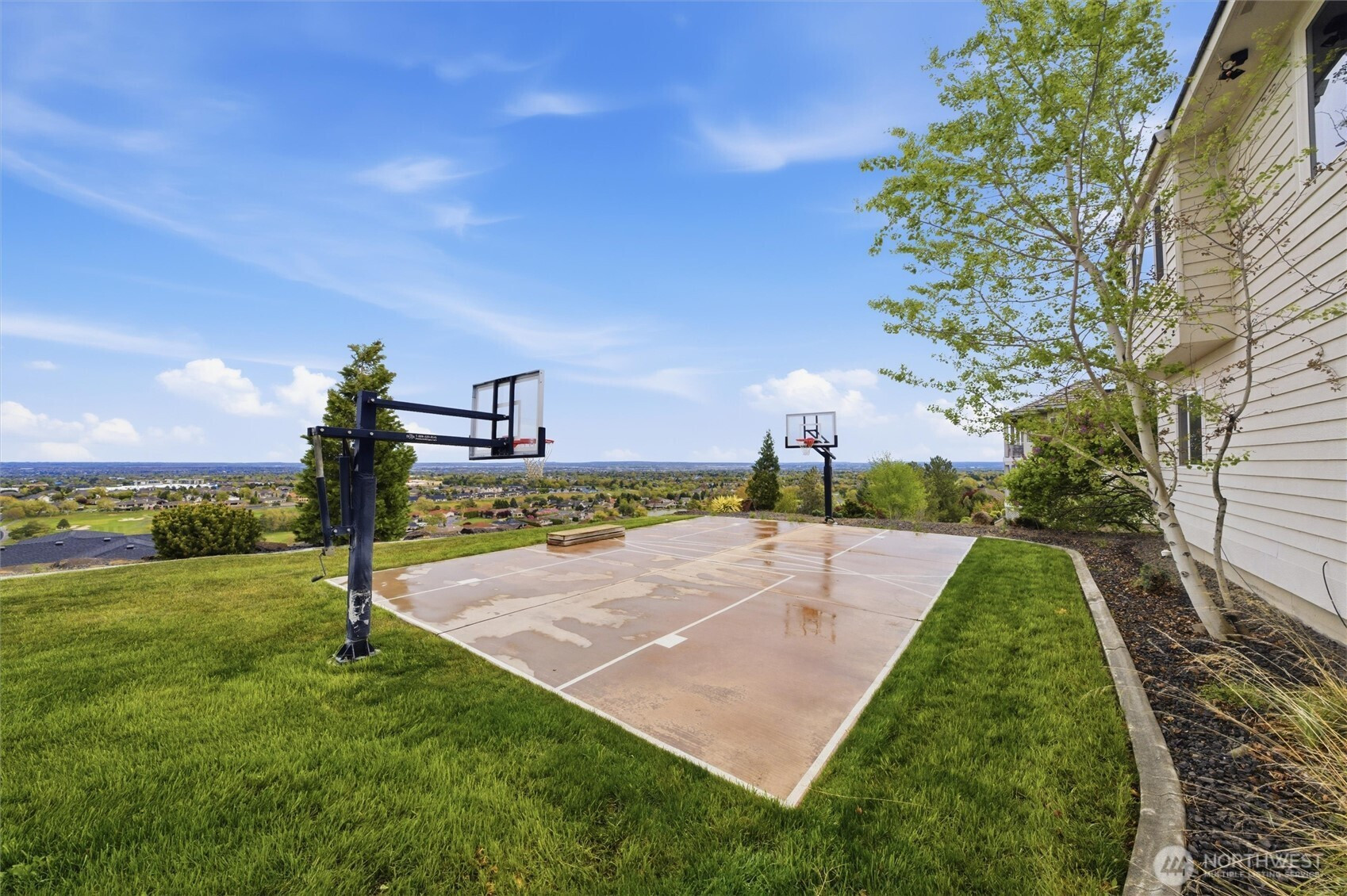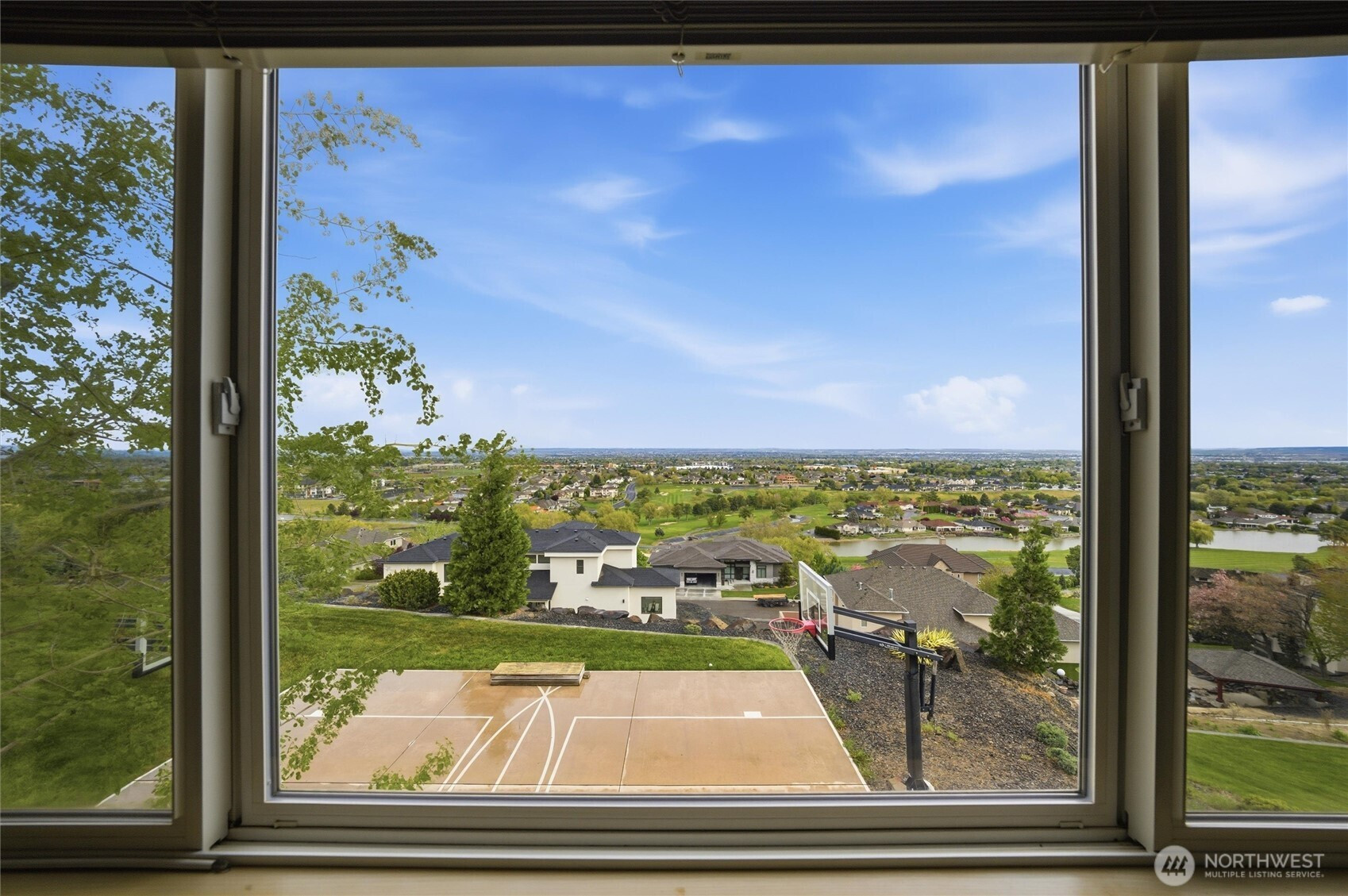 Welcome to Canyon Lakes living at its finest! Situated on a sprawling half-acre lot, this impressive 4,250 sq ft home offers breathtaking panoramic views of the golf course and city skyline—views you truly have to experience in person.Designed with both comfort and functionality in mind, this spacious residence features 5 bedrooms, 3 bathrooms, and a versatile two-level layout perfect for everyday living and entertaining. The main level showcases a well-thought-out floor plan with formal living and dining areas, a private office/den, and a warm, inviting great room that flows seamlessly into the expansive kitchen—complete with abundant countertop space and natural light pouring in from every angle.Convenience meets luxury with the primary suite and laundry room located on the main level. Downstairs, you’ll find a large family room, additional bedrooms, and plenty of space for guests, hobbies, or multi-generational living. Need storage? This home delivers with multiple storage areas throughout.Step outside and enjoy everything this property has to offer—from a private basketball court to a beautifully retained backyard designed for entertaining and soaking in the Tri-Cities sunshine. And for your golf cart toy, don’t miss the oversized lower-level golf cart garage.This move-in ready home offers the space, views, and flexibility to create your dream lifestyle in one of Kennewick’s most desirable communities.