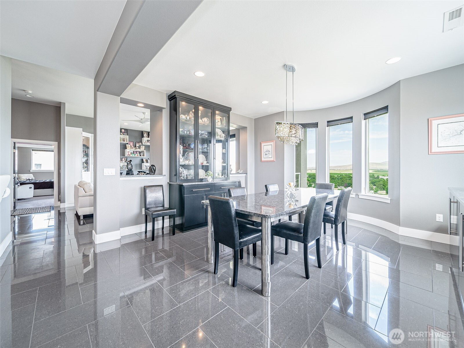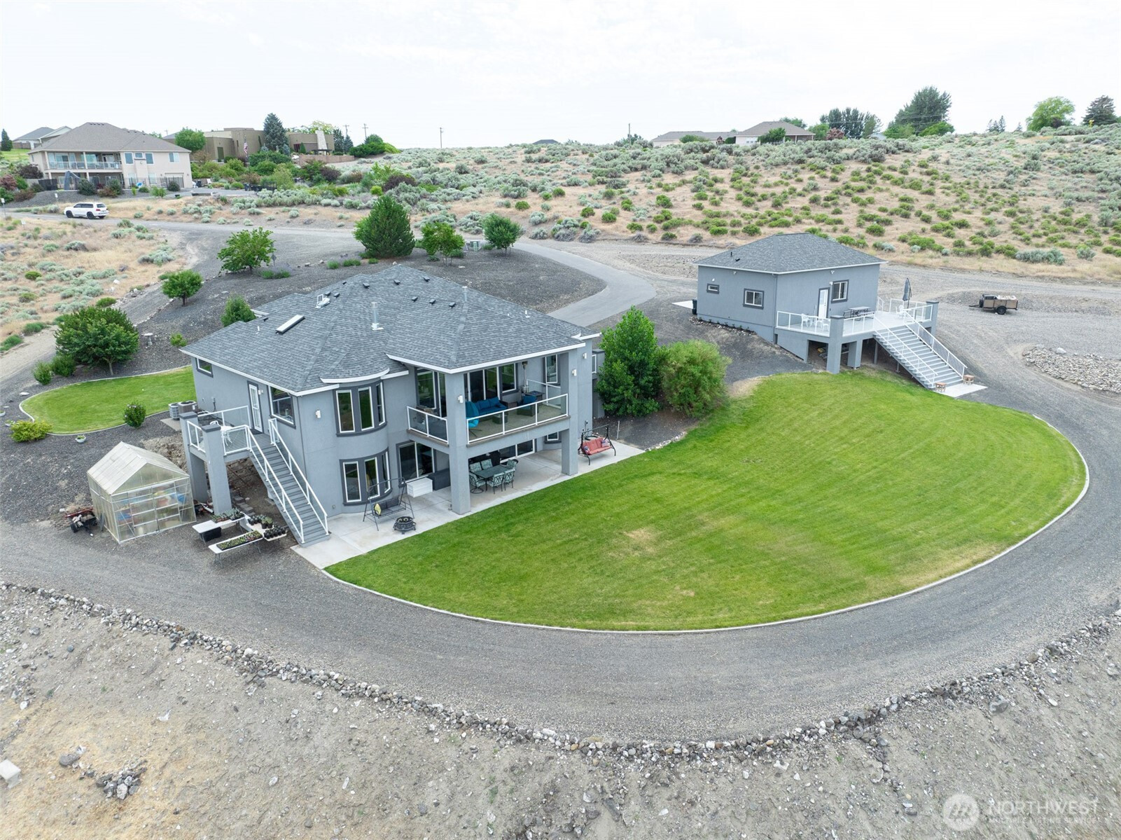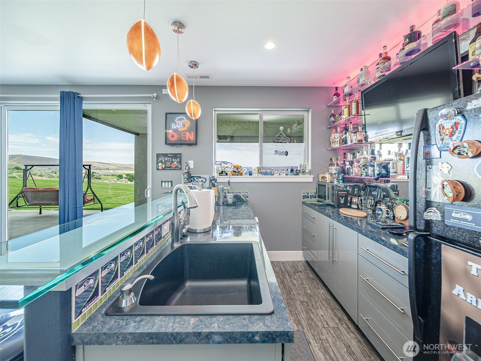 Perched on 2.5 scenic acres in the sought-after Willamette Heights neighborhood of West Richland, this exceptional custom-built home offers a one-of-a-kind living experience surrounded by a flourishing lavender farm and private vineyard of 250 Syrah vines. With breathtaking panoramic views of the Tri-Cities and Rattlesnake Mountain, every inch of this 3,450 sq ft residence is designed to impress. The thoughtfully designed 1-story layout with a fully finished walk-out basement blends modern elegance with rural tranquility. Step inside to a vaulted entryway, tile floors, and a light-filled living space anchored by a stylish fireplace and expansive windows that frame stunning natural vistas. The dining area provides an ideal setting for both everyday meals and entertaining guests while showcasing the ever-changing landscape. The kitchen is a chef’s dream featuring sleek white cabinetry, a full tile backsplash, granite countertops, a large island with breakfast bar, wine bar with beverage fridge, pantry, and stainless steel appliances including a gas range with hood. Offering 4 bedrooms and 3 luxurious bathrooms, the primary suite is a private retreat complete with a fireplace, custom lighting, spa-like bath, dual vanity, tiled walk-in shower, and a spacious custom closet. The lower level offers a large rec room with a full bar, ample space for entertaining, walk-out access to a patio, and a fourth bedroom currently outfitted as a home theater.