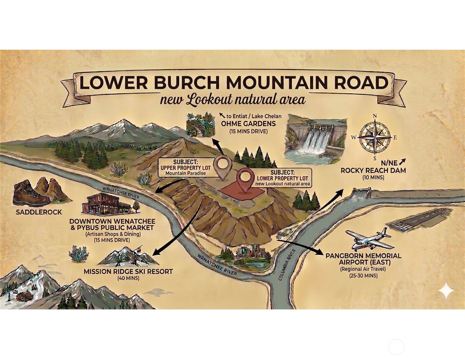 Outstanding opportunity to own a unique 20-acre parcel on desirable Burch Mountain Road with approx. 2.5 usable/buildable acres. Take in sweeping views of the Columbia River, Cascade Mountains, and Wenatchee city lights. This stunning property is surrounded by open space and pristine natural beauty, offering privacy, tranquility, and year-round outdoor recreation—just minutes from downtown. Power is available at the road, and multiple productive wells have been reported nearby. Ideal for a custom home, private retreat, or long-term investment in one of Wenatchee’s most scenic and sought-after locations. Limited lots available.