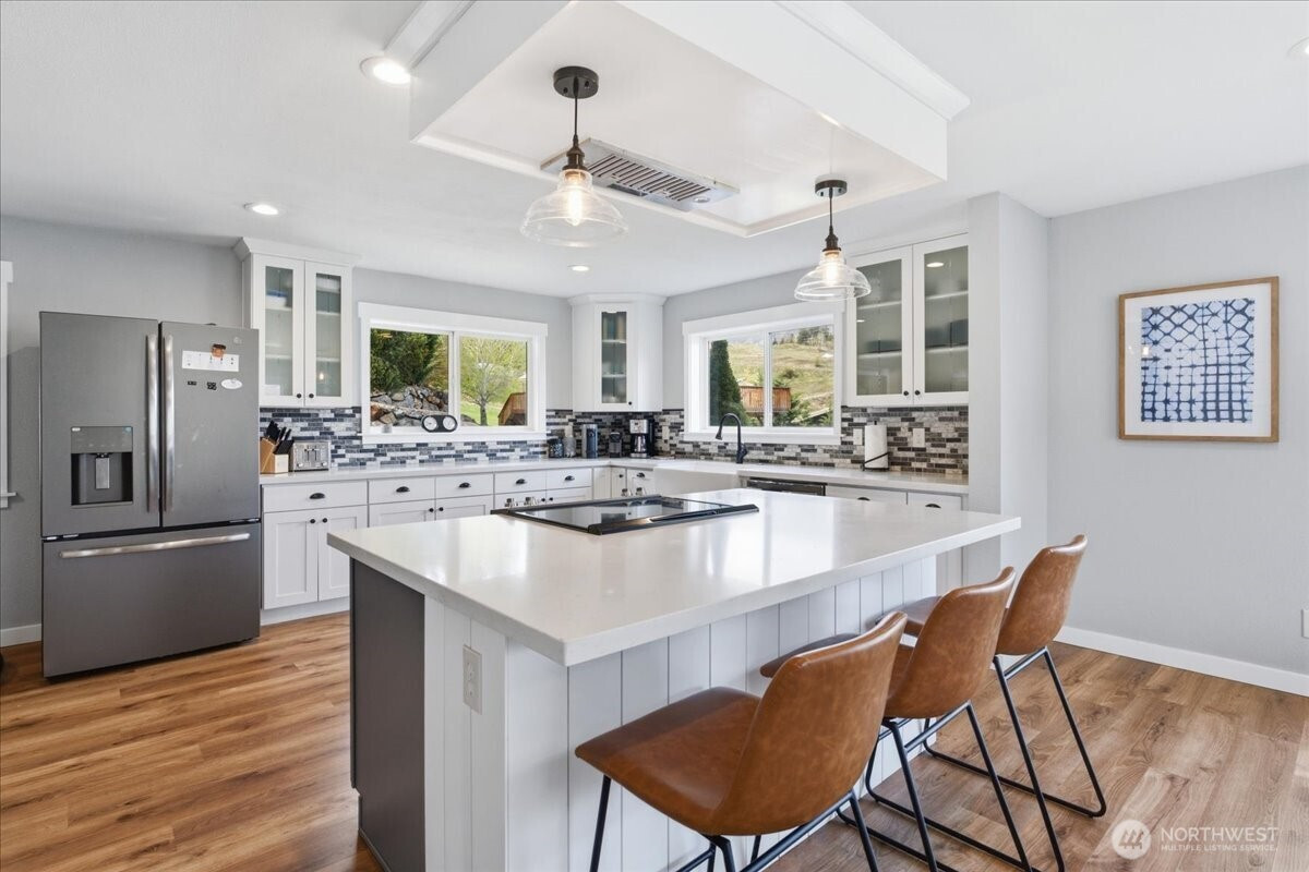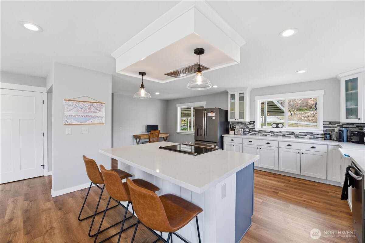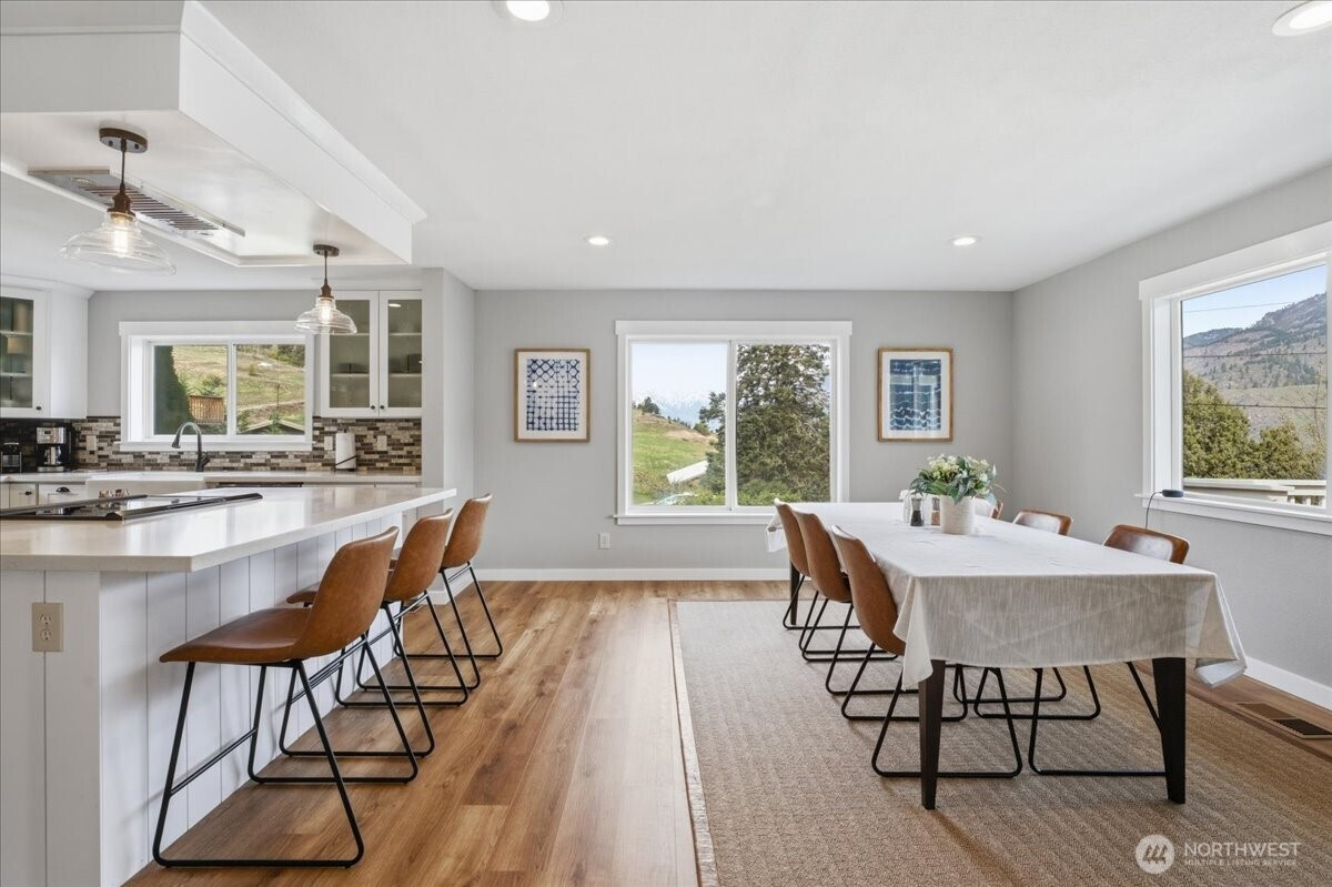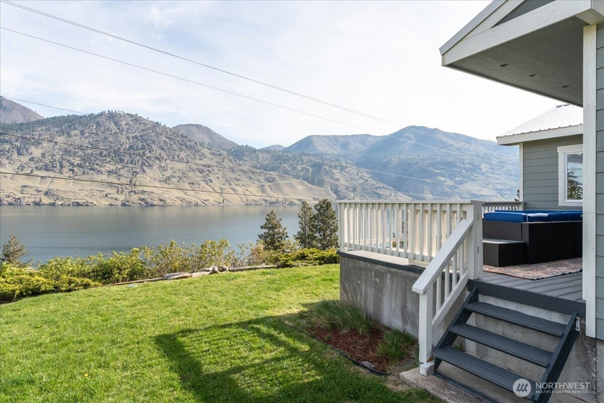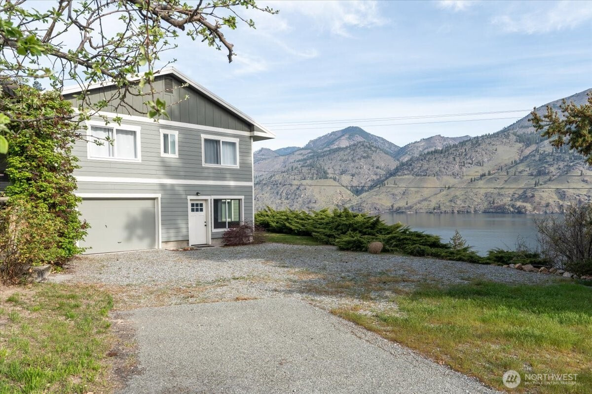 Commanding. Private. Completely reimagined. This stunning modern ranch-style daylight Rambler delivers 2,868 square feet of refined living with total remoteness and the kind of sweeping lake and Northshore territorial mountain views that stop you in your tracks. Fully renovated in 2021, the home presents like new throughout. The bright, airy kitchen is an entertainer's dream — white cabinetry, quartz countertops, farmhouse hardware, warm LVP flooring, and an oversized island with seating for guests. Stainless steel appliances complete the picture. The open-concept great room flows from a generous dining area into a cozy lake-view living room where every vantage point frames the water. The primary en-suite wing offers a clean, beautifully appointed retreat. Across the home, a guest bedroom and full bath provide comfortable separation for visitors. A dedicated laundry and mud room add everyday practicality. Downstairs, the daylight lower level is built for gathering — a sprawling rec room, third bedroom, and a custom bunkroom sleeping four make this home ideal for full-time owners, vacation rentals, or multigenerational living. Step directly across the street to your community waterfront — then continue just steps further to 25 Mile Creek State Park, public boat launch, and marina. This is Lake Chelan living at its most complete.