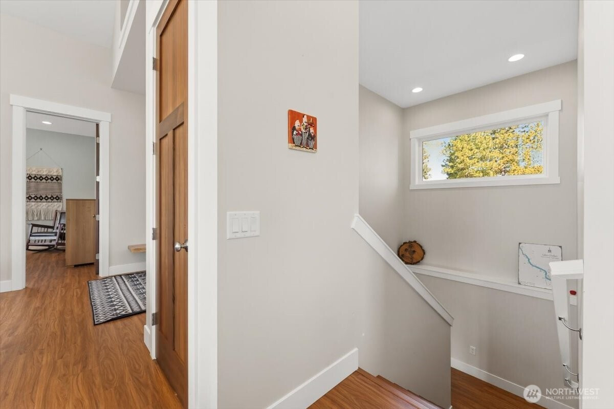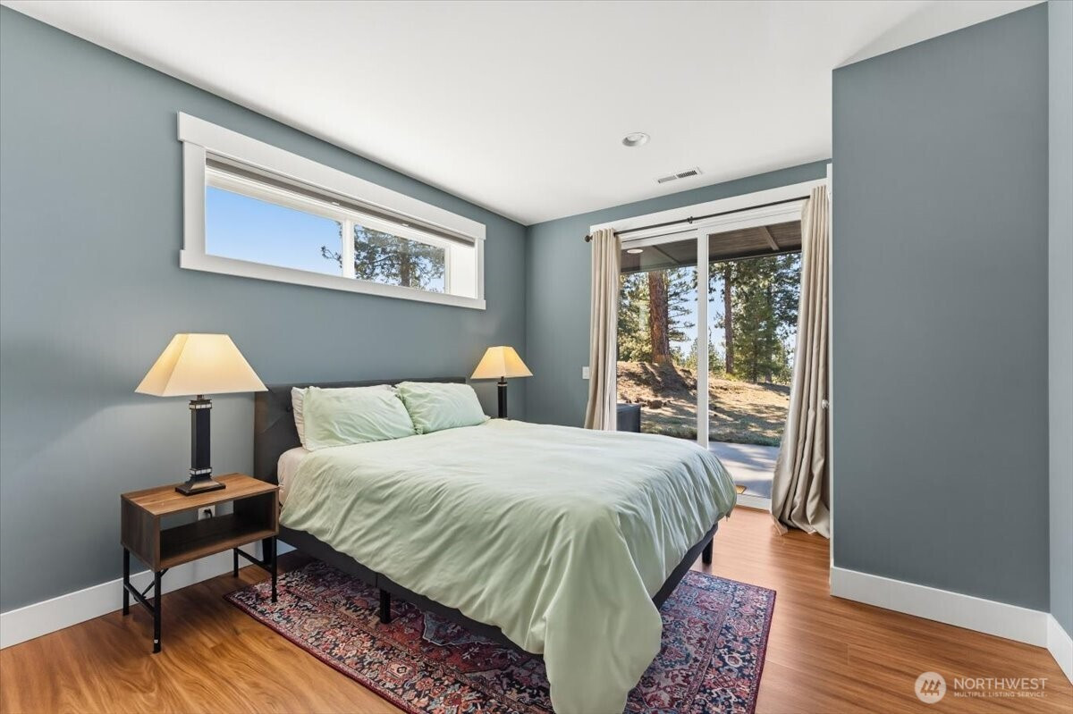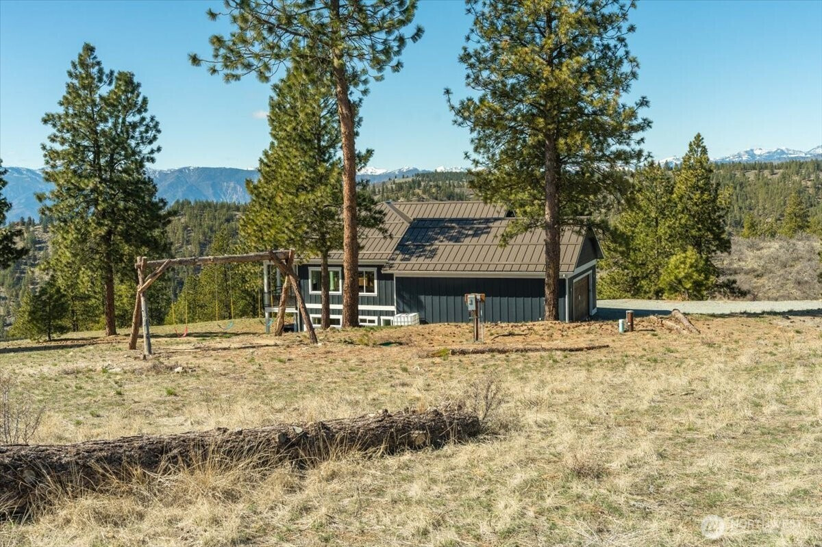 Escape to your own alpine sanctuary. This custom modern daylight rambler, completed in 2021, is tucked into 20 southwest-facing acres of pine-filled privacy in Chelan Vista Heights — where the mountains meet the lake, and the rest of the world fades away. This turnkey 4-bedroom, 3-bathroom, 2,992-square-foot retreat unfolds around a soaring cathedral great room, anchored by a floor-to-ceiling stone-veneer fireplace, framed by trapezoidal windows that pull commanding Lake Chelan and Butte views deep into the living space. Covered decks on both levels beckon you outdoors for alfresco dining as the sun melts into the ridge line. The main-floor primary ensuite offers a beautifully tiled shower sanctuary; the daylight lower level hosts a spacious living room, three generous bedrooms, and a bunk room ready for a full house of guests. Every detail was built to endure: standing-seam metal roof, cement board siding, above-code insulation, 400-amp electrical, PEX plumbing, dual 1,500-gallon septic tanks, and a rare ~9 GPM well with 1,700-gallon storage. Solid fir doors, plywood white & slow-closed cabinetry, sound-insulated bedrooms, and a hidden under-stair playroom complete the experience. Fully furnished and ready. Your mountain retreat awaits.
