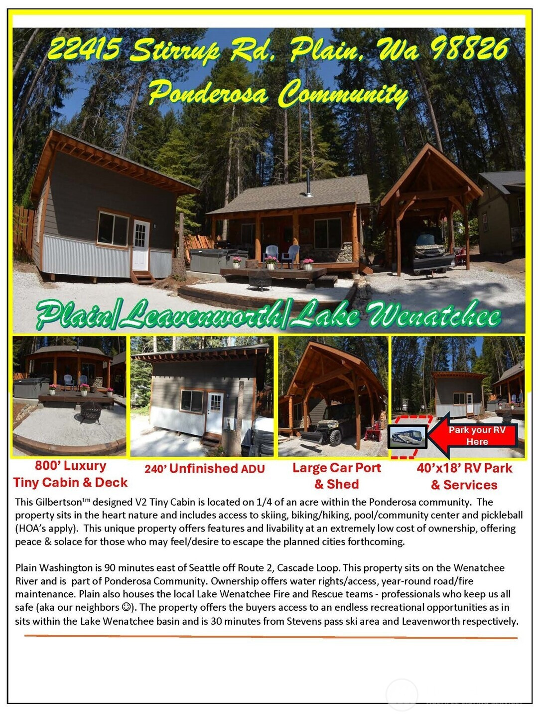 Elegant. log accented, 520 sf cabin w/loft, live edge window and door dressing, blue pine interior, on ΒΌ acre in the Ponderosa community of Plain, Washington. Built in 2023, this get-a-way has a number of features listed in the 2 page flyer found among the photos. This is a ready to use retreat complete with deck and fire-pit, granite countertops, sports jacuzzi, and rough wired and plumbed 300 sf detached building ready for you to finish into an ADU, or shop, or studio, or gym. Within just 30 minutes of Stevens Pass, Leavenworth, or Lake Wenatchee. Make your appointment now to view this woodland masterpiece.