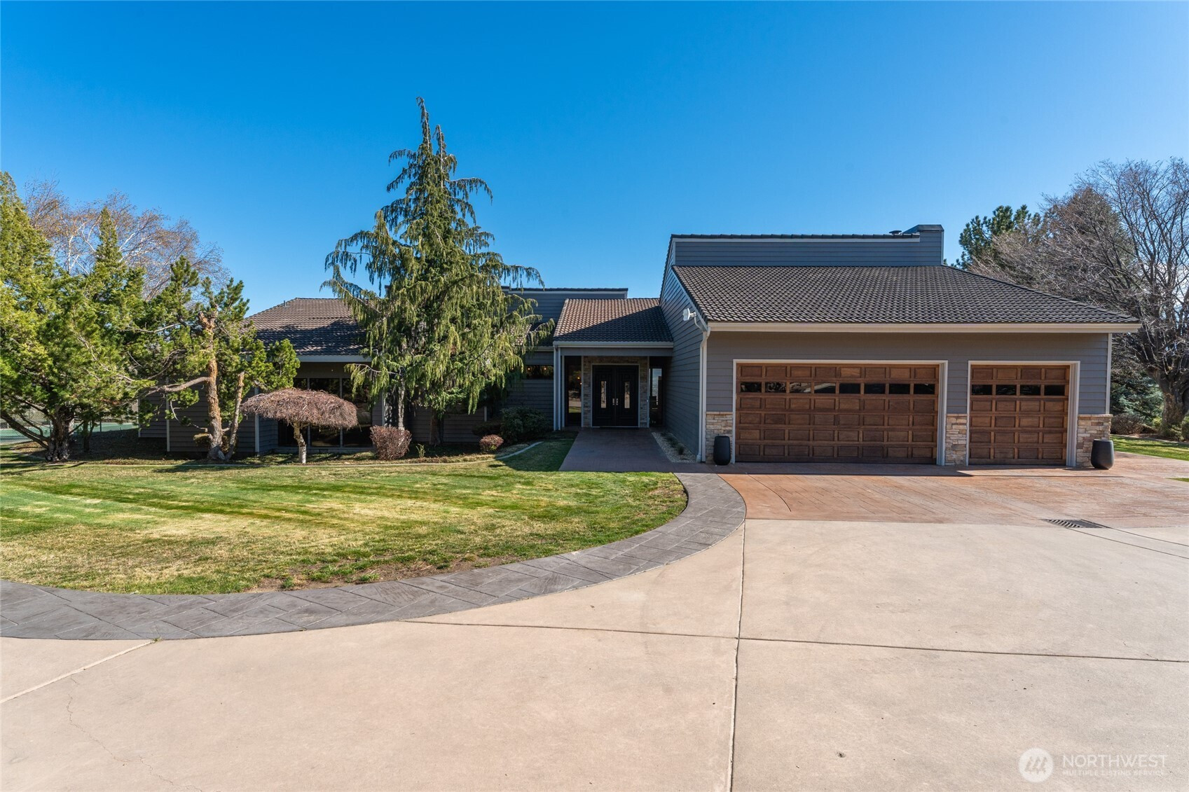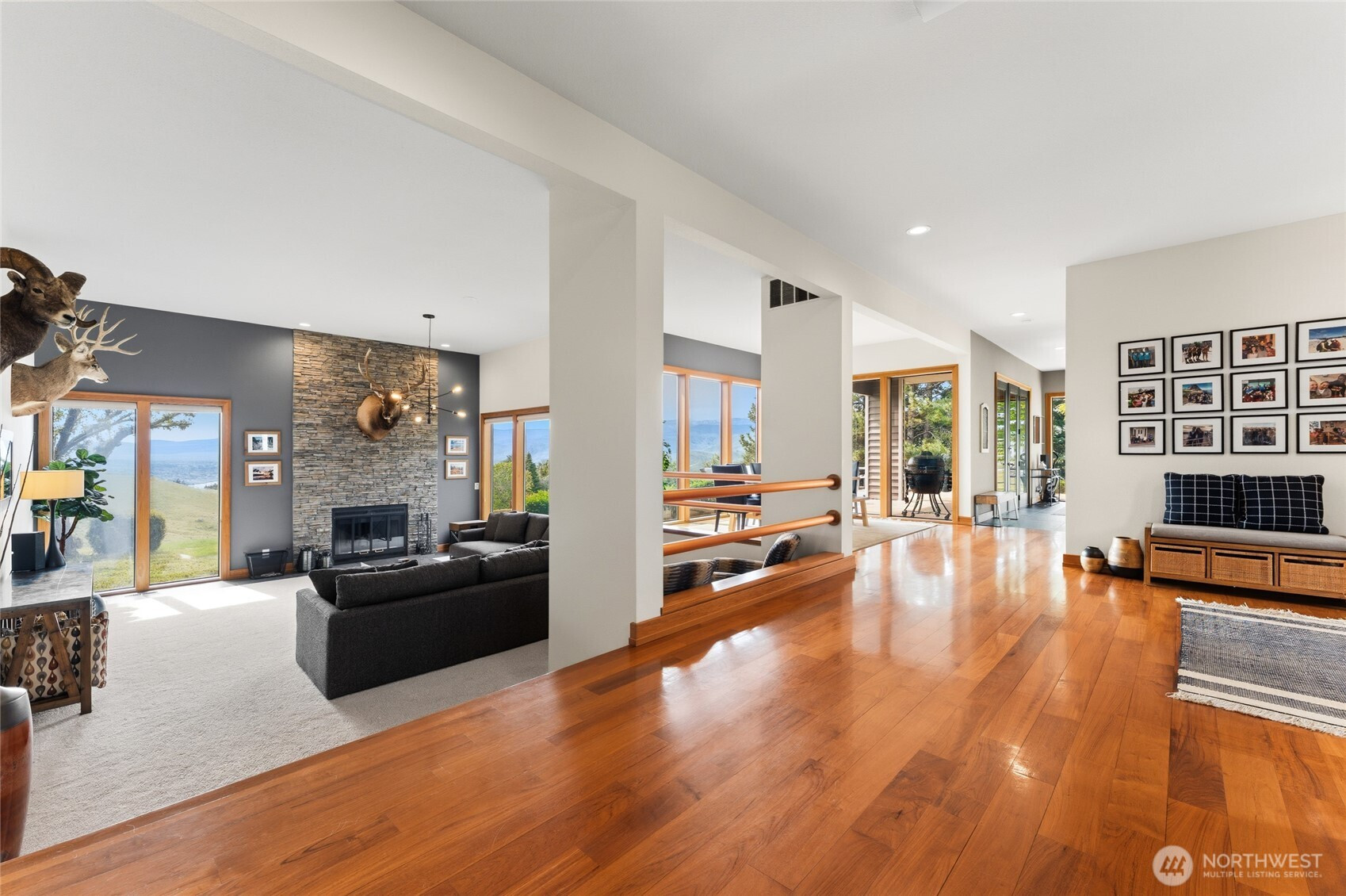Set on 2.7 private acres, this sprawling rambler is paired with a second home on its own parcel—offering incredible flexibility and sweeping mountain, river, and valley views. The additional residence is ideal as an ADU or income-producing rental, making this a rare opportunity for multi-generational living or added revenue. The custom-designed main home is rich with thoughtful details, featuring stunning teak floors, trim, doors, and cabinetry throughout. A welcoming entry opens to wide walk-ways that lead into a sunken living room with soaring ceilings and a dramatic floor-to-ceiling rock fireplace. The updated kitchen is both stylish & functional, complete with stainless steel appliances and modern finishes. Just off the kitchen, is a cozy family room that offers a wood-burning fireplace & beautiful imported Italian tile floors. The spacious primary suite is a true retreat, highlighted by expansive floor-to-ceiling windows that capture the surrounding views and fill the room with natural light. It also includes an oversized walk-in closet with custom wood built-ins and a well-appointed bath featuring a soaking tub and walk-in shower. Outdoor living is just as impressive, w/a fenced sports or pickleball court & a covered patio off the family room—perfect for entertaining or relaxing in the peaceful setting. The property is also well-suited for horses, complete with a fully fenced pasture and loafing barn. Main home is 3878 sq ft 1.36 acres & 2nd home is 991 sq ft/1.34 acres