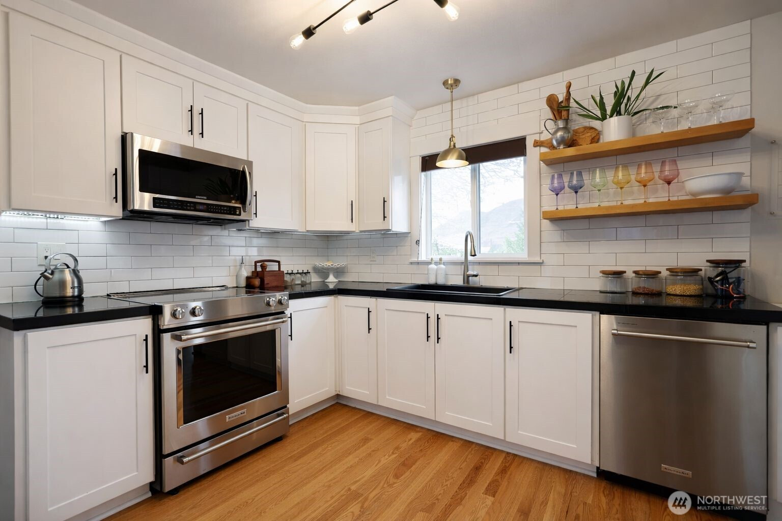 Charming remodeled mid-century home perfectly situated on an oversized corner lot totaling 2.5 lots of record in the heart of downtown Lake Chelan. The bright and inviting great room welcomes you with a cozy wood-burning fireplace and beautifully refinished original hardwood floors. The reimagined kitchen features new stainless steel appliances, updated cabinetry with hardware, new hardwood floors, and efficient counter space for everyday living. Two main-floor bedrooms are separated by a gorgeous full bath with granite counters and a subway-tile tub surround. Downstairs, the lower level offers exceptional versatility — a third bedroom, a den/office, a ¾ bath, a separate living room anchored by a second fireplace, a renovated laundry room, and a custom wine bar complete with a wine fridge. Whether hosting guests or carving out space of your own, the lower level delivers. Outside, enjoy a fully fenced yard, automatic sprinklers, a mature lawn, raised garden beds, and stunning upfront views of the Lake Chelan Butte. The detached 1-car garage with EV charging sits conveniently on N Columbia Ave for easy access. Enjoy a 10+ walkability score just 2 blocks from downtown shops, restaurants, and lake access. The generous lot supports up to 4 ADUs/DADUs per HB 1337 — a rare investment opportunity. Buyer to verify.