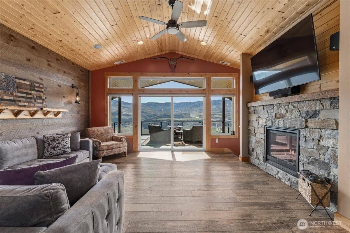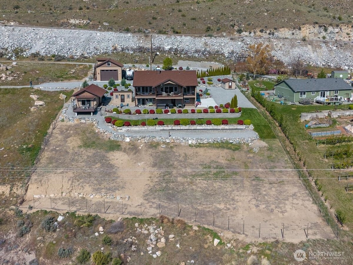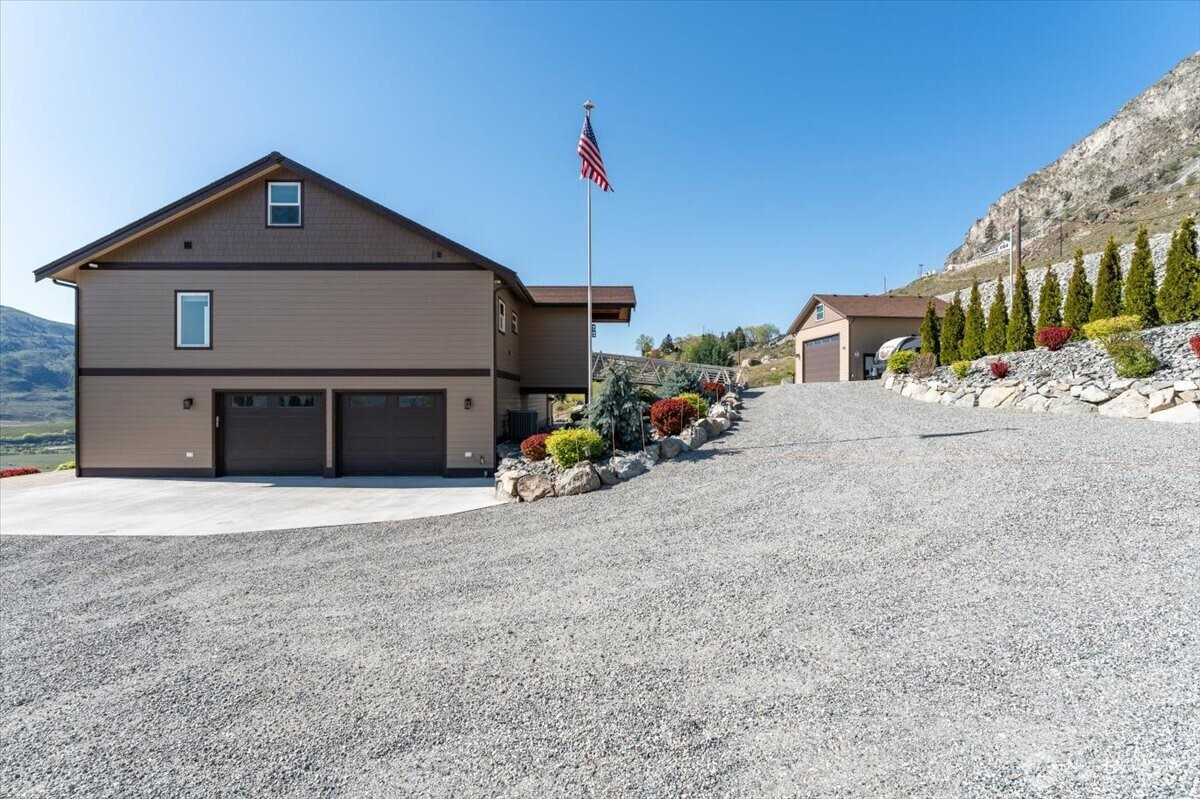 Enjoy breathtaking Columbia River & mountain views from this beautiful estate on over an acre just minutes from downtown Chelan! Perched on a meticulously landscaped property featuring terraced walls, a manicured lawn, & gorgeous plantings that provide vibrant, year-round color & privacy. The massive paver patio w/ hot tub, & 650sqft covered Timber Tech deck w/ sleek steel & glass railings, are perfect for outdoor living, dining, & entertaining. Inside, the main home is filled w/ natural light & showcases vaulted pine ceilings, stone fireplace, & a custom barn wood accent wall. The kitchen is both stylish & functional w/ knotty alder cabinetry, granite countertops, tile backsplash, under-cabinet lighting, & large island. The main level includes a spacious primary suite w/ walk-in closet, & primary bath w/ radiant heated tile floors & a custom glass shower, plus a 2nd bedroom & bath, both bedrooms w/ direct access to the view deck. The lower level adds flexibility w/ a bonus room(or 3rd bedroom), 1/2 bath, & access to the private covered patio & hot tub. A detached 1 bed/1 bath ADU w/ kitchen & private deck offers excellent guest accommodations or rental potential. An attached 2-car garage, detached shop w/ oversized doors & loft storage, Home plus ADU, & cabana & storage shed, make this is an exceptional value combining comfort, versatility, beautiful views & scenery! 5 matching structures in total, 2,868sqft overall living space, & over 1,400sqft of garage space!