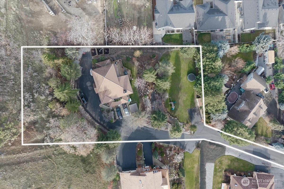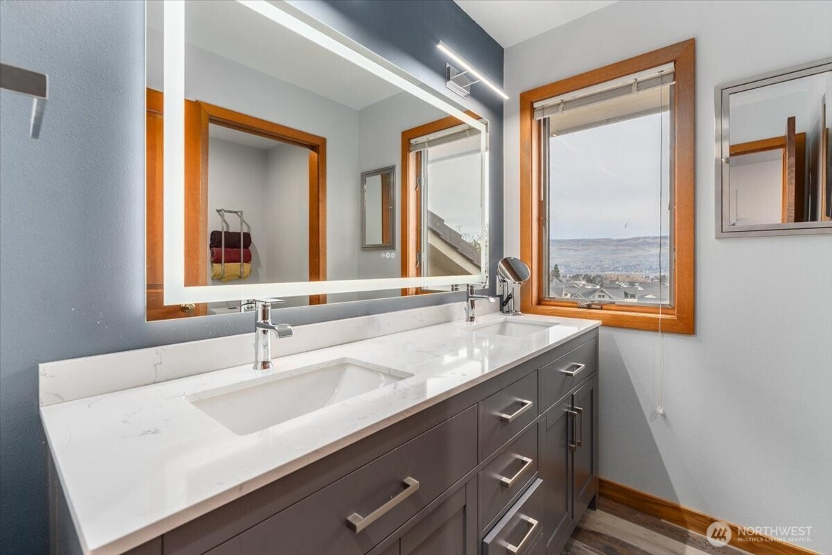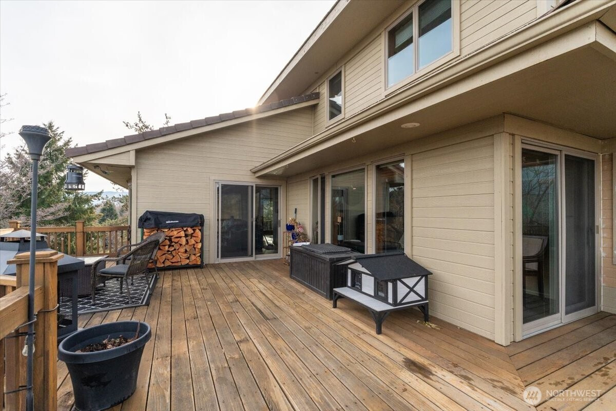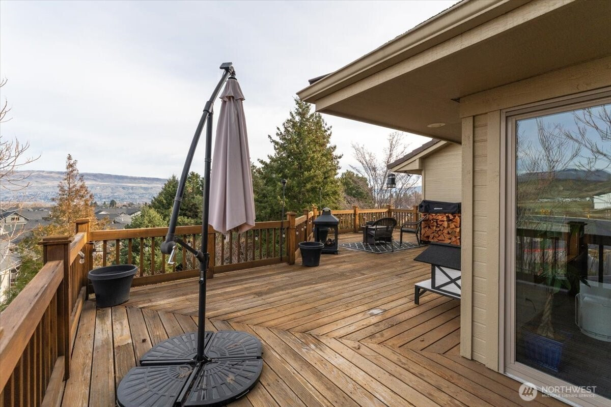 Tucked at the end of a quiet cul-de-sac, this custom 5-bedroom, 3-bath, 1.5-story home with a daylight basement offers refined comfort, thoughtful updates, and sweeping mountain and city views. The versatile layout includes main-floor bedrooms, additional bedrooms and bath upstairs, a light-filled main living area, and a spacious family room in the daylight basement—ideal for flexible living and entertaining. Over the last two years, the home has seen significant upgrades, including three of four beautifully remodeled baths. The main-floor primary suite is generously sized and features deck access, serene views, and a spa-inspired bath with heated floors. The kitchen blends classic charm with modern updates, offering granite countertops, counter-to-ceiling stone backsplash, and stainless steel appliances, all included. Andersen wood-wrapped windows bring in abundant natural light throughout. Nearly $60,000 in recent landscaping enhances the just-under-an-acre lot, which offers potential to divide or add additional dwellings. Elevated above the surroundings, the home enjoys a private, treehouse-like setting with timeless appeal.