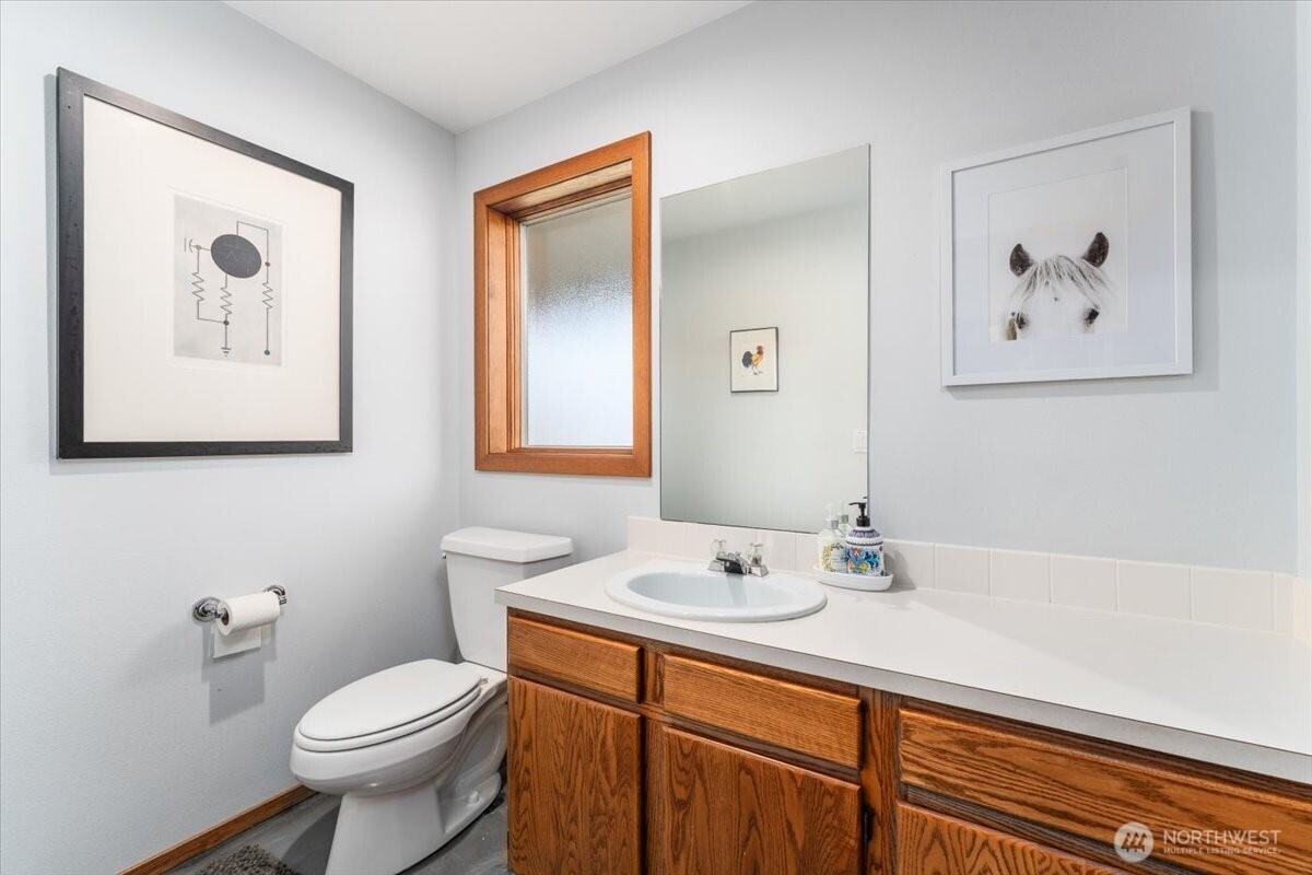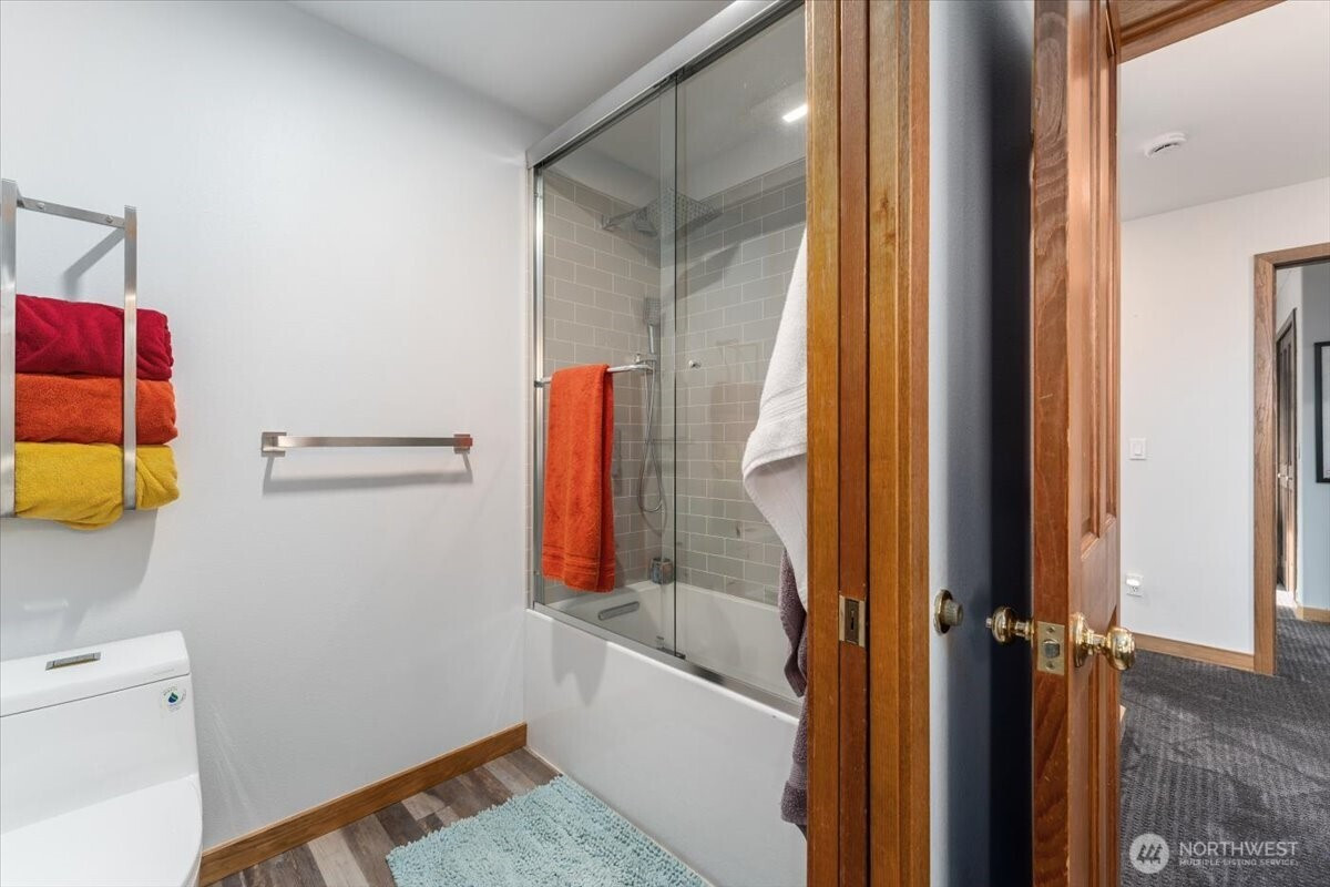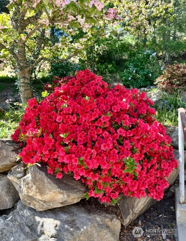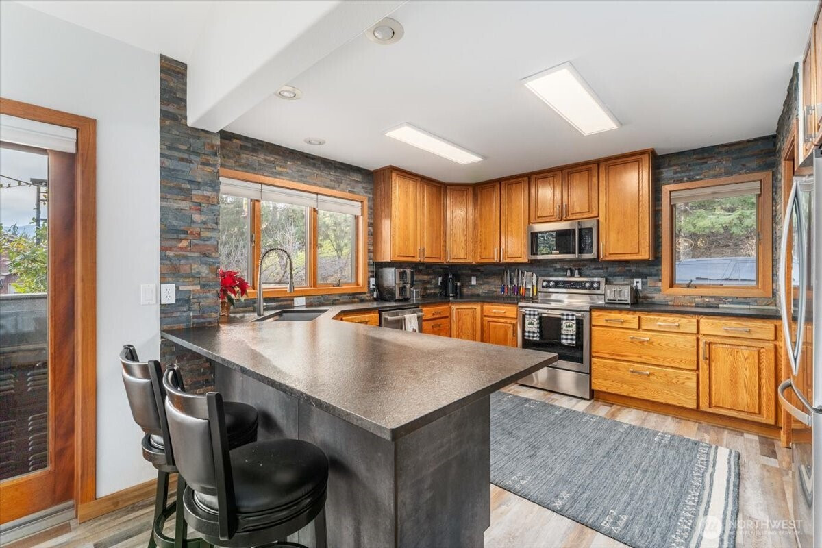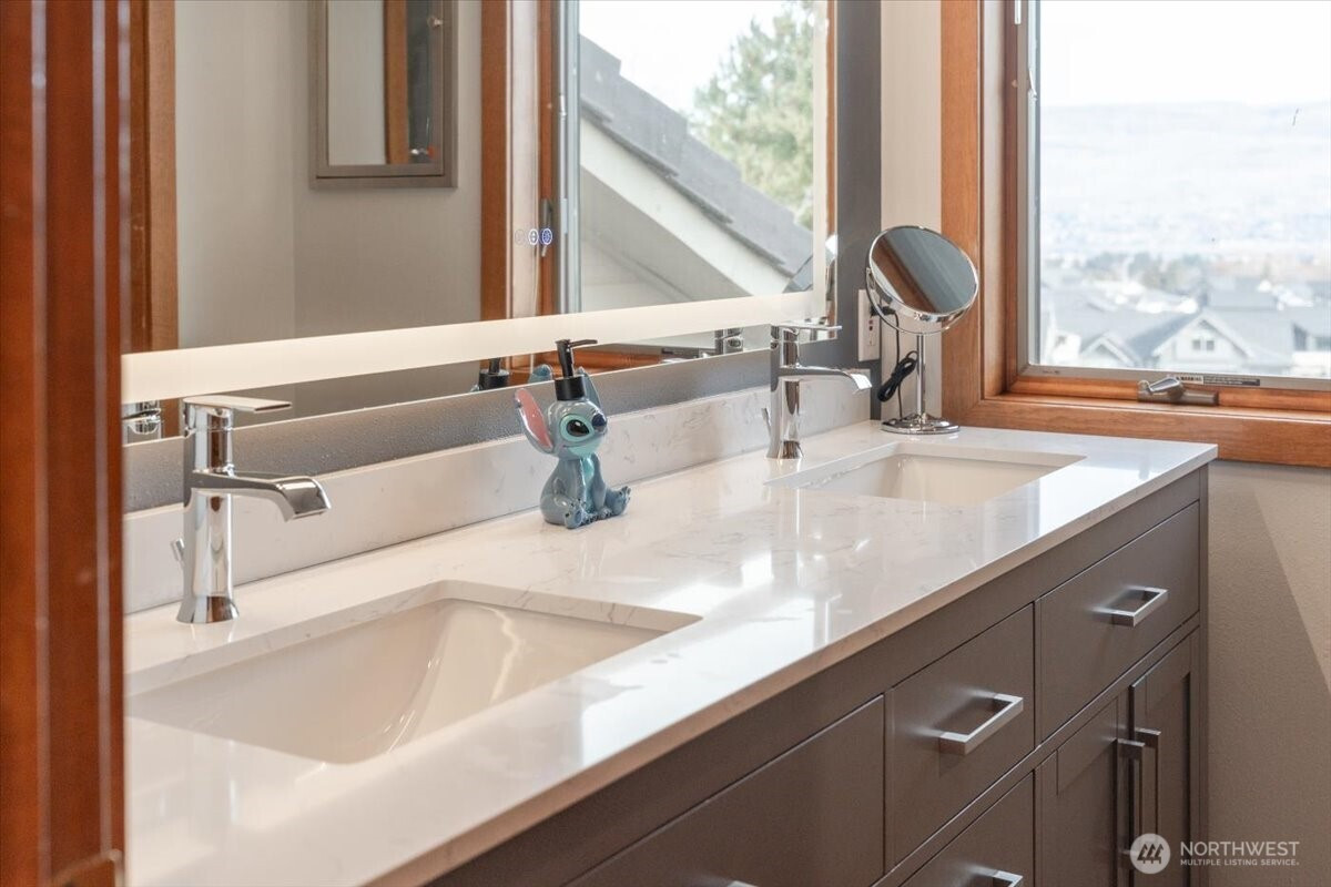 Tucked at the end of a quiet cul-de-sac, this custom 5-bedroom, 3-bath, 1.5-story home with a daylight basement offers refined comfort, thoughtful updates, and sweeping mountain and city views. The versatile layout includes main-floor bedrooms, additional bedrooms and bath upstairs, a light-filled main living area, and a spacious family room in the daylight basement—ideal for flexible living and entertaining. Over the last two years, the home has seen significant upgrades, including three of four beautifully remodeled baths. The main-floor primary suite is generously sized and features deck access, serene views, and a spa-inspired bath with heated floors. The kitchen blends classic charm with modern updates, offering granite countertops, counter-to-ceiling stone backsplash, and stainless steel appliances, all included. Andersen wood-wrapped windows bring in abundant natural light throughout. Nearly $60,000 in recent landscaping enhances the just-under-an-acre lot, which offers potential to divide or add additional dwellings. Elevated above the surroundings, the home enjoys a private, treehouse-like setting with timeless appeal.