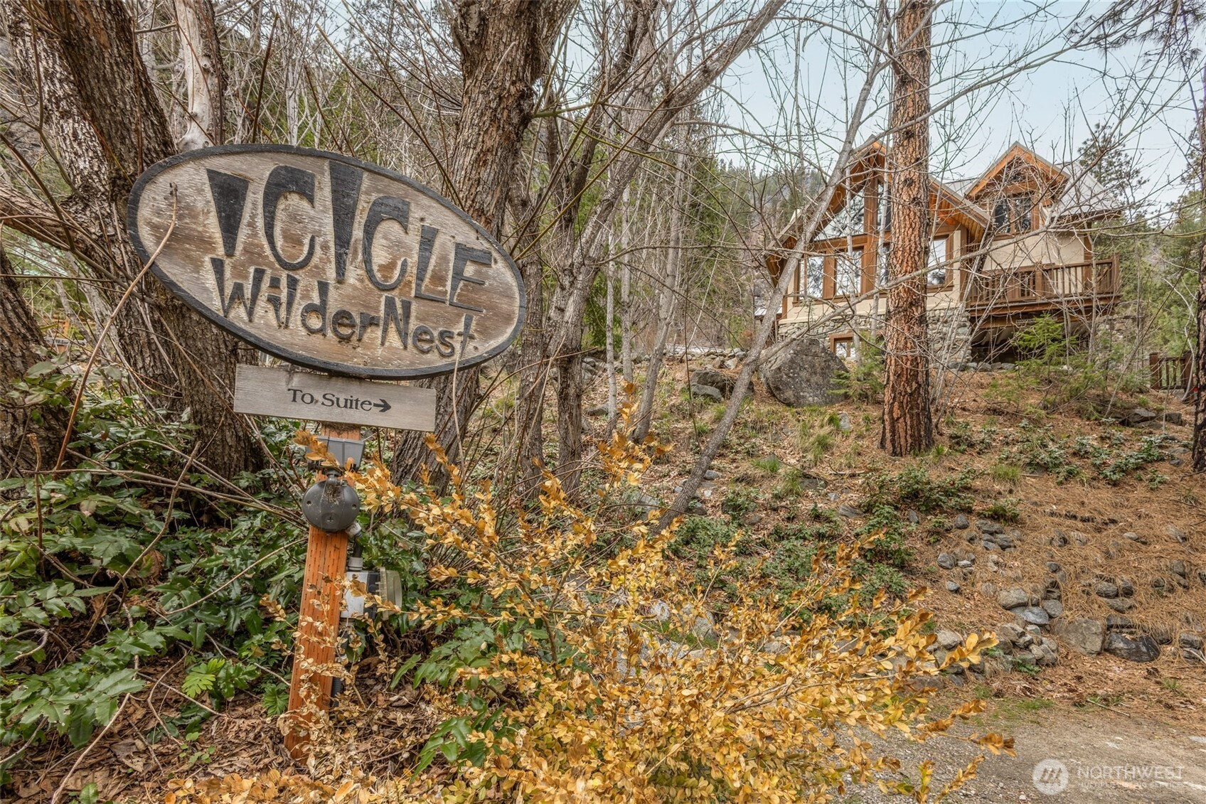 Offered for the first time, this custom timber-frame retreat nestled in the awe-inspiring Icicle Canyon provides recreational enthusiasts with a truly unique mountain escape. Hand-hewn beams, SIP-insulated panels, rich fir woodwork, and stunning river rock accents create a warm, rustic elegance throughout the home.The vaulted open living space is filled with natural light, while the treehouse-inspired upper bedroom adds a sense of charm and adventure. A cozy loft office overlooks the main living area, offering the perfect workspace surrounded by nature.Multiple outdoor patio areas invite you to relax and take in the surroundings, while the lower-level bedroom suite—with its own private entrance—offers flexibility for guests or extended stays.Enjoy the sights and sounds of the mighty Icicle River just across the street, along with direct access to world-class rock climbing and endless outdoor recreation. With lovely south-facing exposure and a rare two-lot offering, this property is a truly special opportunity in one of the Pacific Northwest’s most spectacular settings.