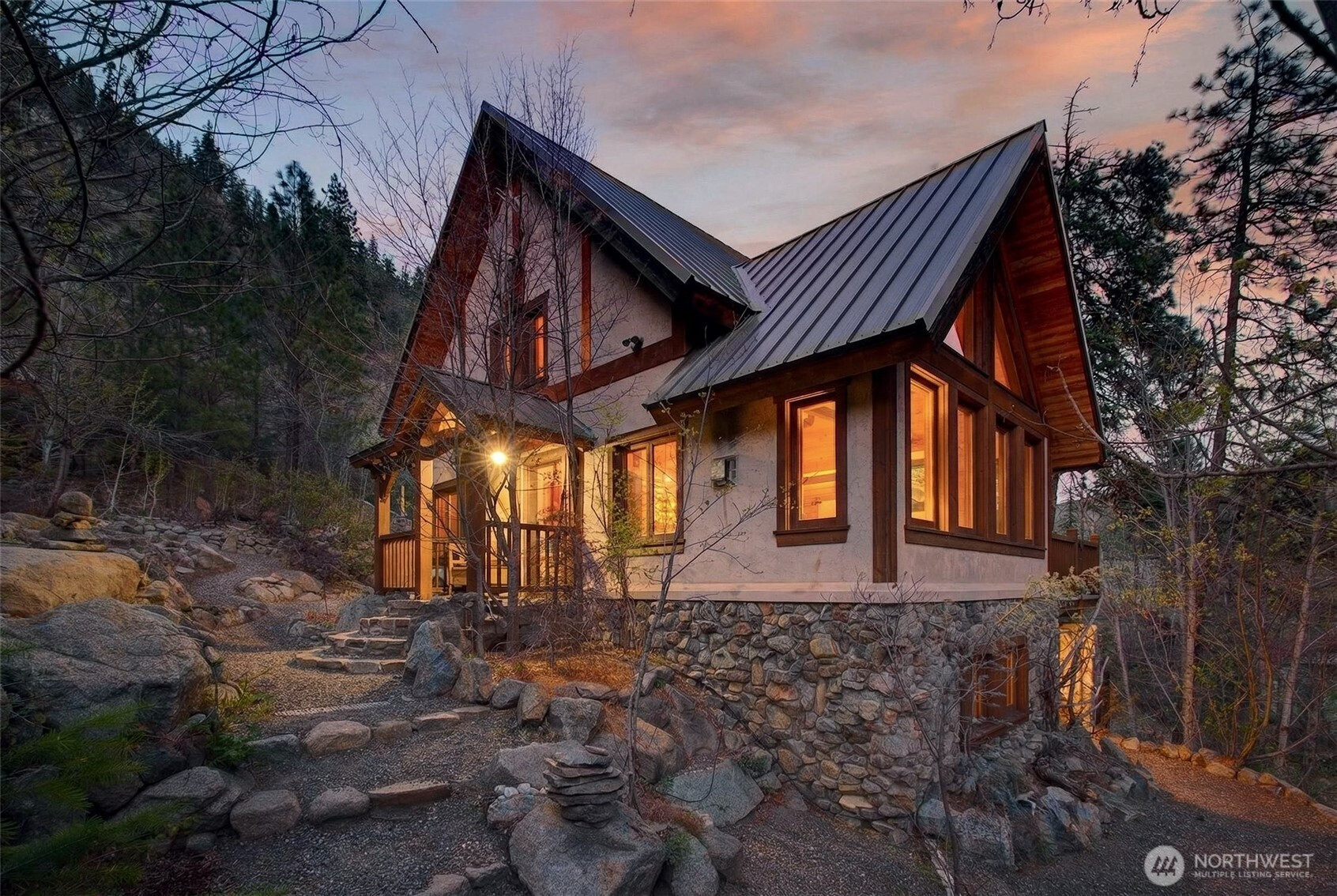 Offered for the first time, this custom timber-frame retreat in awe-inspiring Icicle Canyon presents a truly special opportunity in one of the region’s most coveted recreational settings. Inside, hand-hewn beams, SIP-insulated panels, rich fir woodwork, and striking river rock accents create a warm, rustic elegance throughout. The vaulted open living space is filled with natural light, while the charming upper-level bedroom offers a treehouse-inspired feel. A cozy loft office overlooks the main living area, and the lower-level bedroom suite with private entry provides excellent flexibility for guests or extended stays. Multiple patio areas invite you to relax and enjoy the setting, while the mighty Icicle River sits just across the street. With sunny south-facing exposure and immediate access to world-class rock climbing, hiking, and endless outdoor recreation, this is a truly distinctive mountain offering in one of Leavenworth’s most spectacular settings.