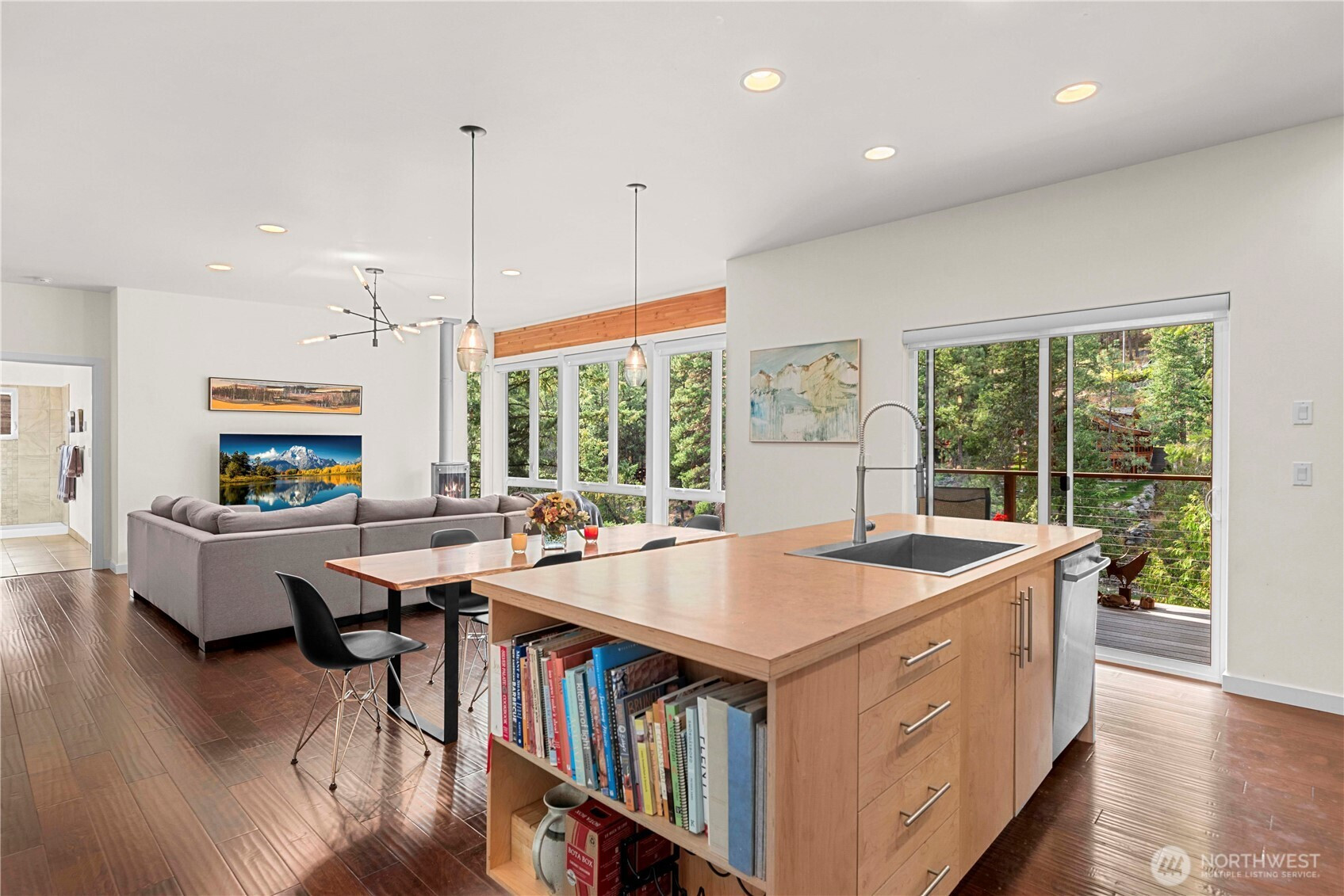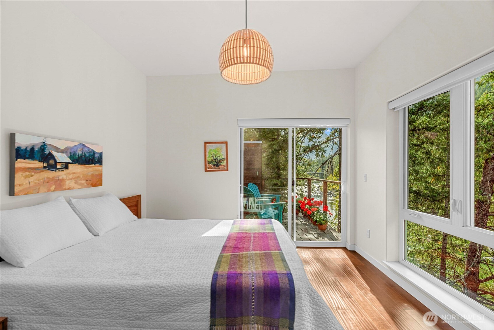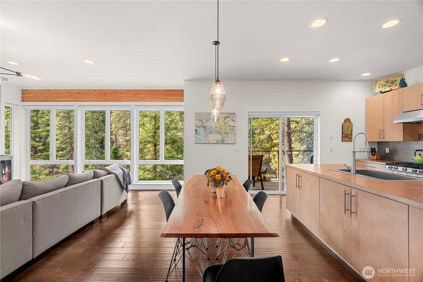 Set in one of Leavenworth’s most desirable riverfront locations, this Contemporary Modern home offers 357 feet of Wenatchee River frontage on a long, rectangular lot that provides a rare sense of privacy. Designed by Syndicate Smith and built by Hebert Construction, the residence features a 2-bedroom, 2-bath layout with bonus room, an open floor plan, custom cabinetry by Tom Peckham, expansive view windows, and a striking gallery wall. Enjoy river views from the covered deck, while the primary suite opens to a private deck and hot tub. The spa-like ensuite includes a double vanity, tile shower, and heated floors. TimberTech low-maintenance decking and an oversized 2-car garage complete this thoughtfully designed waterfront retreat. Walk to downtown Leavenworth, step next door to the golf course, enjoy your own riverfront access, and reach the Icicle Ridge Trailhead in minutes.