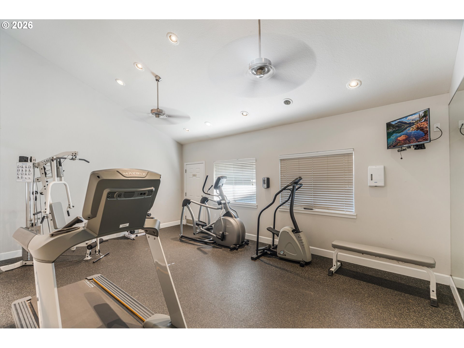 This ground floor corner unit offers easy access and a functional layout in a prime location. The interior features durable laminate flooring throughout the main living areas and bedrooms, creating a seamless and low maintenance environment. A wood burning fireplace serves as the centerpiece of the open living room, which flows directly into the dining area and kitchen.The kitchen is equipped with white cabinetry and a breakfast bar for casual dining. All appliances are included in the sale, including the free standing range, dishwasher, built in microwave, and refrigerator. For added convenience, the in-unit washer and dryer also stay with the home. Both bedrooms provide ample space, and the two full bathrooms feature updated lighting and clean finishes.Outdoor living includes a private deck with an attached storage room for seasonal items or outdoor gear. Residents have access to community amenities including a pool, gym, and recreation room. The monthly HOA dues cover water, sewer, trash, and both interior and exterior maintenance. Two parking permits are included with the unit.Located minutes from I-205 and the Clackamas Town Center Mall, this home provides quick access to a wide variety of shopping and dining options. Please note that the existing aluminum windows are scheduled for replacement by the HOA next year. Buyers are advised to verify the specific timing and details of this replacement project.Schedule your private tour today to see this move in ready condo in person.