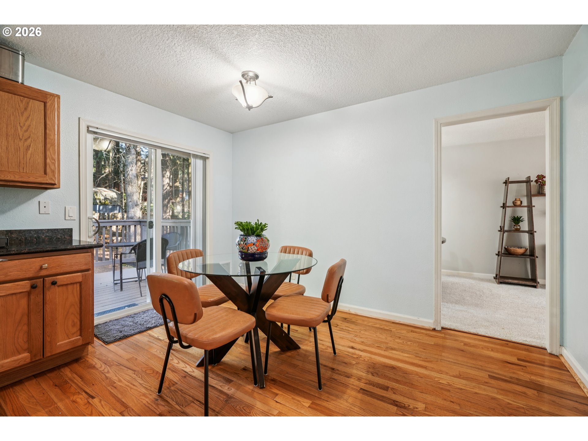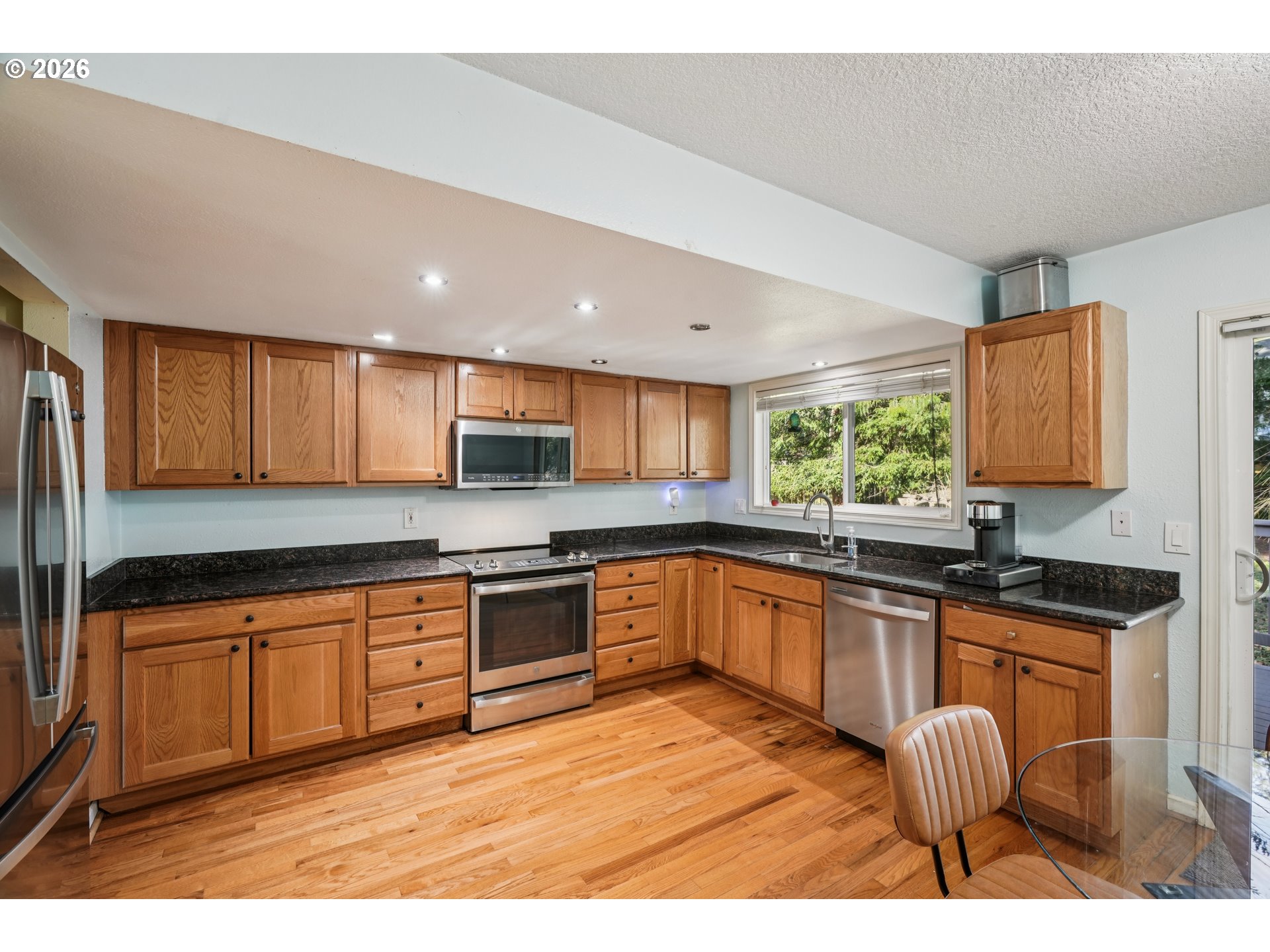 Welcome to this beautifully maintained, not-your-average-split-level home in the desirable Mt. Scott area of Happy Valley! Nestled among mature trees, this property offers a peaceful, park-like setting with a large backyard perfect for relaxing or entertaining. Inside, you’ll find a bright and inviting layout featuring hardwood floors, granite surfaces, stainless steel appliances, and energy-efficient upgrades throughout. Wood-burning fireplaces on both levels add warmth and just the right amount of a cozy vibe, complemented by central air and efficient forced-air heating for year-round comfort. The spacious floor plan includes multiple living areas - could be great for multi-generational living - and generous bedrooms with large closets and ceiling fans. The newly remodeled downstairs bathroom comes complete with a no-threshold shower. Step outside to a fenced yard with a deck and patio ideal for gatherings. The attached extra-deep garage includes an EV plug, and don't miss the abundant storage space under the stairs. Located in a quiet and serene community with HOA maintained nature trails, yet easy access to shopping, Kaiser Hospital, and I-205. This home blends comfort, style, and functionality in a beautiful natural setting.