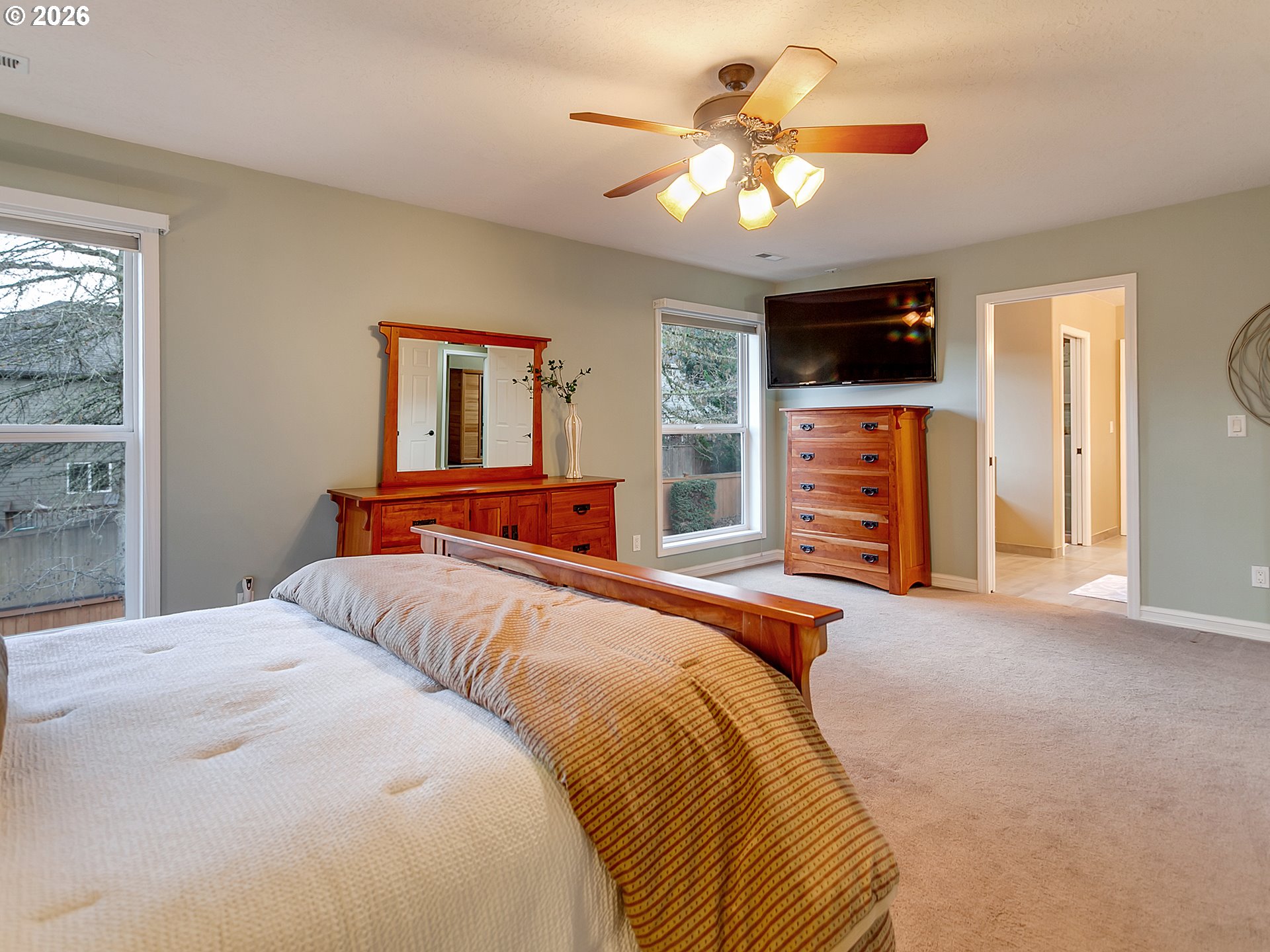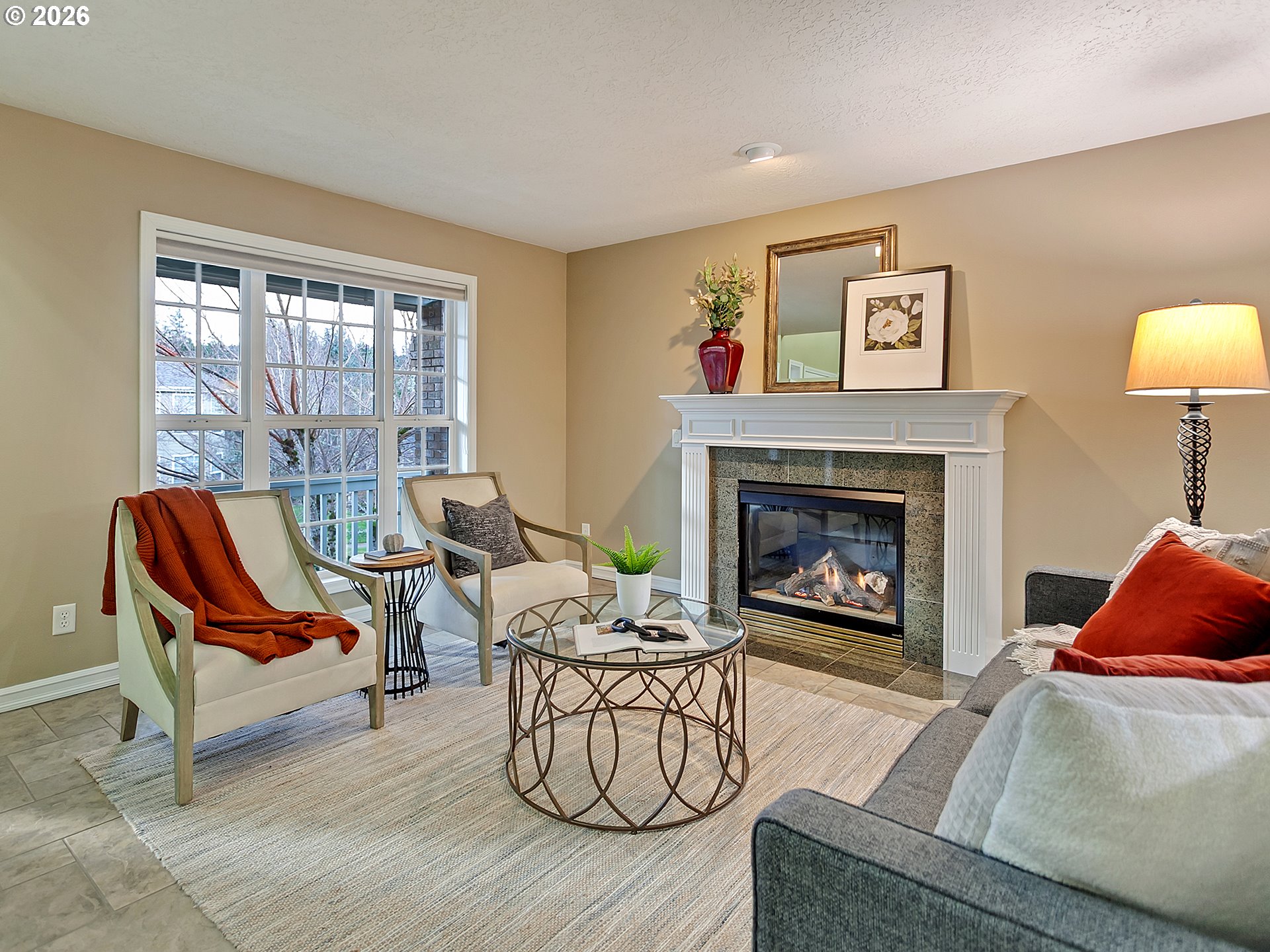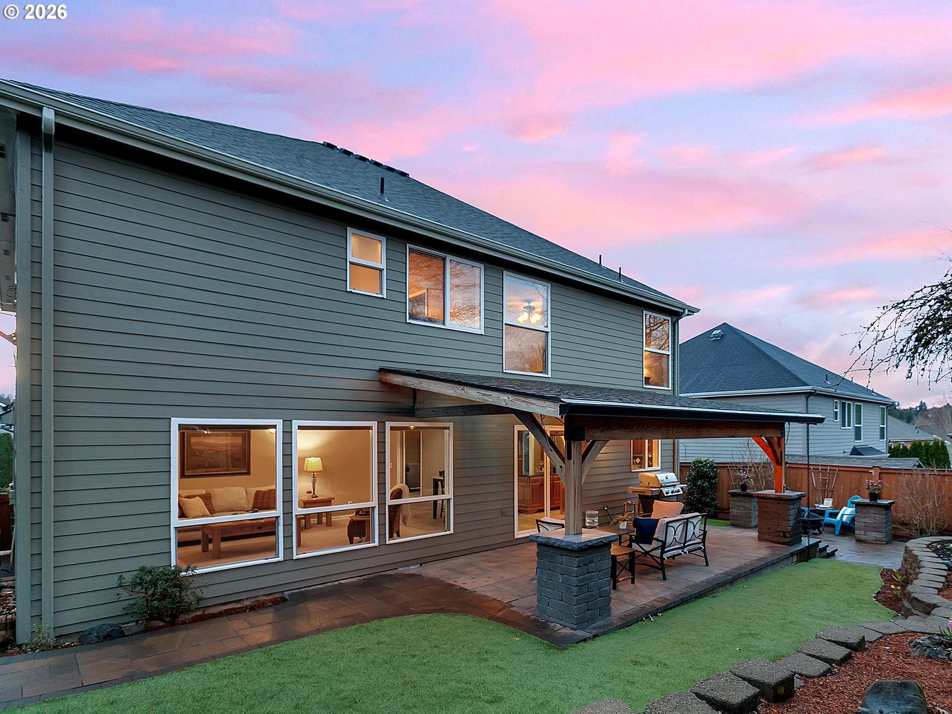 Open house Saturday 2/28, 10-12pm. Nestled in a desirable Happy Valley neighborhood, this beautifully maintained two-story home offers an open, light-filled floor plan and an incredible year-round outdoor retreat. The private backyard features a custom covered patio, fire pit area, hot tub, drip irrigation and low-maintenance artificial turf, perfect for entertaining in every season.The kitchen showcases rich cherry cabinetry, granite countertops, a large island, tile floors and a gas range with overhead hood. The open concept kitchen-living area flows seamlessly into the spacious living room with oversized windows and abundant natural light. A formal dining room and cozy sitting room with a gas fireplace create inviting gathering spaces. The main-level office or guest room sits near a convenient half bath for added flexibility.Upstairs offers four bedrooms including a generous primary suite with double sinks, cherry cabinets and granite countertops, jetted tub, separate shower and walk-in closet. A second full bath with double sinks, granite countertops and cherry cabinets and upstairs laundry add everyday convenience.A two-car garage with built-ins provides ample storage. Flat RV parking with 30-amp hookup accommodates up to a 30-ft RV, plus two powered storage sheds. There is also a generator inlet plug on the RV pad for connecting a whole house generator and interlock kit on the electrical panel as required by code when connecting a generator. Located on a quiet cul-de-sac near parks, trails, shopping and community amenities. Updates include newer roof with owned solar panels, tankless water heater, furnace and custom patio cover.