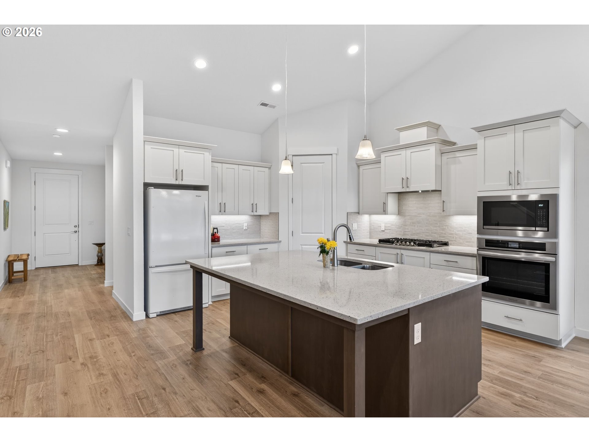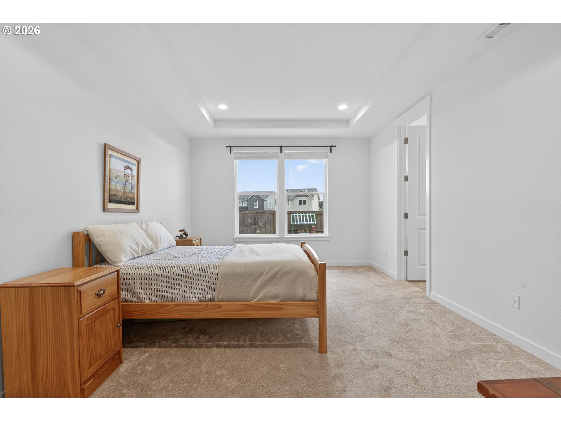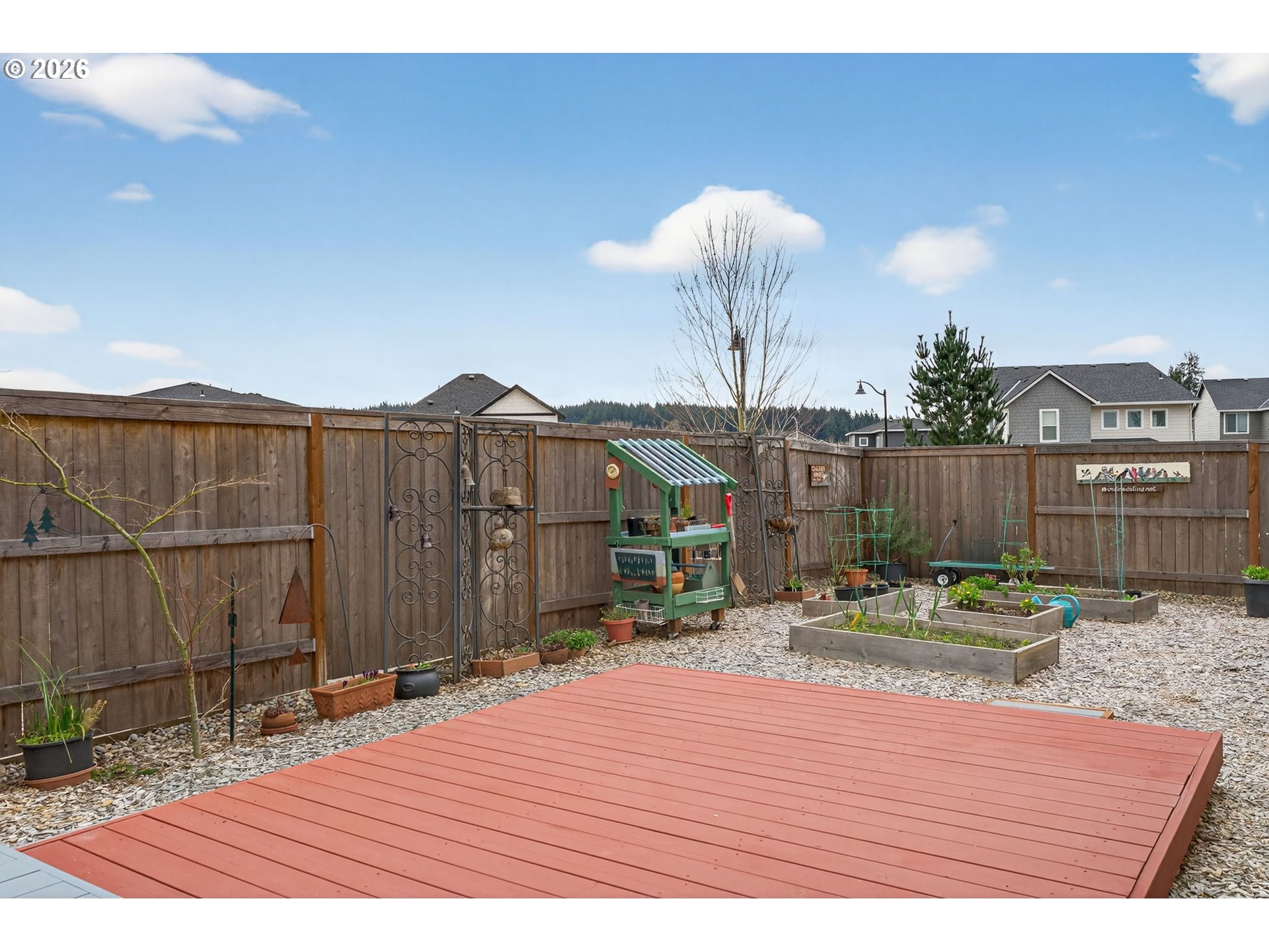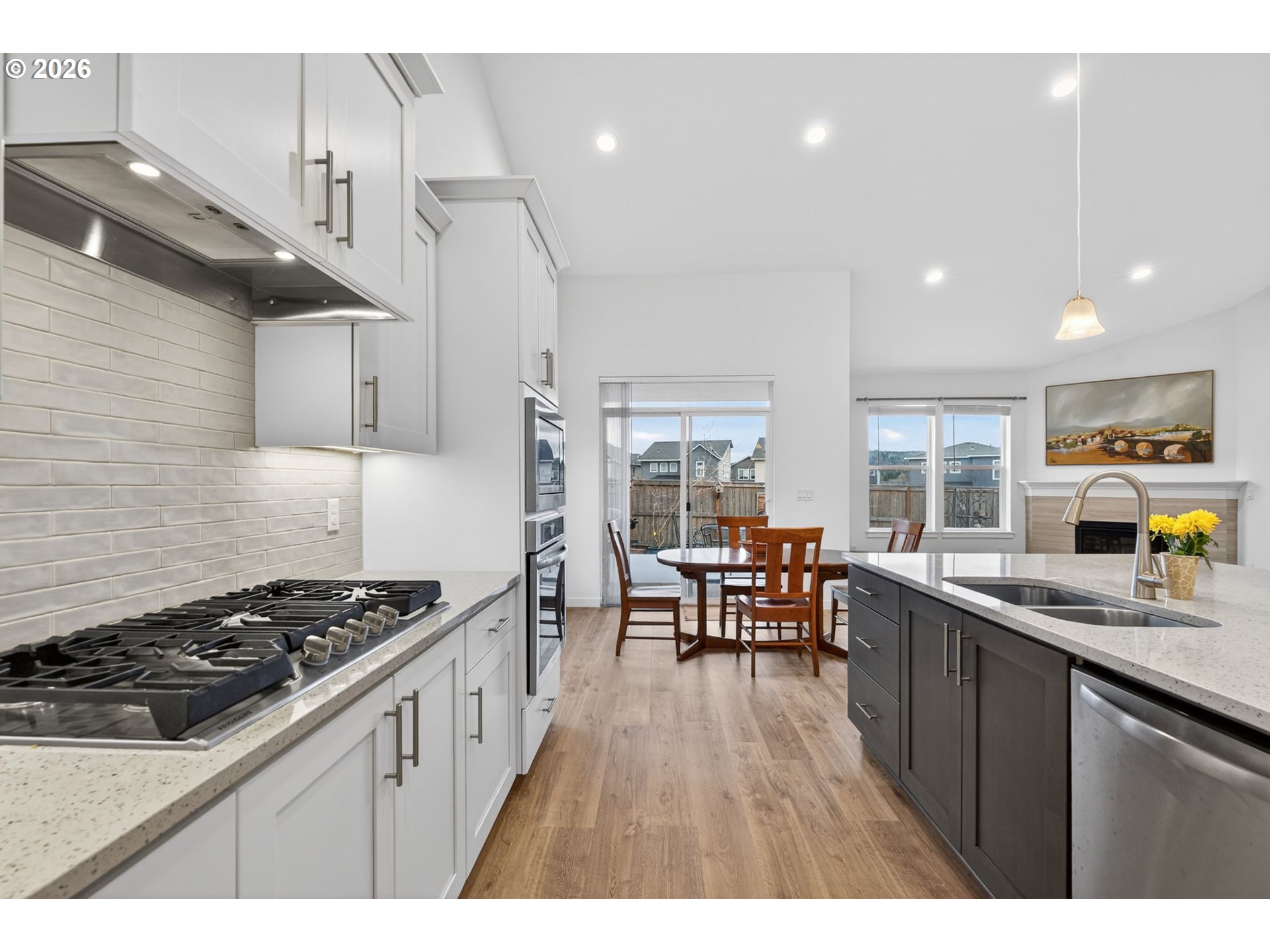 Built in 2023, this beautiful 4 bed, 3 full bath home offers modern comfort and flexible living in a highly desirable Happy Valley neighborhood with fantastic community amenities including an HOA pool, two playgrounds, community room, and more. Enjoy the ease of complete main-level living with a spacious primary suite, an additional bedroom, full bathroom, and laundry room all on the main floor. When the home was purchased, the owners added thoughtful builder upgrades including gourmet kitchen, central AC, upgraded flooring, upgraded carpet, and a utility sink in the laundry room. The open-concept main living space features vaulted ceilings, a cozy gas fireplace, and large windows that bring in natural light. The kitchen is designed for both everyday living and entertaining with an oversized island, pantry, and seamless flow into the dining and living areas. Step outside to a fenced backyard with patio that backs to open space/park, creating a peaceful and private setting. Upstairs you’ll find two additional bedrooms (one with a walk-in closet) and a full bathroom, providing great separation of space for guests, kids, or a home office. Additional highlights include a 3-car tandem garage for extra parking, storage, or a home gym. A nearly new home with upgrades, space, and access to incredible neighborhood amenities.