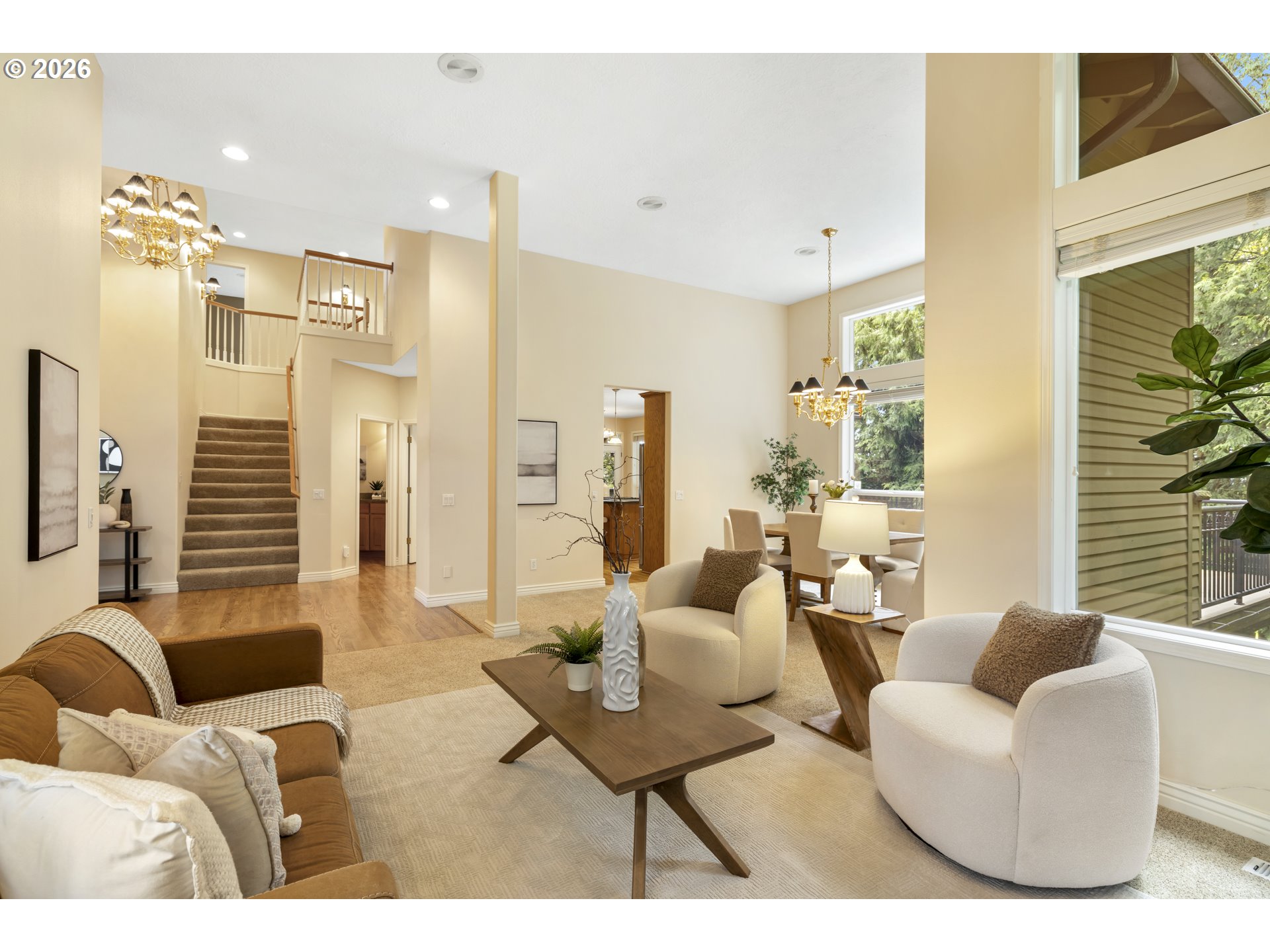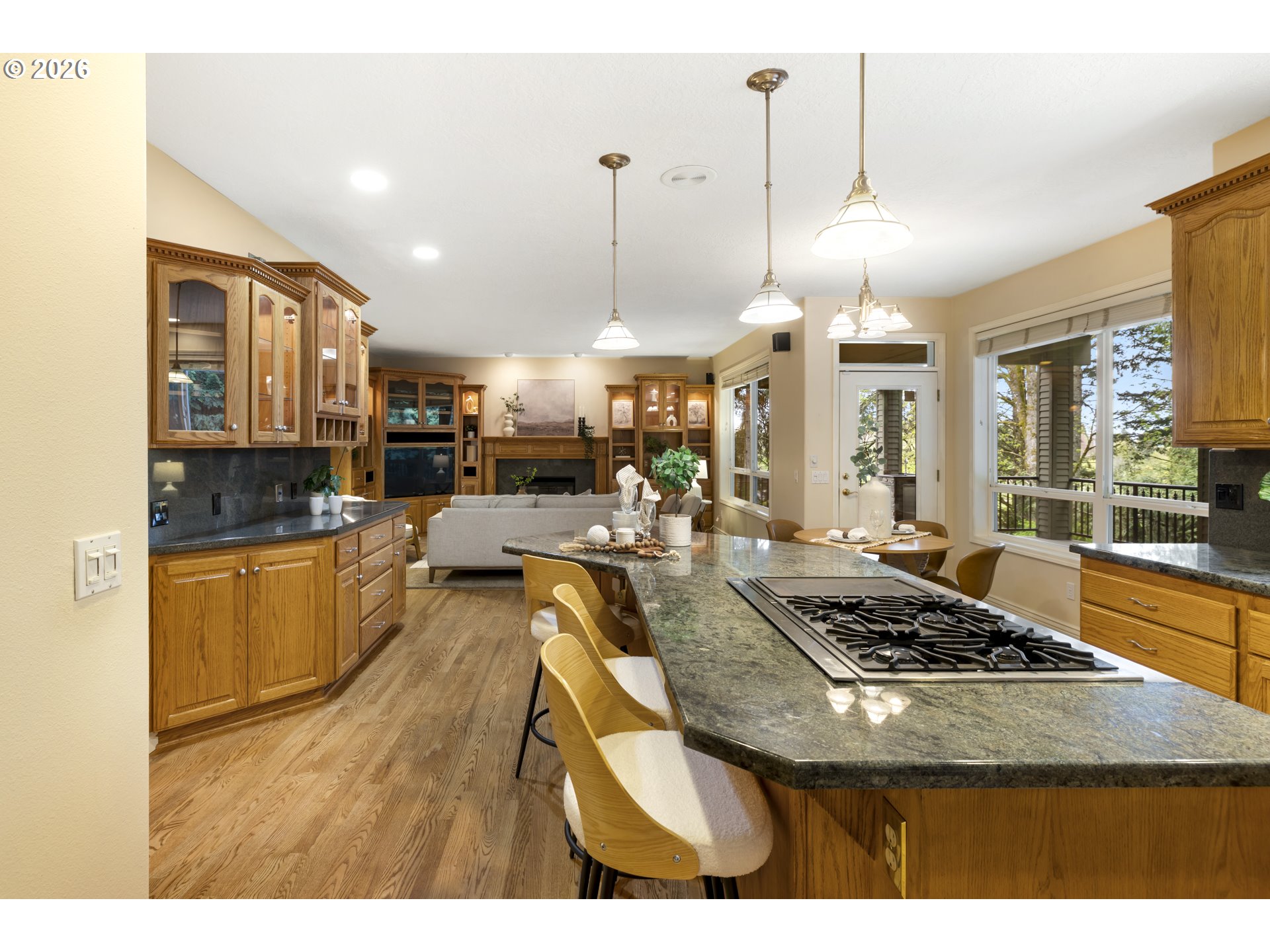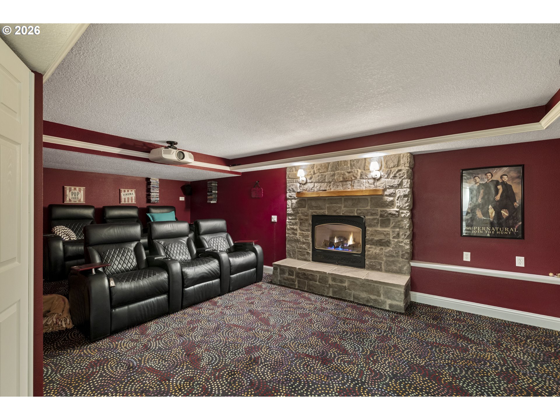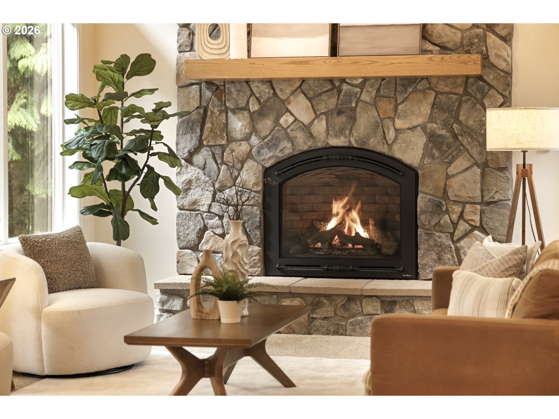 Simply stunning, one-of-a-kind estate in the heart of Happy Valley offering privacy, flexibility, and a setting that feels worlds away while remaining close to everything. Situated on 1.69 acres beyond a gated drive, this well-constructed and meticulously maintained home is surrounded by evergreens, mature fruit trees, seasonal gardens, and protected green space with regular wildlife sightings. Inside you are greeted by soaring ceilings (12’ main, 18’ entry) and a lodge-style living room with a floor-to-ceiling stone fireplace that evokes a striking first impression. The kitchen and family room are warm and inviting with expansive views of the grounds. Upstairs, the spacious primary suite is complemented by two additional bedrooms with a Jack-and-Jill bath and private sink areas. Downstairs, the lower level offers flexible multi-generational living with a separate entrance, kitchenette, 2 bedrooms, full bath, and a fully equipped home theater with stadium seating and high end audio and projection. Outdoor living shines with a large deck (covered and uncovered), paver patio with fire pit, basketball court, garden shed, and expansive grounds ideal for relaxing and entertaining. A custom detached RV garage built to match the home offers heaps of shop space for hobbyists or workshop use, and a carpeted upper level for additional storage. Easy access to nearby trails, and proximity to Happy Valley Town Center, dining, parks, and I-205 complete the package. Nothing about this home is cookie-cutter! It’s an exceptional opportunity for those who value quality, flexibility, and hobbies, all in a nature-rich setting.