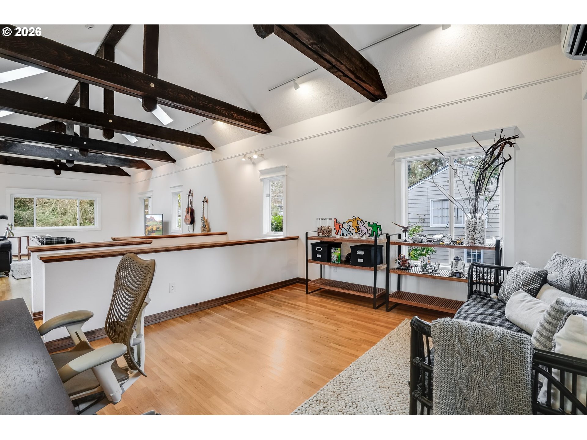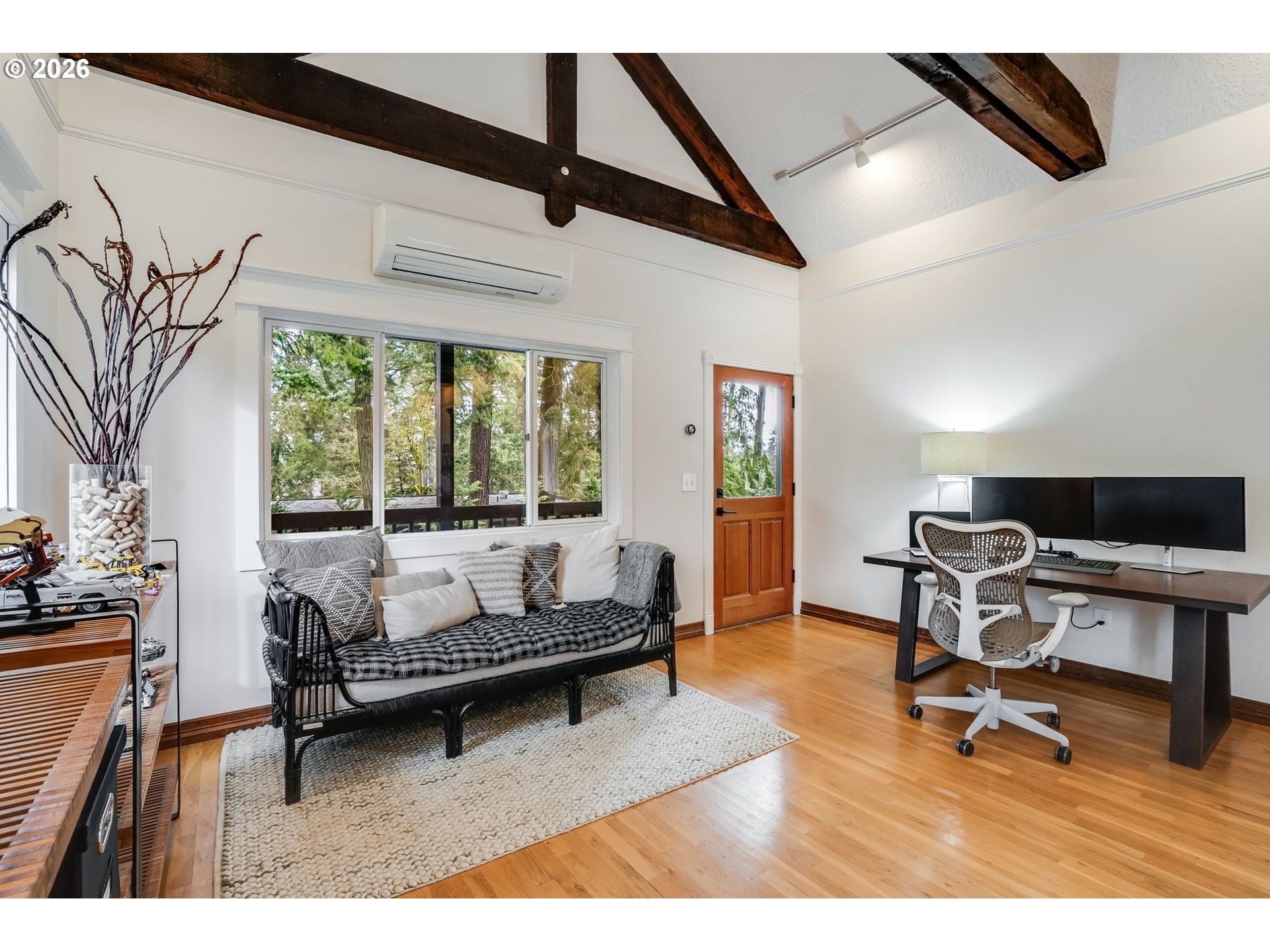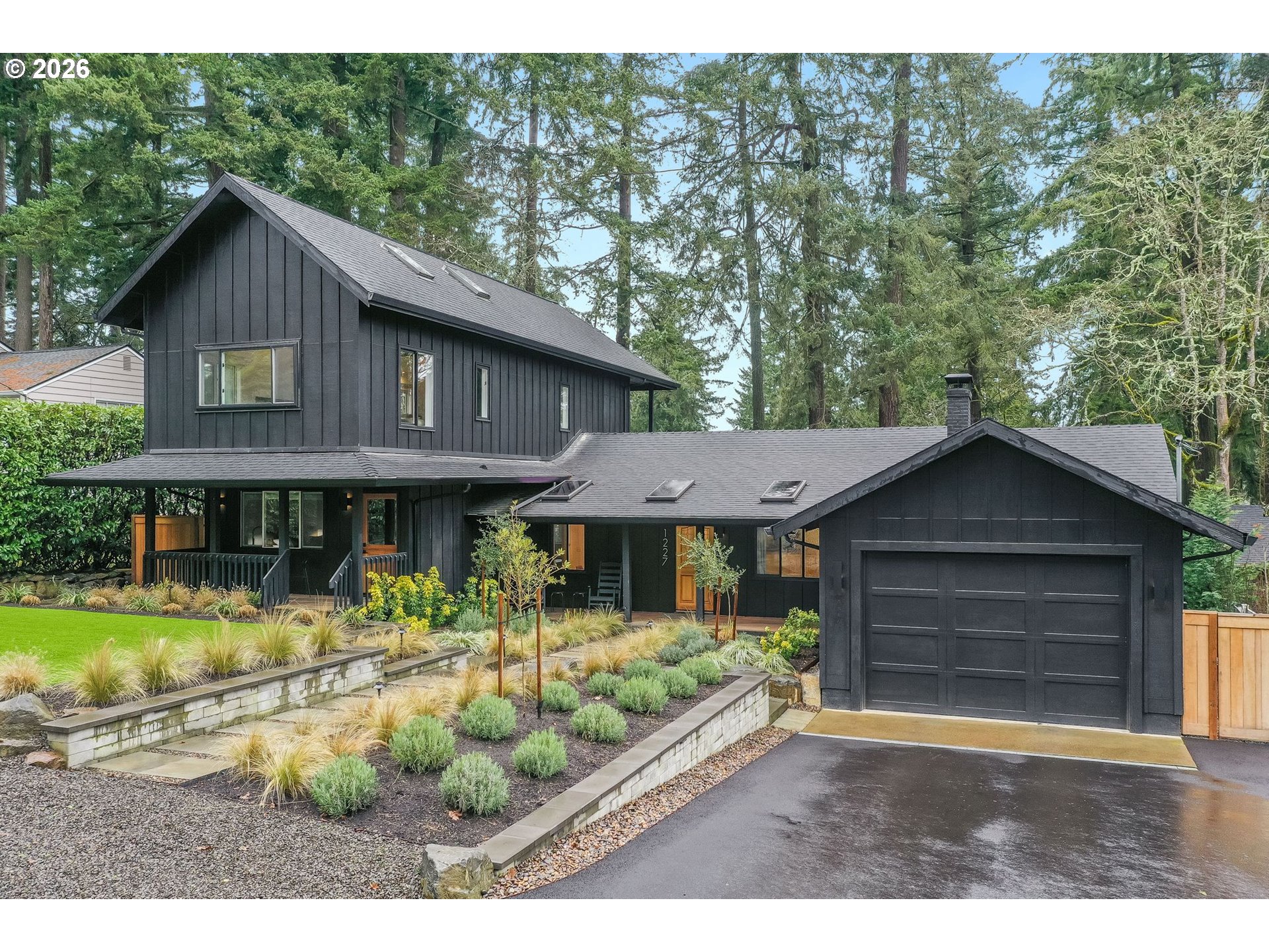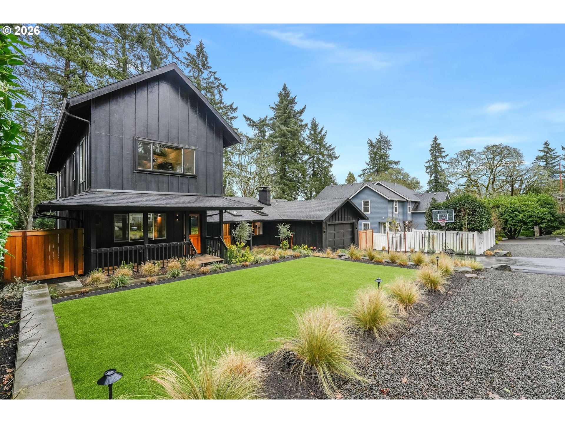 Tucked beneath towering evergreens just blocks from Oswego Lake, this striking modern farmhouse blends bold architecture with effortless Lake Oswego living. The dramatic black exterior makes an immediate statement, beautifully framed by lush greenery and thoughtfully designed low-maintenance landscaping. A welcoming covered porch and clean-lined hardscape create a refined first impression.Spanning 2,151 square feet, this 3-bedroom (3rd bedroom is the loft), 2-bath home offers the rare advantage of a main-level primary suite, providing both comfort and convenience. Inside, hardwood floors run throughout, complemented by exposed beams and a statement fireplace that anchors the main living space. French doors invite natural light and create seamless indoor-outdoor flow.Designed for flexibility, five separate rooms offer direct patio and yard access, making the layout ideal for entertaining, working from home, or creating dedicated spaces for study, guests, or hobbies. The oversized secondary bedrooms provide exceptional space and versatility rarely found in homes of this style. The floor plan strikes a balance between openness and defined living areas, allowing the home to adapt easily to today’s evolving lifestyle needs.Outdoor spaces have been intentionally curated for both beauty and ease. The modern front and backyard feature low-maintenance turf and structured landscaping, delivering year-round curb appeal without the upkeep. Recent upgrades, including a new furnace and updated electrical, new gas fireplace add to the home’s turnkey appeal.Located moments from George Rogers Park, downtown Lake Oswego’s shops and dining, and the recreational lifestyle surrounding Oswego Lake, this home offers privacy, character, and walkability in one exceptional setting.