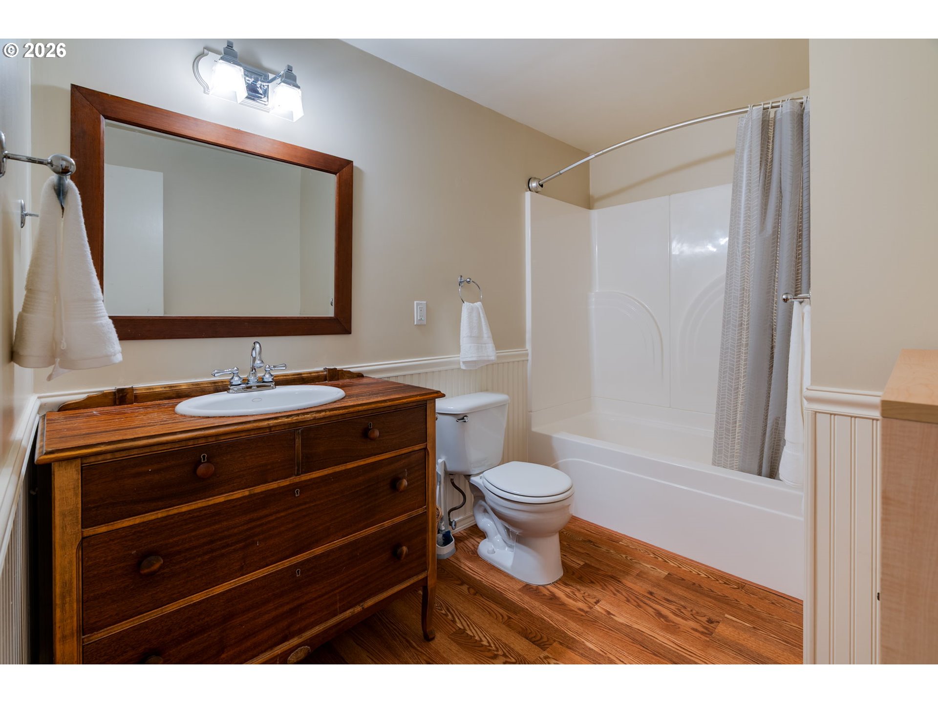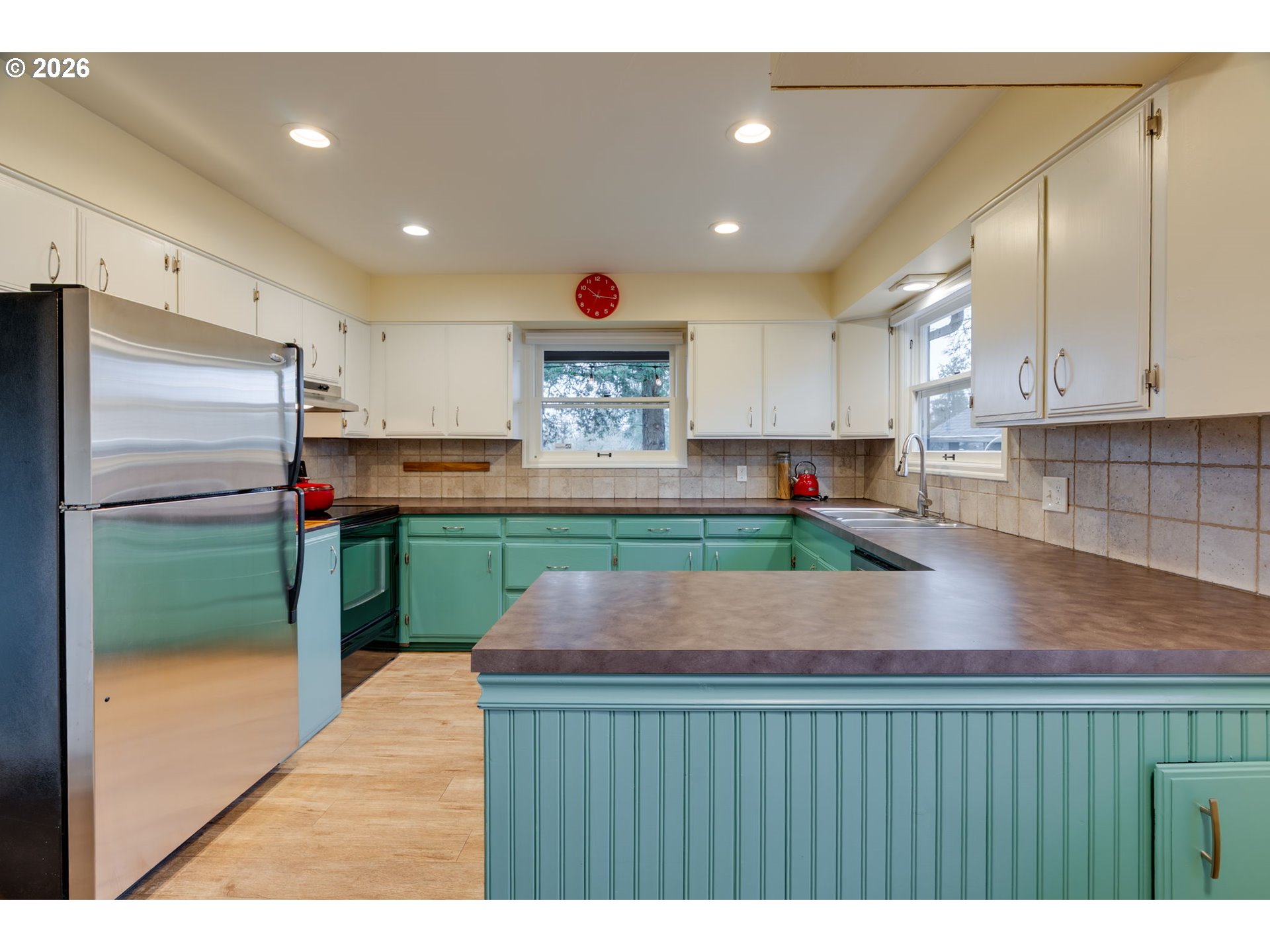 Spacious mid-century home in the Oak Grove neighborhood of Milwaukie. Set back from the street on a large, fenced lot with mature landscaping, a beautiful deck, patio, porch, and separate artist studio. The bright and airy living room and attached dining room offer original hardwood floors, period fireplace, and picture windows. The home provides a spacious kitchen complete with a second dining space/breakfast nook. Two bedrooms and an updated full bath complete the main level. Upstairs offers two additional bedrooms and a full bath. An expansive full basement features high ceilings with a washer/dryer, storage space, and a recently finished hobby studio. The separate art studio has a new floor, finished walls, and a new electric panel. The backyard boasts a newly built, top-of-the-line bird aviary. The home offers a high-efficiency gas furnace, fresh interior paint, new flooring upstairs, a newer sewer line, 9-year-old roof, and a radon remediation system. Conveniently located, close to Milwaukie Village and just a short walk to the MAX station.