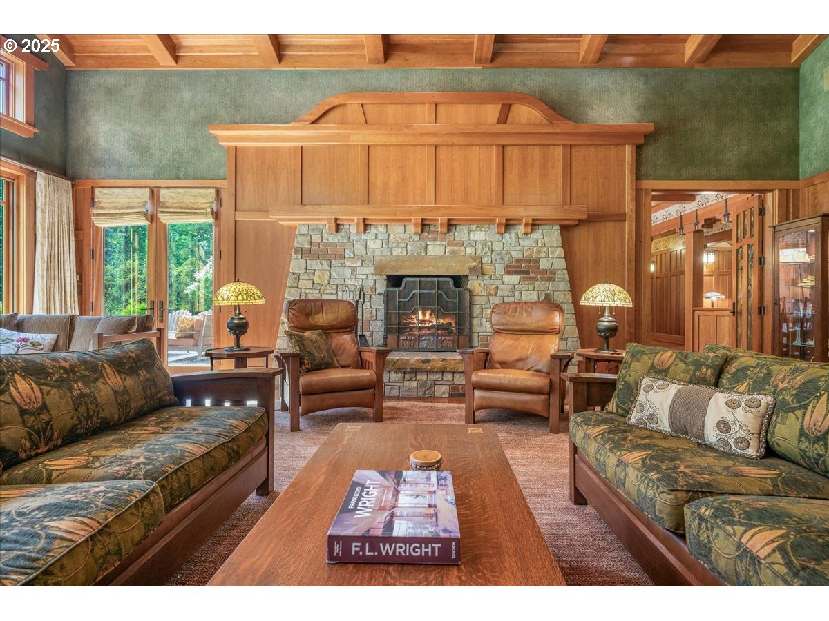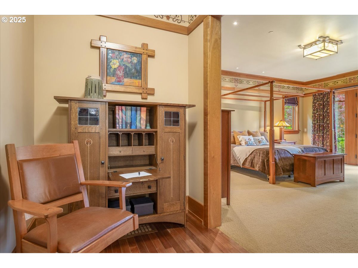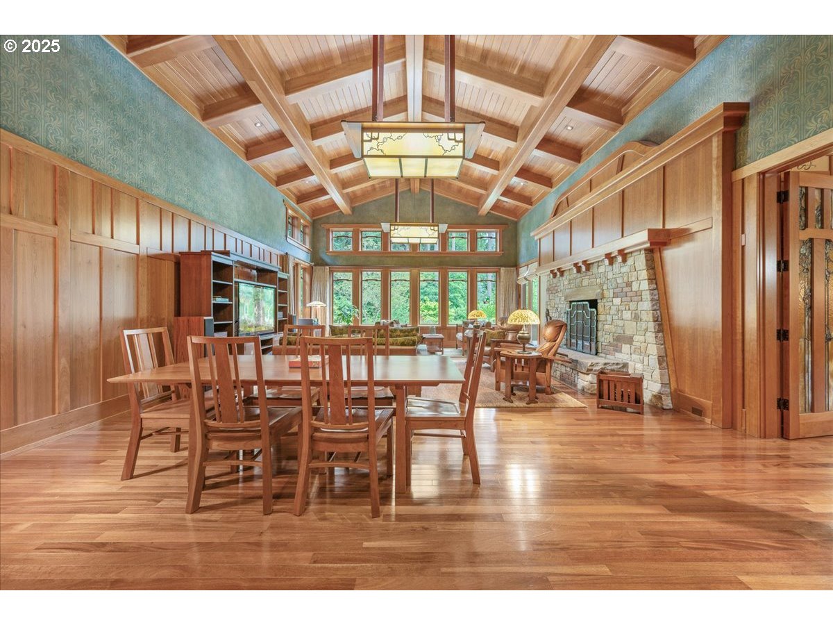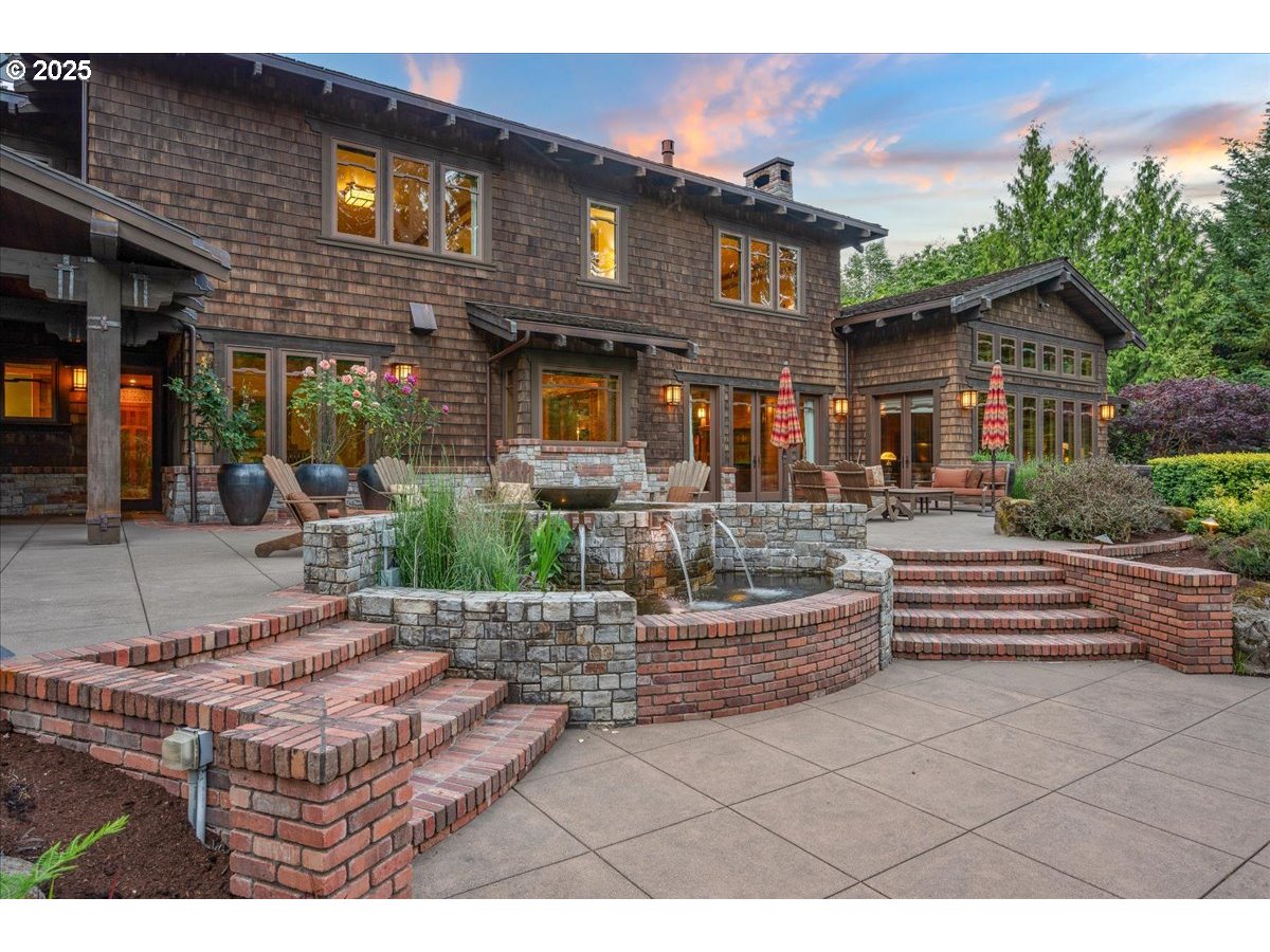 (503) 893-8874NEW PRICE! Exquisite Custom Craftsman Resort Home in Dunthorpe (Clackamas Co)! Step into a masterfully crafted sanctuary inspired by Greene & Greene, where architectural artistry and endless amenities combine to deliver unequalled luxury. This gated estate welcomes you with a circular driveway, porte cochere, and serene koi pond, setting the tone for extraordinary living. Inside, every detail—stained glass, hand-stenciled friezes, cherry wood paneling, and artisan lighting—reflects timeless craftsmanship. The great rooms vaulted ceilings and stone fireplace on the main floor offer warmth and elegance with panoramic garden views, while the distinguished conversation room with fireplace allows for more intimate gatherings. Entertain in style in the grand dining room adorned with a custom mahogany chandelier, hand hammered copper fireplace hood, and French doors to the patio. The chefs kitchen is a dream—boasting a massive island, Wolf range and double ovens, Sub-Zero appliances, three Miele dishwashers, butlers pantry, and a walk-in wine cellar. Designed as its own oasis, the grand, main floor, primary suite features a fireplace, large spa-like bathroom, custom glass-paneled walk-in closet, attached fitness room, and French doors leading to a private patio. The upper floor offers three roomy en suite bedrooms with nature out every window—two with fireplaces. This floor is complimented by a media room featuring custom built-ins with a wet bar. Outdoors, enjoy 1.4 acres of resort-style living with a saltwater pool and spa, covered patio with fireplace and grill, koi fountain, and lush gardens with fruit trees and terraces.A one-of-a-kind home that overdelivers on every detail.