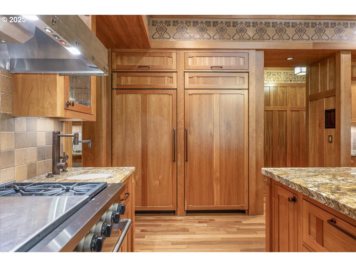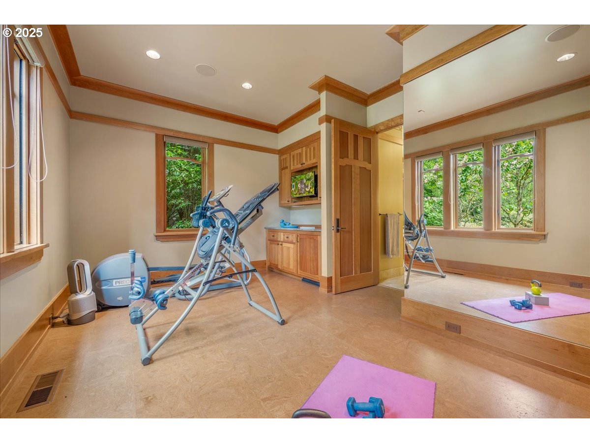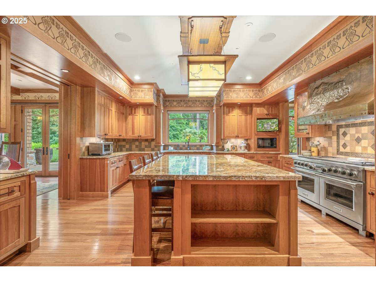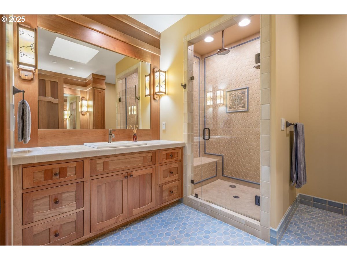 (503) 893-8874NEW PRICE! Exquisite Custom Craftsman Resort Home in Dunthorpe (Clackamas Co)! Step into a masterfully crafted sanctuary inspired by Greene & Greene, where architectural artistry and endless amenities combine to deliver unequalled luxury. This gated estate welcomes you with a circular driveway, porte cochere, and serene koi pond, setting the tone for extraordinary living. Inside, every detail—stained glass, hand-stenciled friezes, cherry wood paneling, and artisan lighting—reflects timeless craftsmanship. The great rooms vaulted ceilings and stone fireplace on the main floor offer warmth and elegance with panoramic garden views, while the distinguished conversation room with fireplace allows for more intimate gatherings. Entertain in style in the grand dining room adorned with a custom mahogany chandelier, hand hammered copper fireplace hood, and French doors to the patio. The chefs kitchen is a dream—boasting a massive island, Wolf range and double ovens, Sub-Zero appliances, three Miele dishwashers, butlers pantry, and a walk-in wine cellar. Designed as its own oasis, the grand, main floor, primary suite features a fireplace, large spa-like bathroom, custom glass-paneled walk-in closet, attached fitness room, and French doors leading to a private patio. The upper floor offers three roomy en suite bedrooms with nature out every window—two with fireplaces. This floor is complimented by a media room featuring custom built-ins with a wet bar. Outdoors, enjoy 1.4 acres of resort-style living with a saltwater pool and spa, covered patio with fireplace and grill, koi fountain, and lush gardens with fruit trees and terraces.A one-of-a-kind home that overdelivers on every detail.