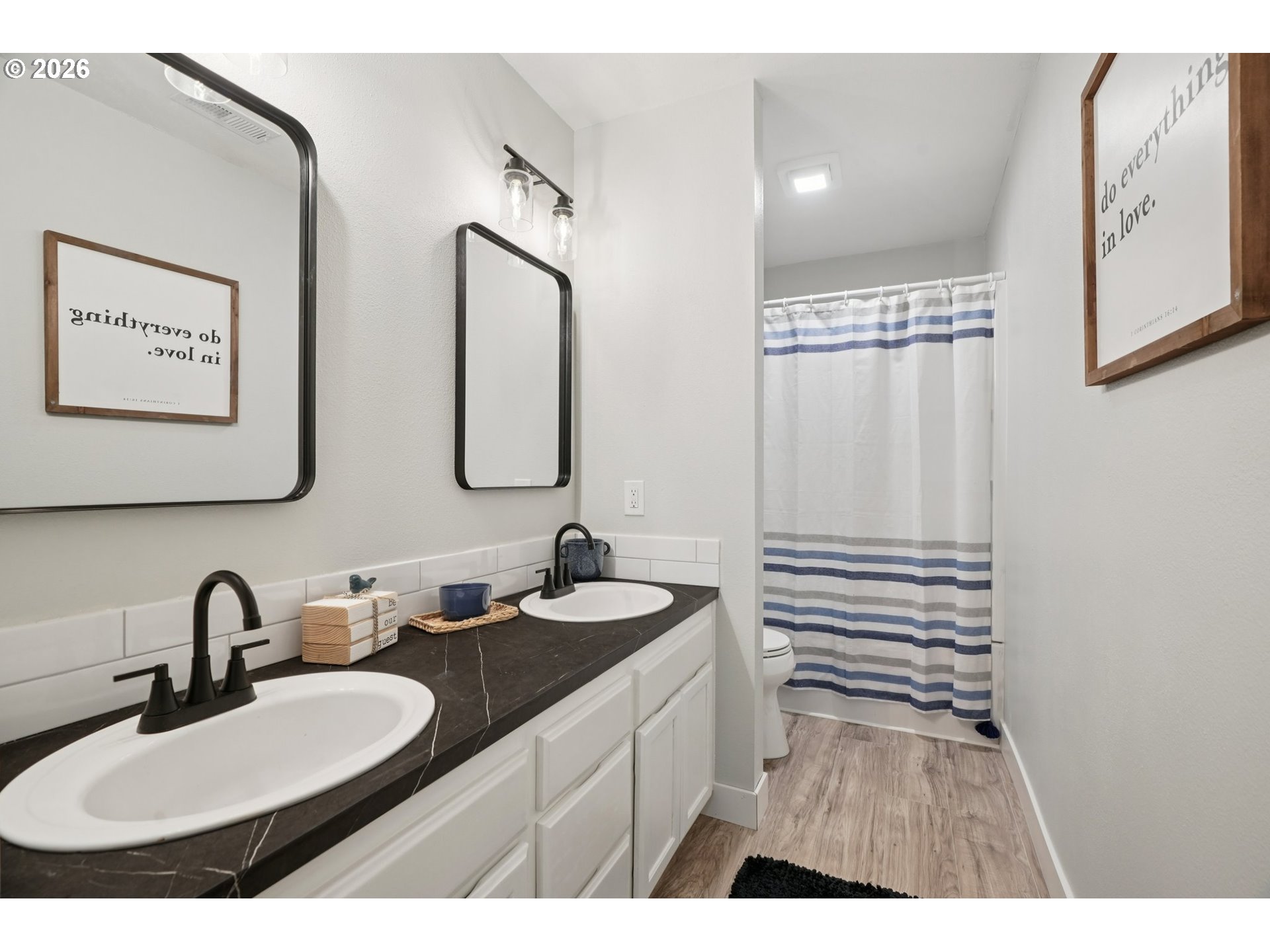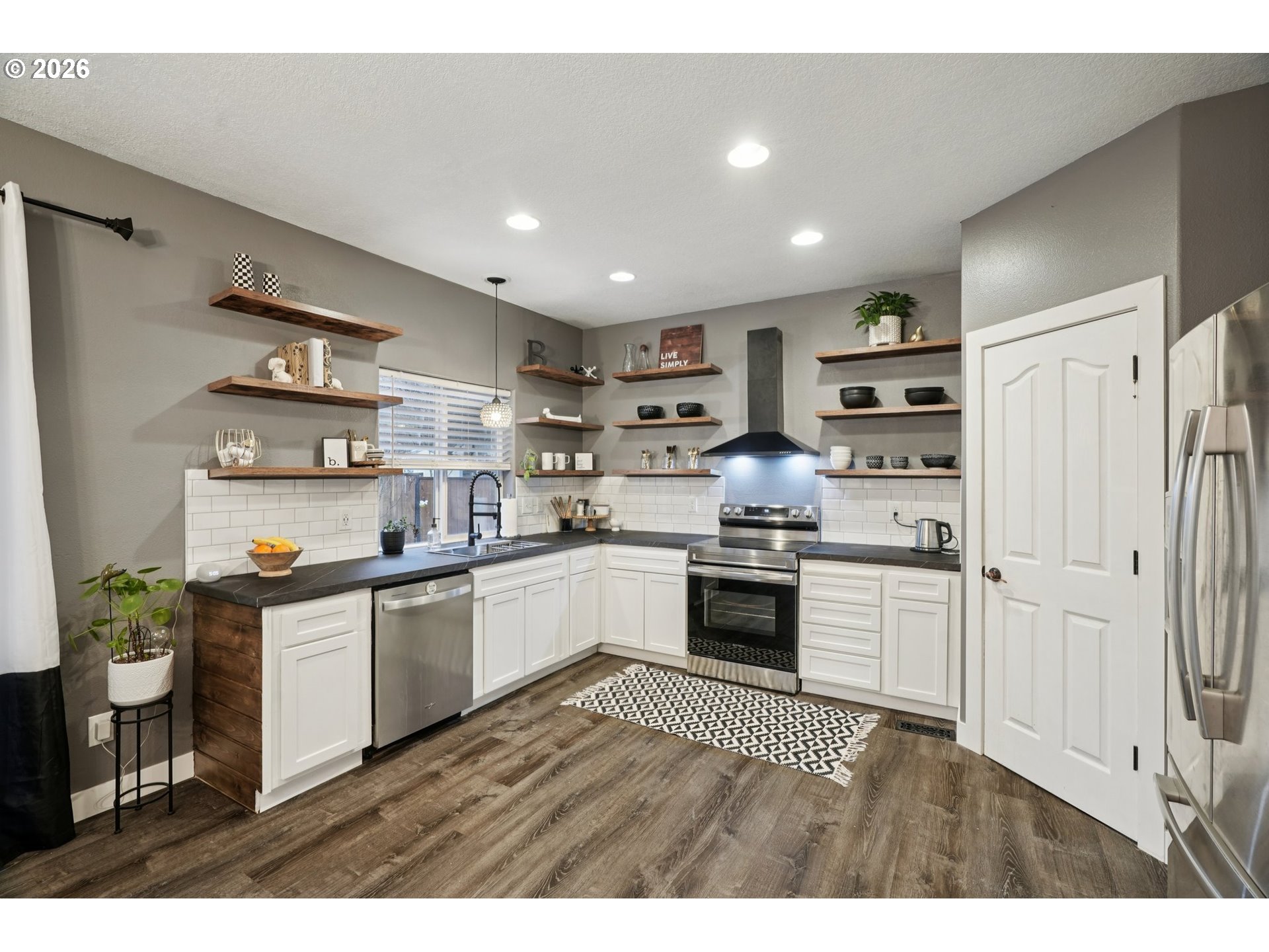 (503) 893-8874Spacious and thoughtfully designed, this traditional home offers flexible living with 5 bedrooms and multiple living spaces. The main level features a formal living room and a family room, separated by an antique barn door. The open-concept living area serves as the heart of the home, showcasing high ceilings, floor-to-ceiling picture windows that fill the space with natural light, and an updated fireplace. The newly remodeled kitchen features stainless steel appliances, wood floating shelves, a walk-in pantry, and seamlessly connects to the dining and living areas. Enjoy new vinyl flooring throughout the main level and a spacious utility room with oversized washer and dryer and abundant storage. Upstairs, the expansive primary suite offers a private retreat with soaring ceilings, elegant French doors, a large walk-in closet, and an ensuite bathroom featuring a soaking tub and separate shower. Additional bedrooms offer room to grow, including an upstairs bedroom with new vinyl flooring and remodeled guest bathrooms. The 5th bedroom features glass French doors, which can also be ideal for a home office, media room, or flexible living space. Step outside to enjoy a large patio perfect for entertaining, a level fenced backyard with green space, a storage shed, and an additional fenced area ideal for gardening or pets. Situated in a peaceful neighborhood with a low HOA, this home is just minutes from parks and everyday amenities. Come see it for yourself!