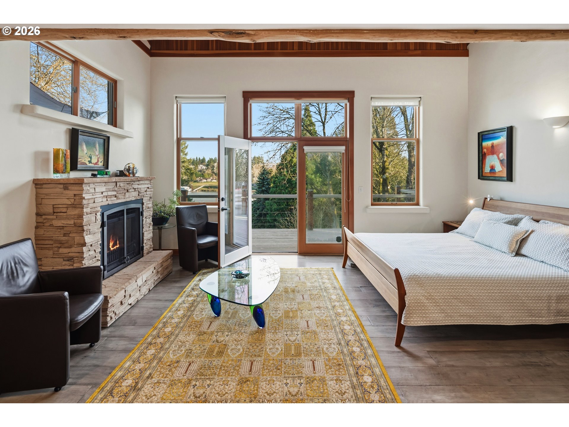 (503) 893-8874Perched above the Willamette River on Fielding Road, this striking Northwest contemporary offers stunning river views on one of the area's most sought-after streets. Cathedral tongue-and-groove cedar ceilings extend from the living room to the primary suite, accented by skylights that flood the interior with natural light. Hand-selected Douglas fir posts and exposed timber-truss beams highlight Pacific Northwest craftsmanship. Engineered hardwood floors and oversized windows create a bright, airy feel, while an eco-friendly mini-split system ensures year-round comfort. The living room is anchored by a floor-to-ceiling stone gas fireplace beneath soaring ceilings. French doors open to an expansive back deck with hot tub, outdoor shower, and sweeping river views. A media loft overlooks the space and connects to a bedroom with en suite. In the kitchen, an Elmira Northstar midcentury-style gas stove is paired with river views, slate floors, and abundant storage. A center island seats four and features a double bowl drainboard sink, with a second sink offering added convenience. Set on its own wing, the primary suite features deck access and a stacked stone gas fireplace. The en suite includes a double vanity, deep soaking tub, and walk-in closet with built-in storage, while an adjacent loft provides an ideal home office. Downstairs, two bedrooms overlook the river, each with access to a lower patio. A laundry room and storage room complete the lower level. Additional features include a powder room at entry, sound system, and extra-deep 2-car garage. Built with advanced Rastra composite insulated concrete form (ICF) construction and structural insulated panel (SIP) roofing, the home delivers exceptional energy efficiency, superior soundproofing, and structural strength up to 7x that of wood-frame construction, finished with plaster interior walls and durable stucco exterior. Located in one of the state's top-rated school districts, minutes from downtown Lake Oswego.