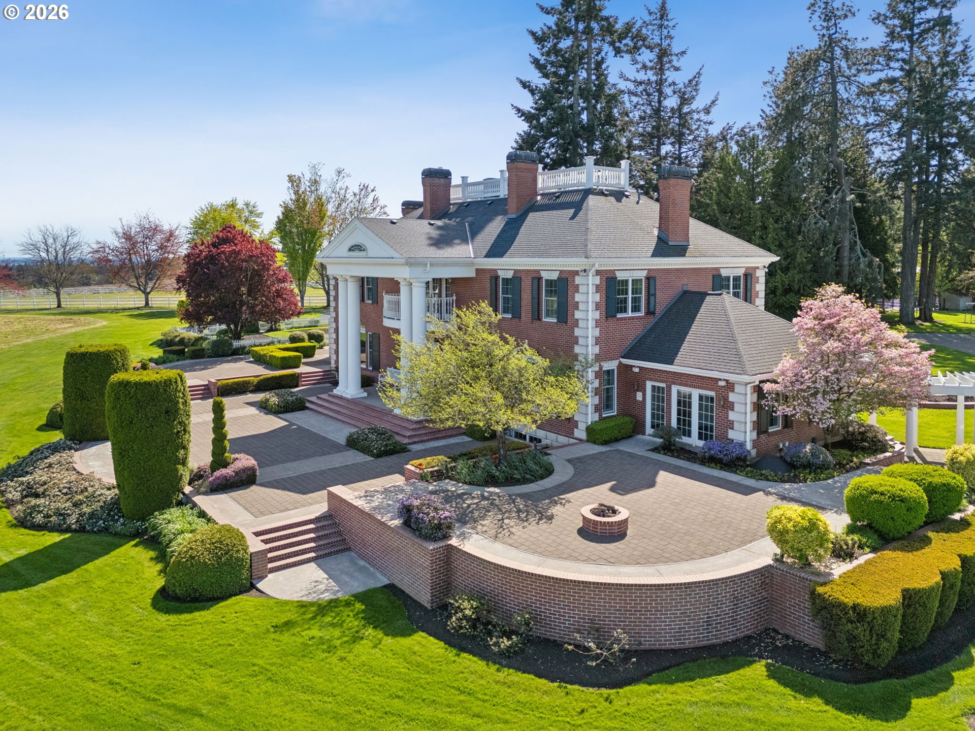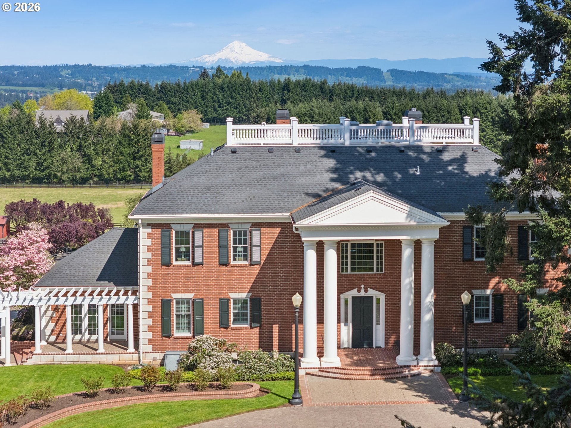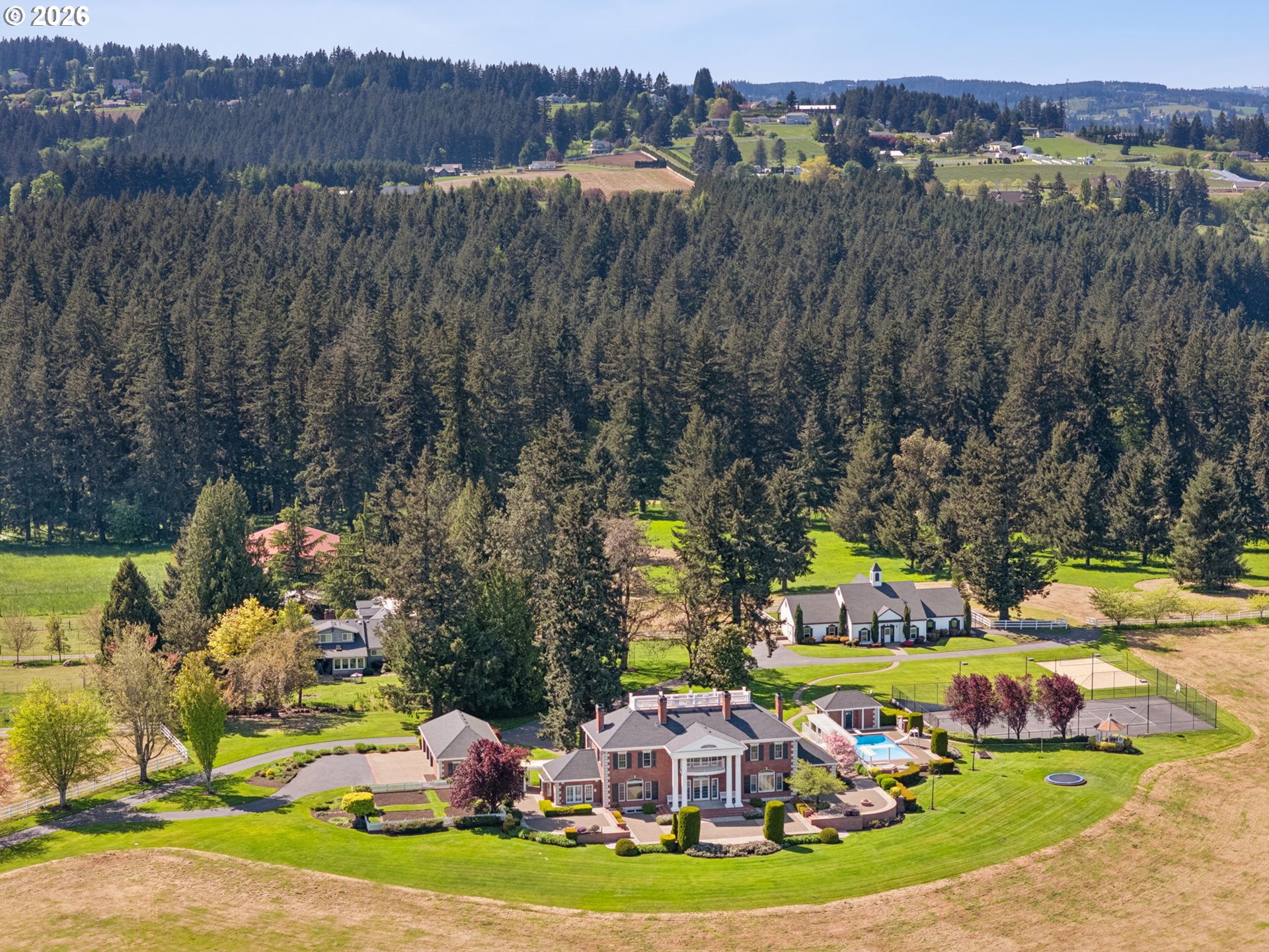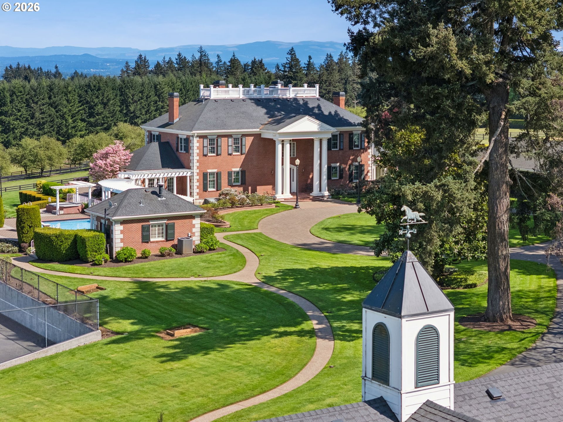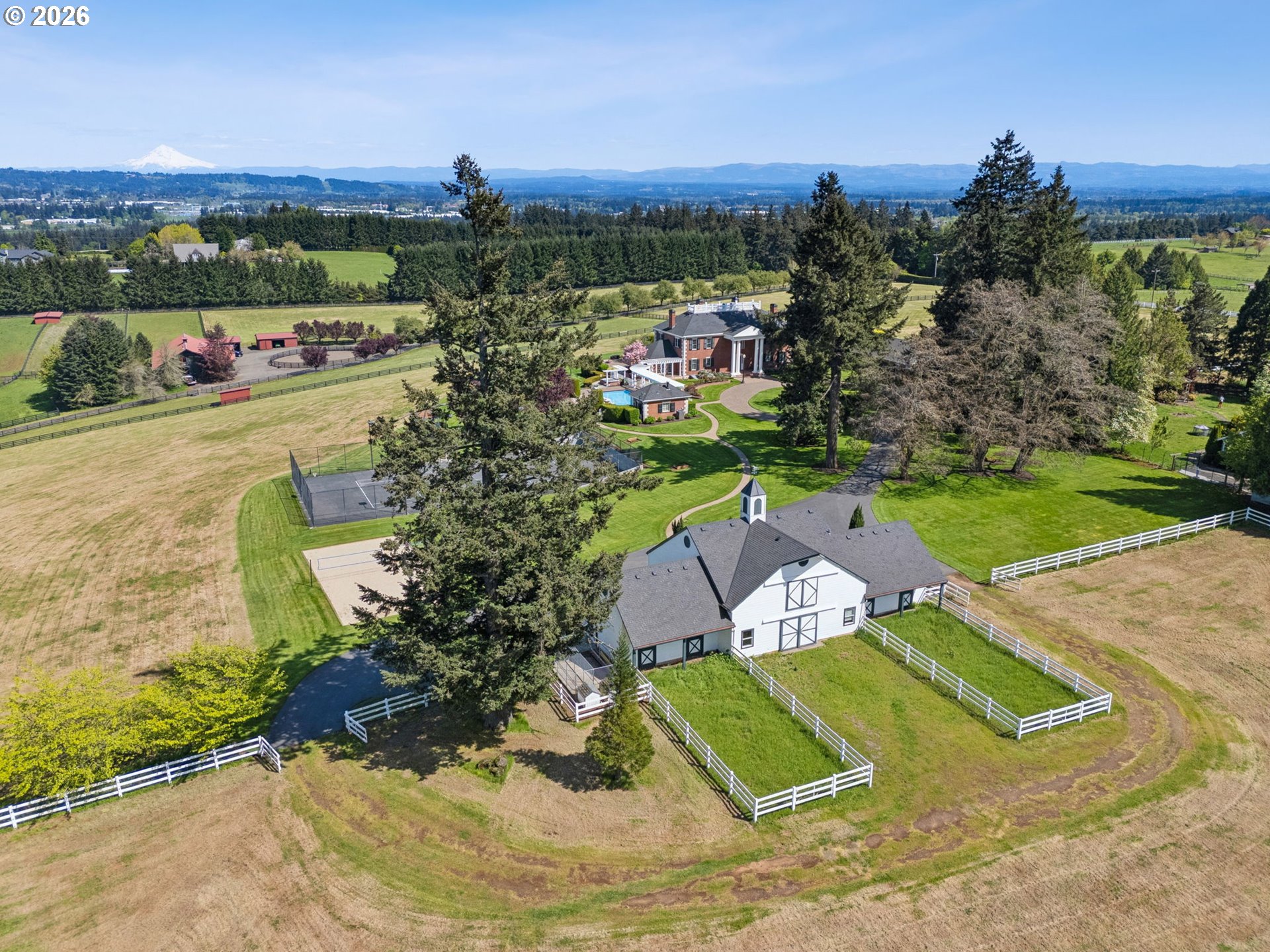 (503) 893-8874Five Peaks Farm — an exquisitely crafted custom Georgian estate sited on 31.79 pristine acres with sweeping 280° vistas of five mountain peaks and glittering city lights. The 8,028sqft residence greets you with a gracious foyer and offers timeless elegance throughout: a main level primary en suite, an impressive office, grand living room, formal dining and kitchen with butler’s station — all opening via walls of windows to multiple patios that capture the territorial panoramas. Interior appointments include rich hardwood floors, vaulted ceilings, wainscoting, six fireplaces, a library/study with a southern style balcony, dedicated theatre, exercise suite with steam and sauna, and high tech security systems. Dual staircases rise to the upstairs wings at either end of the home, while a separate staircase descends to the lower level entertainment spaces featuring a theatre, game room, kitchenette, gym, workshop and abundant storage. Exquisite brickwork and master craftsmanship complete the residence. Outdoors is resort caliber living and entertaining: expansive terraces, a pool with pool house and Island Spa hot tub, in ground trampoline, sand volleyball and tennis courts, plus monkey bars and swing play features—perfect for events, family gatherings and friend filled weekends across the vast, maturely landscaped grounds. Equestrian facilities are exceptional: an oversized Kentucky style barn with grain and tack rooms, storage and four stalls with covered runs, multiple large fenced and cross fenced turnouts, and direct access to on site riding trails. Practical amenities include an oversized detached garage with pull through doors, extensive operational space and the property’s current farm deferral status. Tucked privately off the road yet conveniently located in the top rated Sherwood school district with easy access to Sherwood, Wilsonville, Newberg and the I 5/I 205 corridors, Five Peaks Farm blends privacy, panoramic beauty, top tier infrastructure and lifestyle.