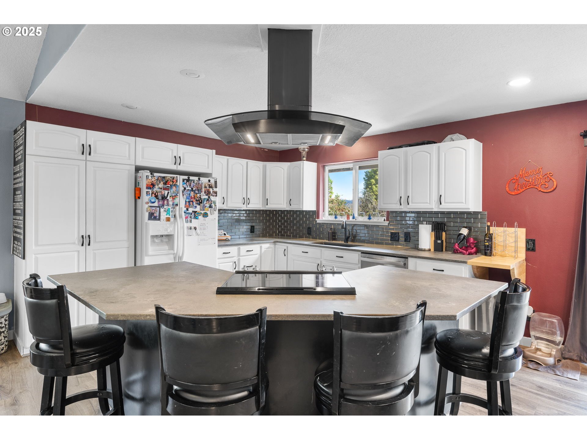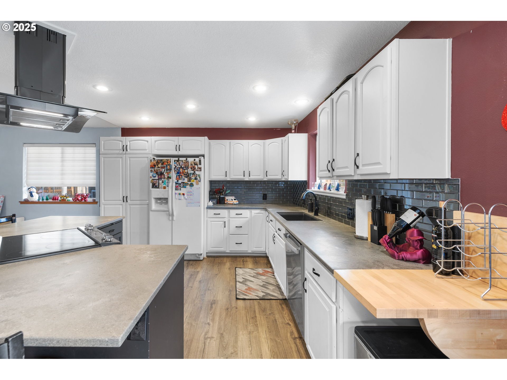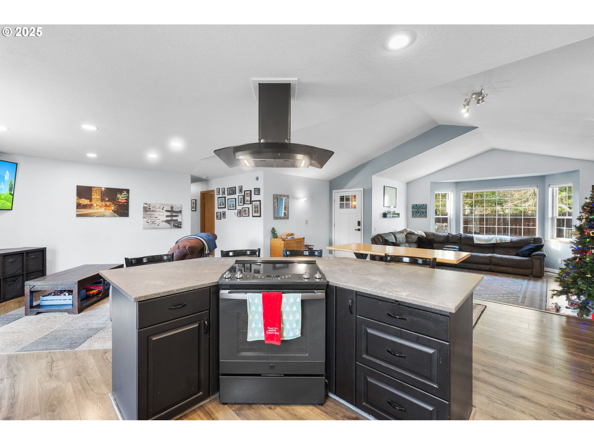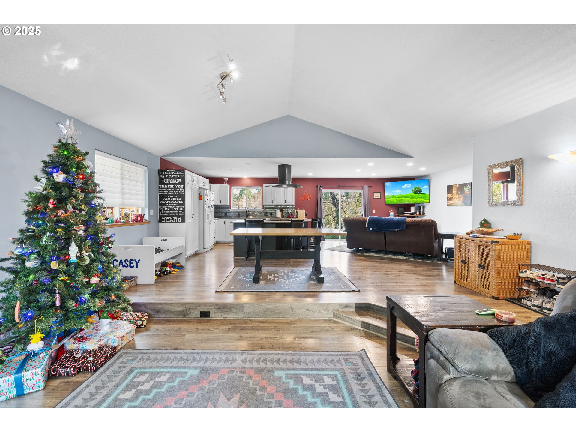 Spacious one-level home featuring vaulted ceilings and a functional open floor plan. Highlights include a living room with a bay window and fireplace, plus a primary suite with heated tile floors and private deck access. Enjoy the privacy of a home dead end on a private street, featuring a massive full-width deck and play structure. Includes full two car garage along with room for potential RV parking and a dedicated utility room.