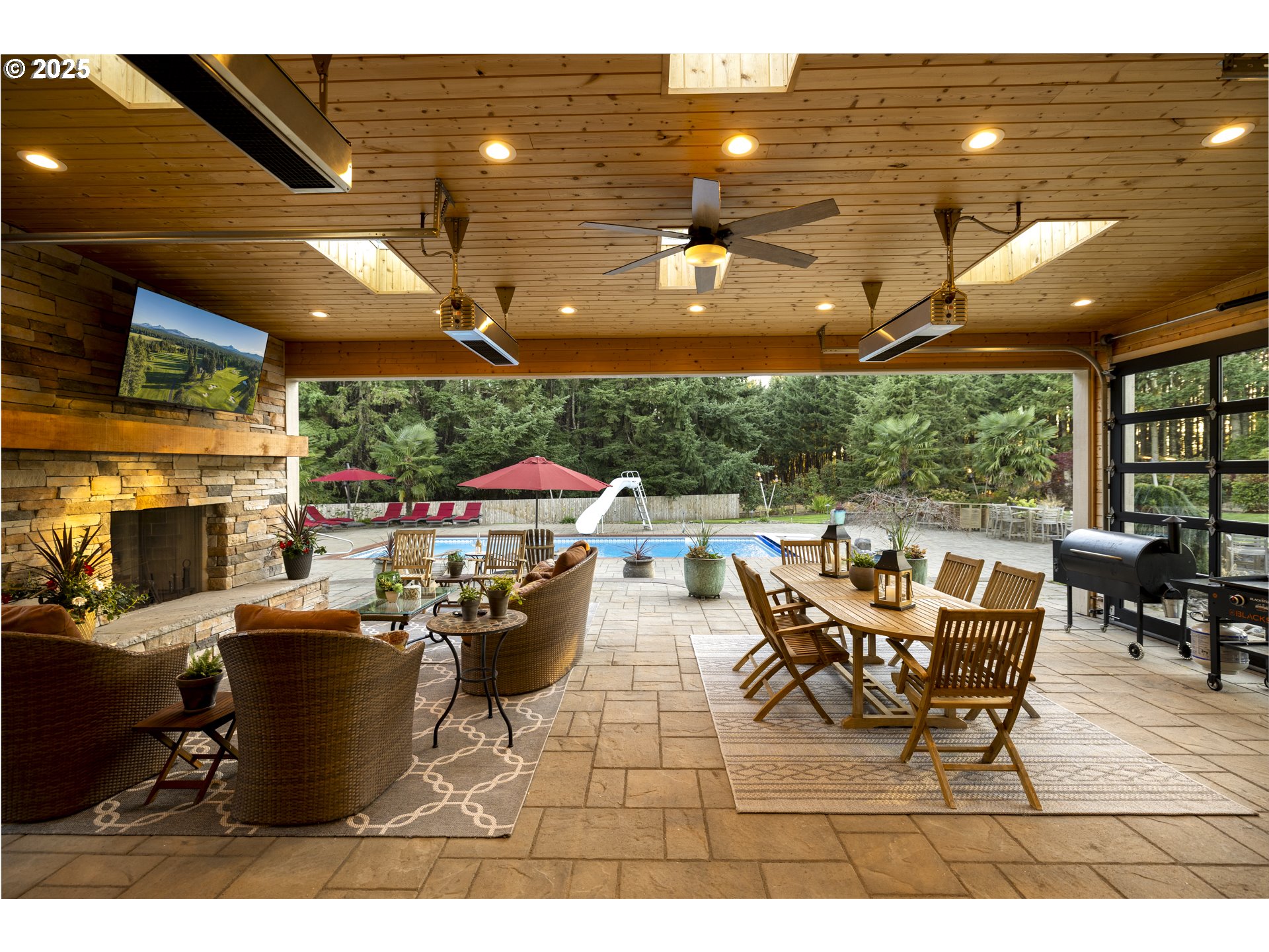Farm Resort Equestrian Estate on 6.54 Acres! A rare blend of country charm and resort-style living, this estate offers everything from equestrian excellence to effortless entertaining/events just minutes from town. The backyard is designed for relaxation and gatherings with an year-round expansive covered outdoor living space; with fireplace, infra red heaters, sprawling paver patio, in-ground pool, hot tub, outdoor sauna, and ambient lighting. Equestrian facilities include a 7-stall barn (5 with paddocks), a 70x120 indoor arena, heated tack room, wash station, hay loft with conveyor, LED lighting, and a 36x48 four-bay implement building. For the multi-hobby lifestyle, a massive 80x30 shop offers 220v power, covered parking, and RV hookups for water, sewer, and electricity; plenty of room for projects, storage, and adventure gear. Tucked privately behind the shop is a 2-bedroom ADU/guest house for added flexibility. The 4,133 SF home blends comfort and elegance with a gourmet kitchen featuring granite counters, Wolf induction cooktop, island, and breakfast nook; a spacious family room with gas fireplace; formal living and dining rooms with soaring ceilings; a main-level office overlooking pastoral views; and a well- equipped laundry with cabinetry and sink. Upstairs, the primary suite includes heated tile floors, a spa-style soaking tub, multi-spray shower, and oversized walk-in closet.Homestead touches include raised garden beds and a chicken coop, with potential income opportunities through boarding, shop rental, or Airbnb. Enjoy sweeping territorial views, stunning sunsets, and the convenience of being just 25 minutes from PDX. Bring your horses, cars, and guests. This farm resort is ready for its next chapter of unforgettable living.