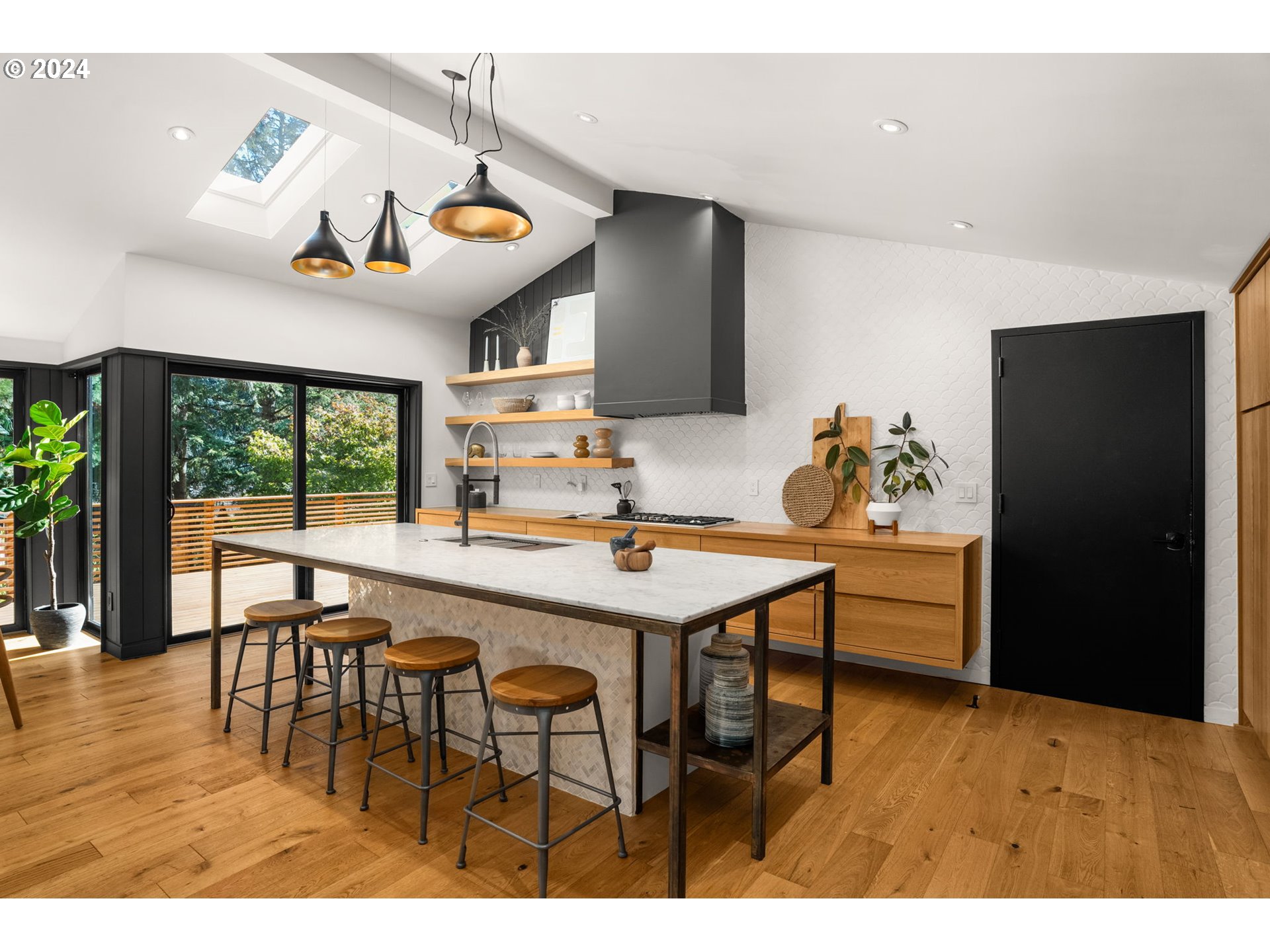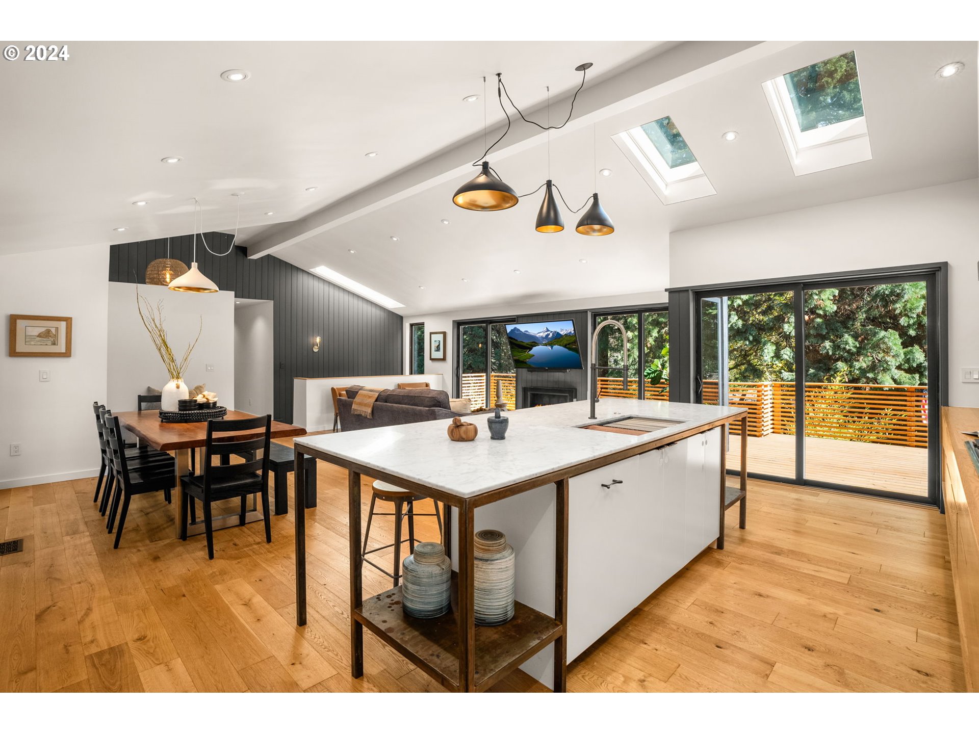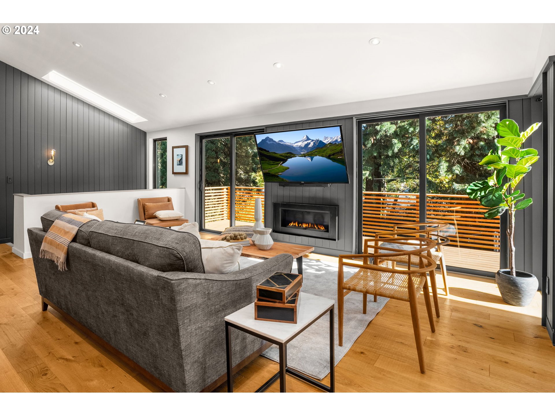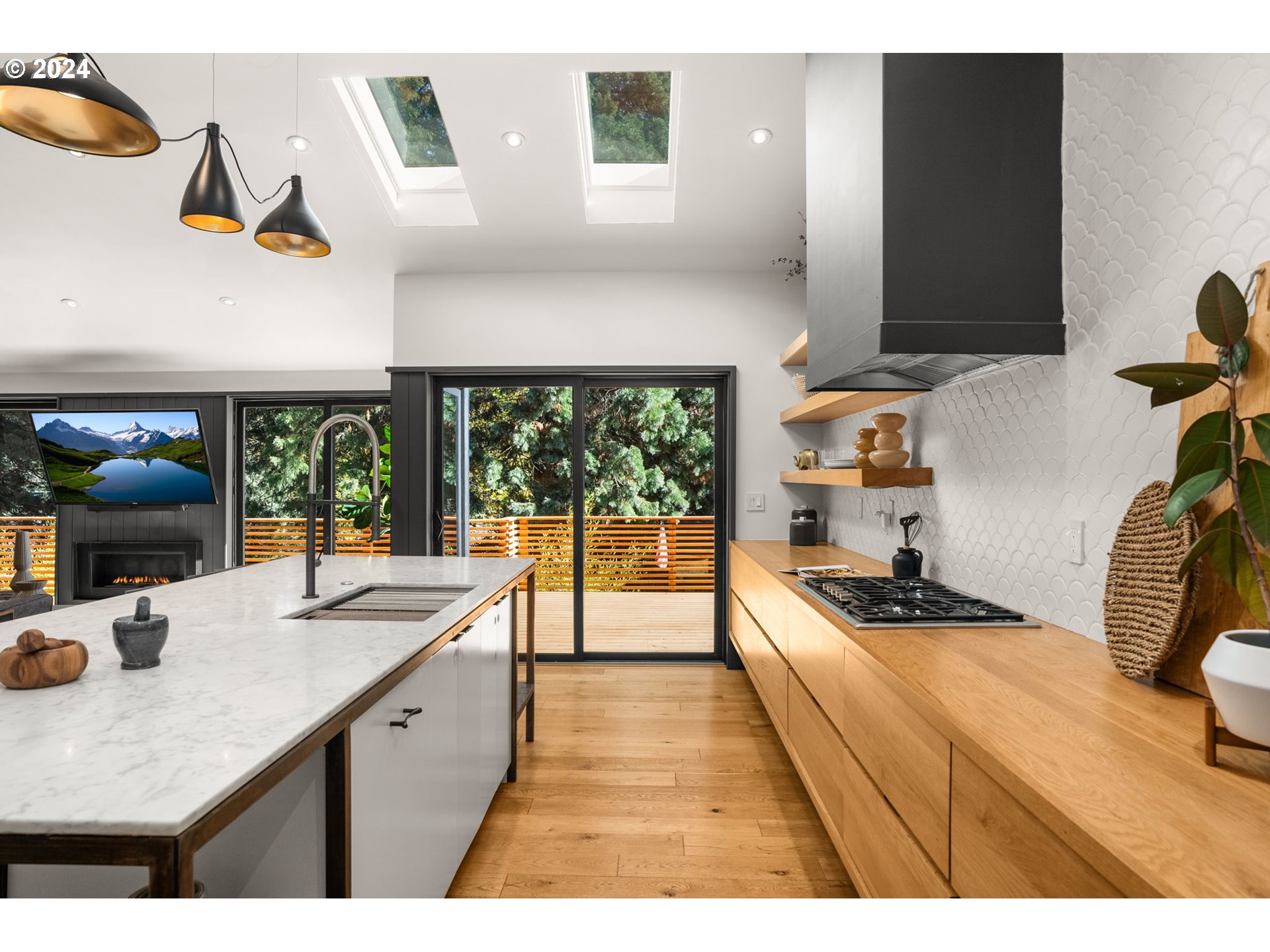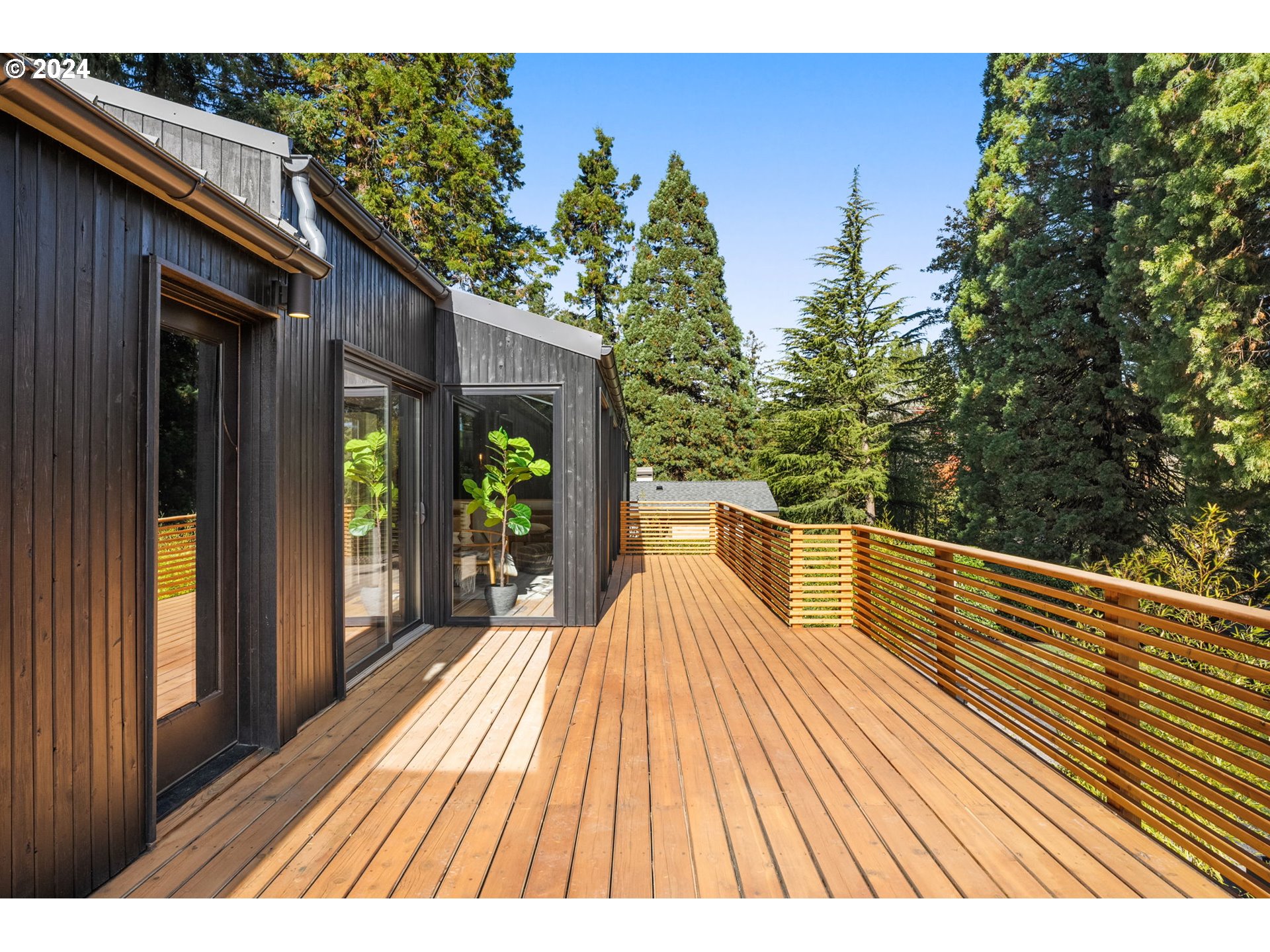 Modern contemporary design with exceptional architecture and stylish liveability that includes a private detached office/studio. The striking entry with cedar accents welcomes you to an open living area complemented by a wall of windows, fireplace, and built ins. Solid oak cabinets anchor the sleek kitchen featuring a spacious marble island with room for seating. Floating cabinets and shelves flank the 6-burner range with custom hood. Floor to ceiling windows and sliders connect you to the outdoors and open to an expansive deck and flat back yard. Wide plank hardwood floors and a myriad of designer touches. Main floor primary suite with luxurious master bath and walk-in closet. The lower level has 2 additional bedrooms, large family room with fireplace and built-in wet bar along with ample space for impromptu gatherings, crafts, hobbie