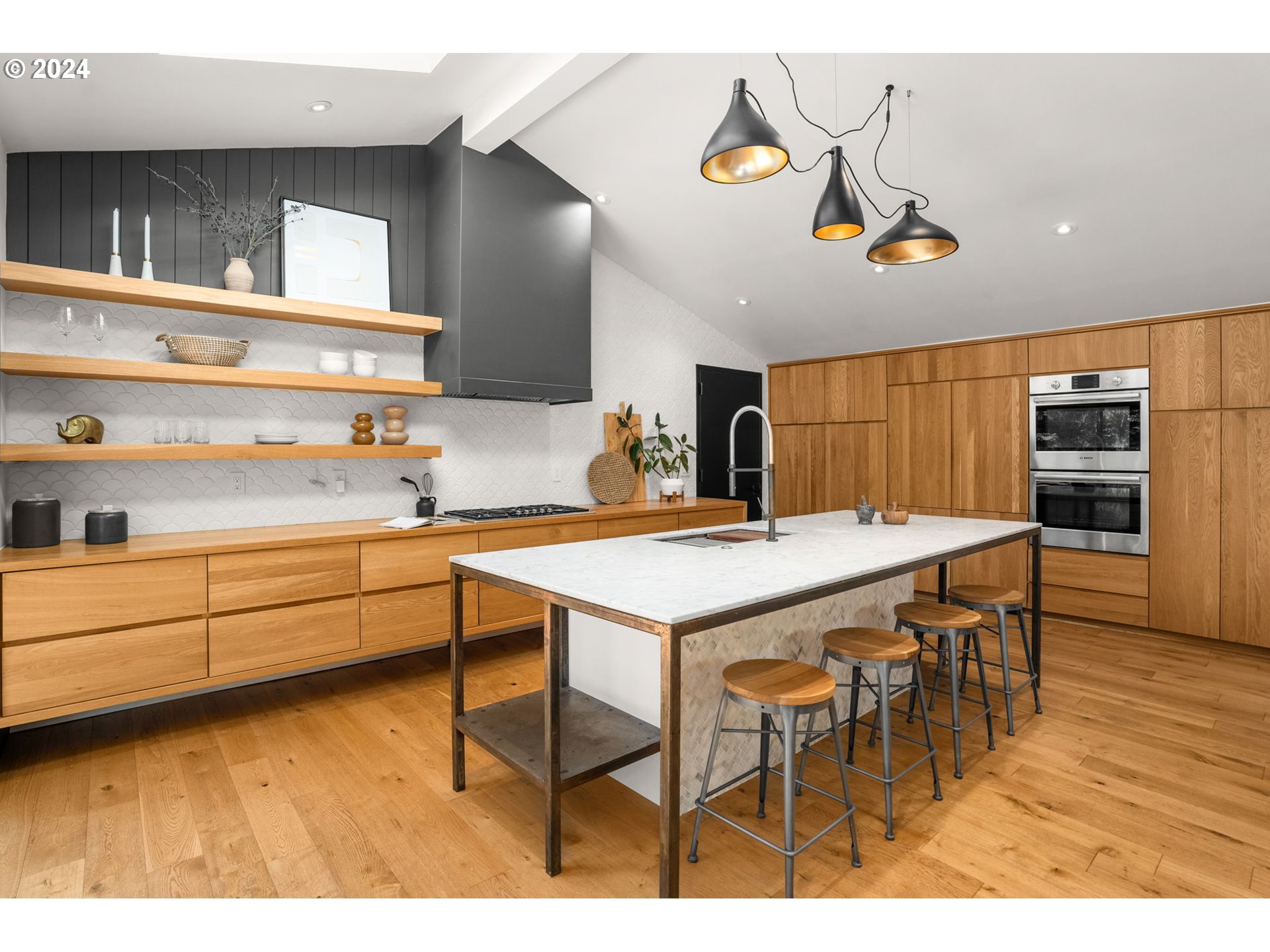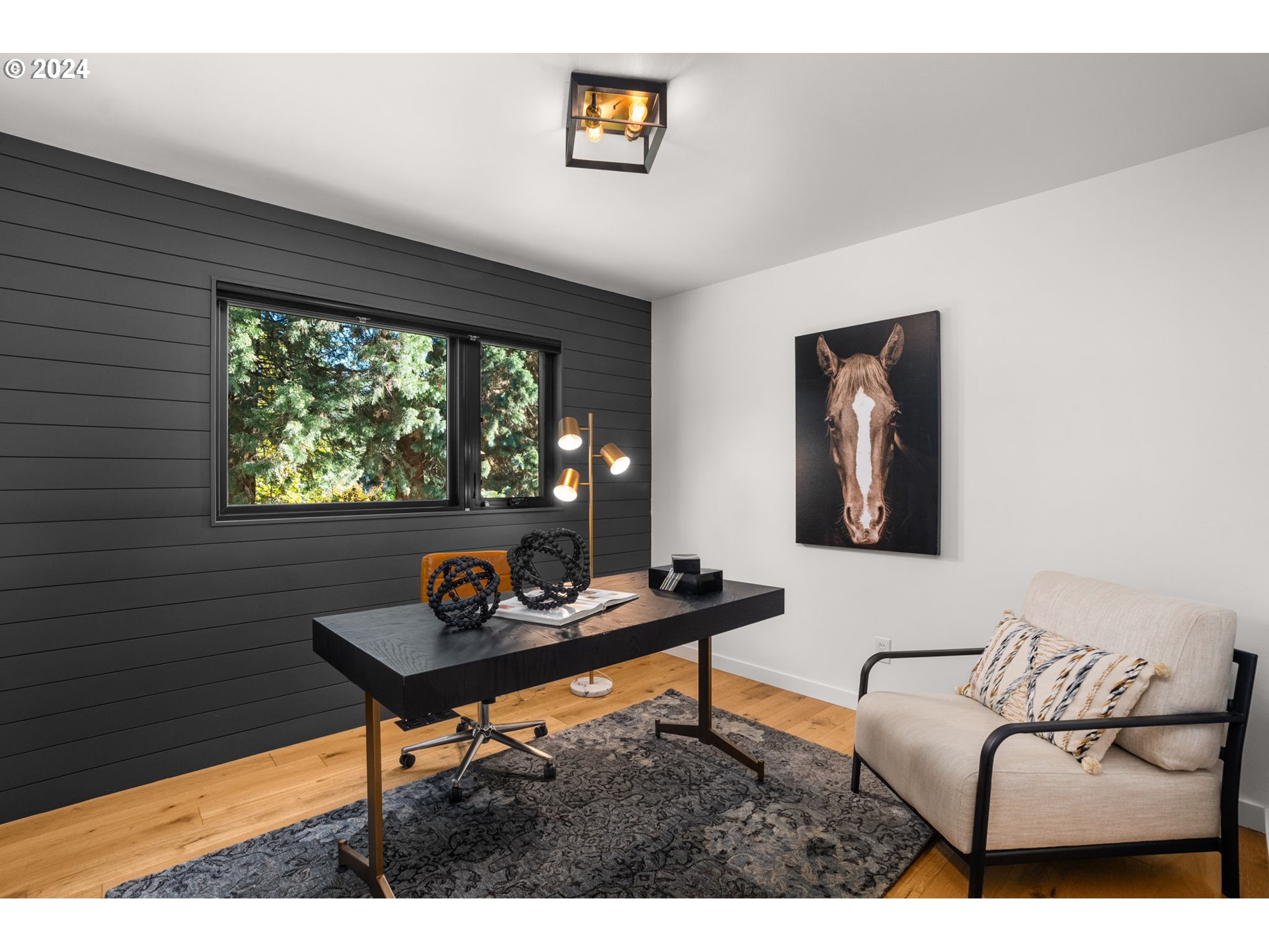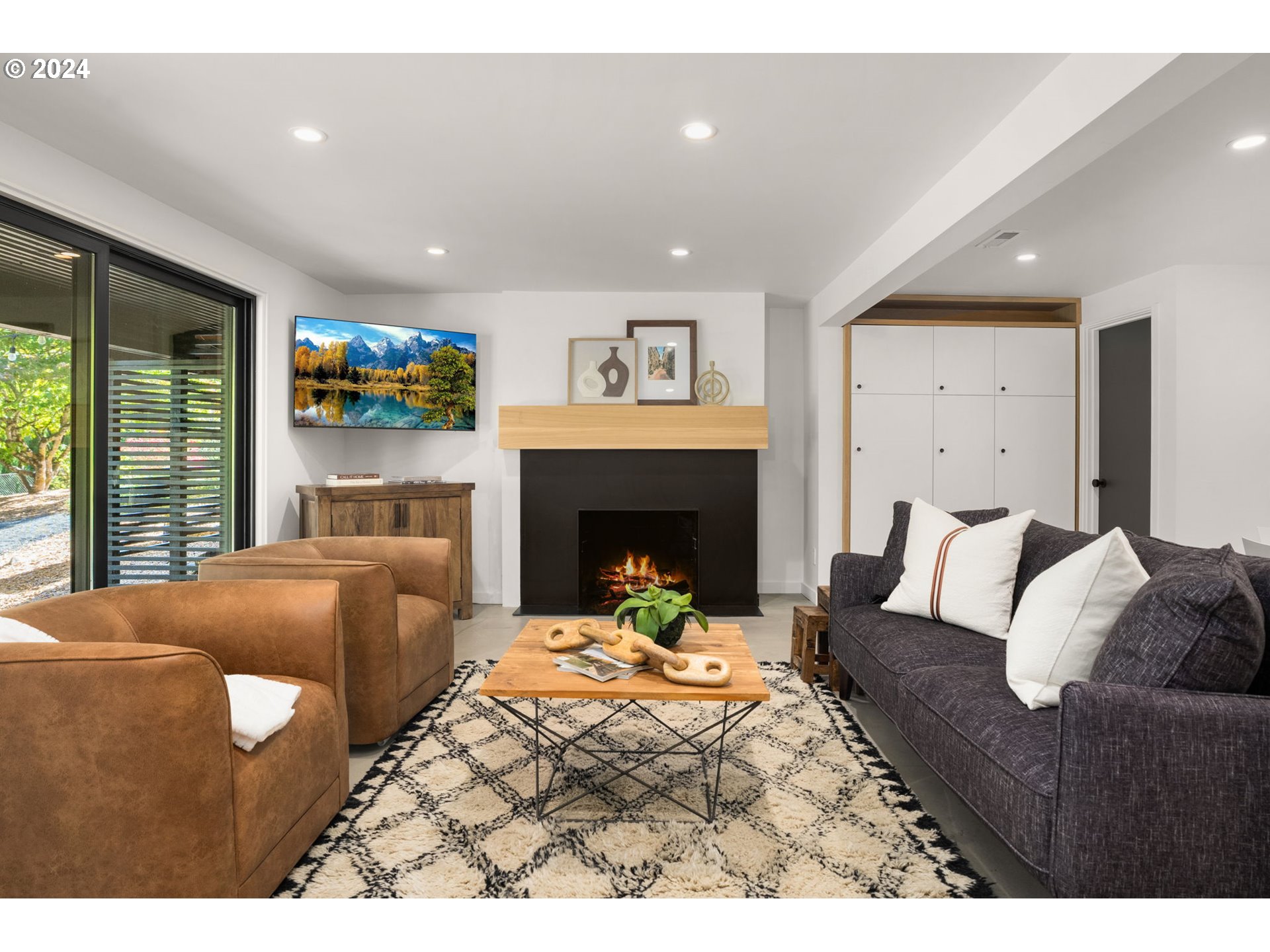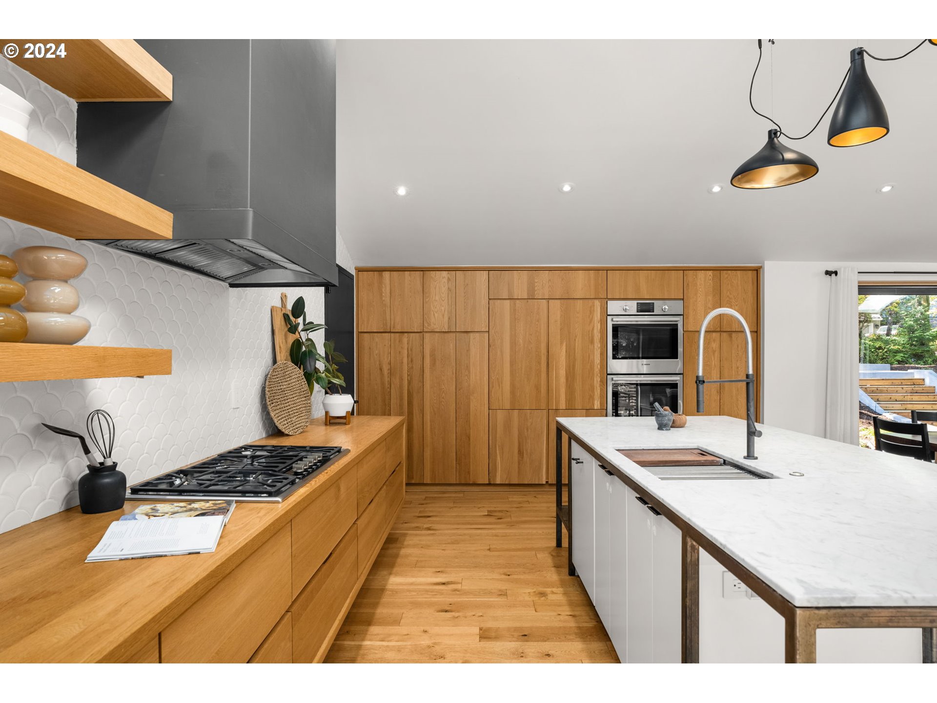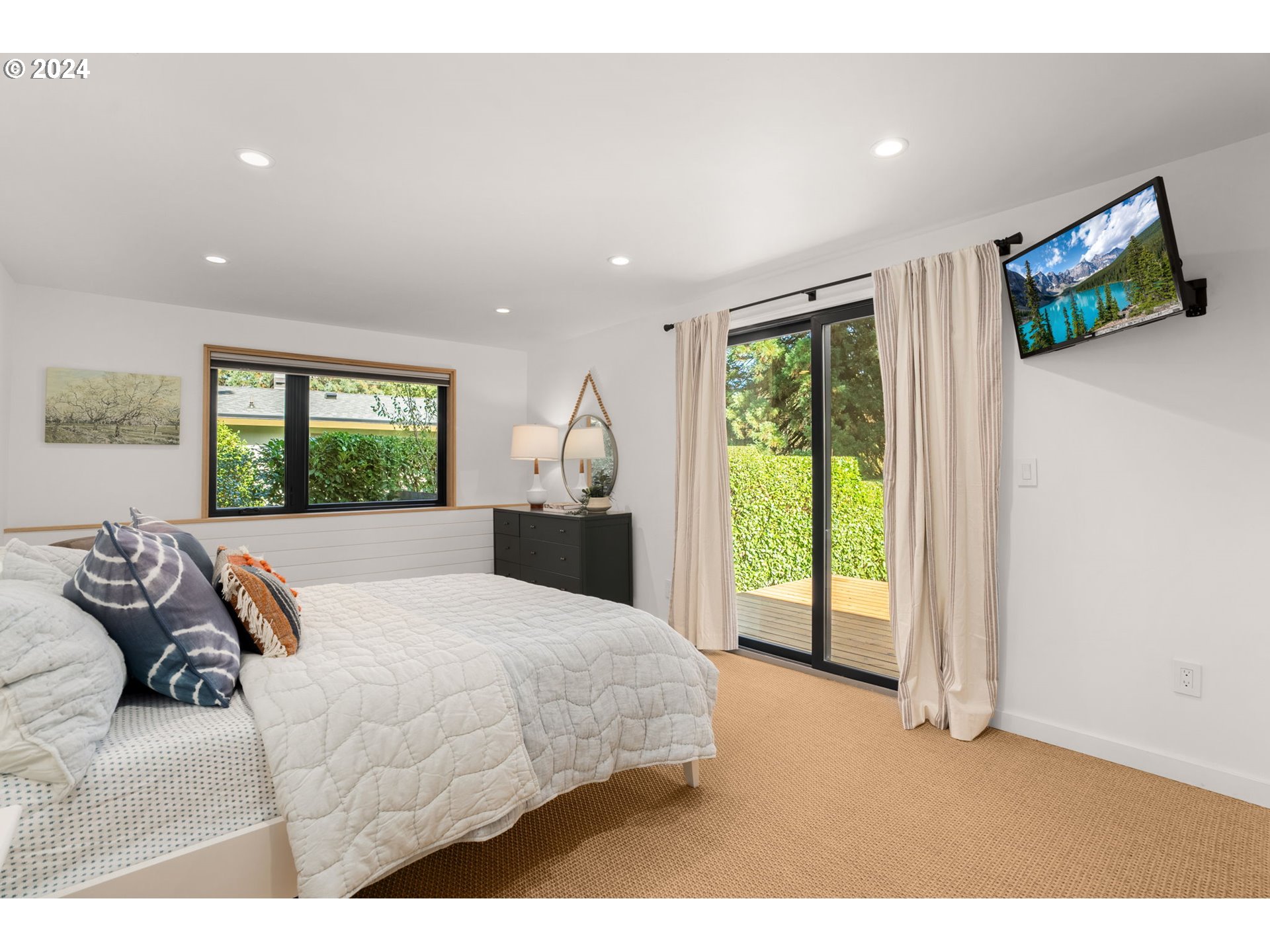 Modern contemporary design with exceptional architecture and stylish liveability that includes a private detached office/studio. The striking entry with cedar accents welcomes you to an open living area complemented by a wall of windows, fireplace, and built ins. Solid oak cabinets anchor the sleek kitchen featuring a spacious marble island with room for seating. Floating cabinets and shelves flank the 6-burner range with custom hood. Floor to ceiling windows and sliders connect you to the outdoors and open to an expansive deck and flat back yard. Wide plank hardwood floors and a myriad of designer touches. Main floor primary suite with luxurious master bath and walk-in closet. The lower level has 2 additional bedrooms, large family room with fireplace and built-in wet bar along with ample space for impromptu gatherings, crafts, hobbie