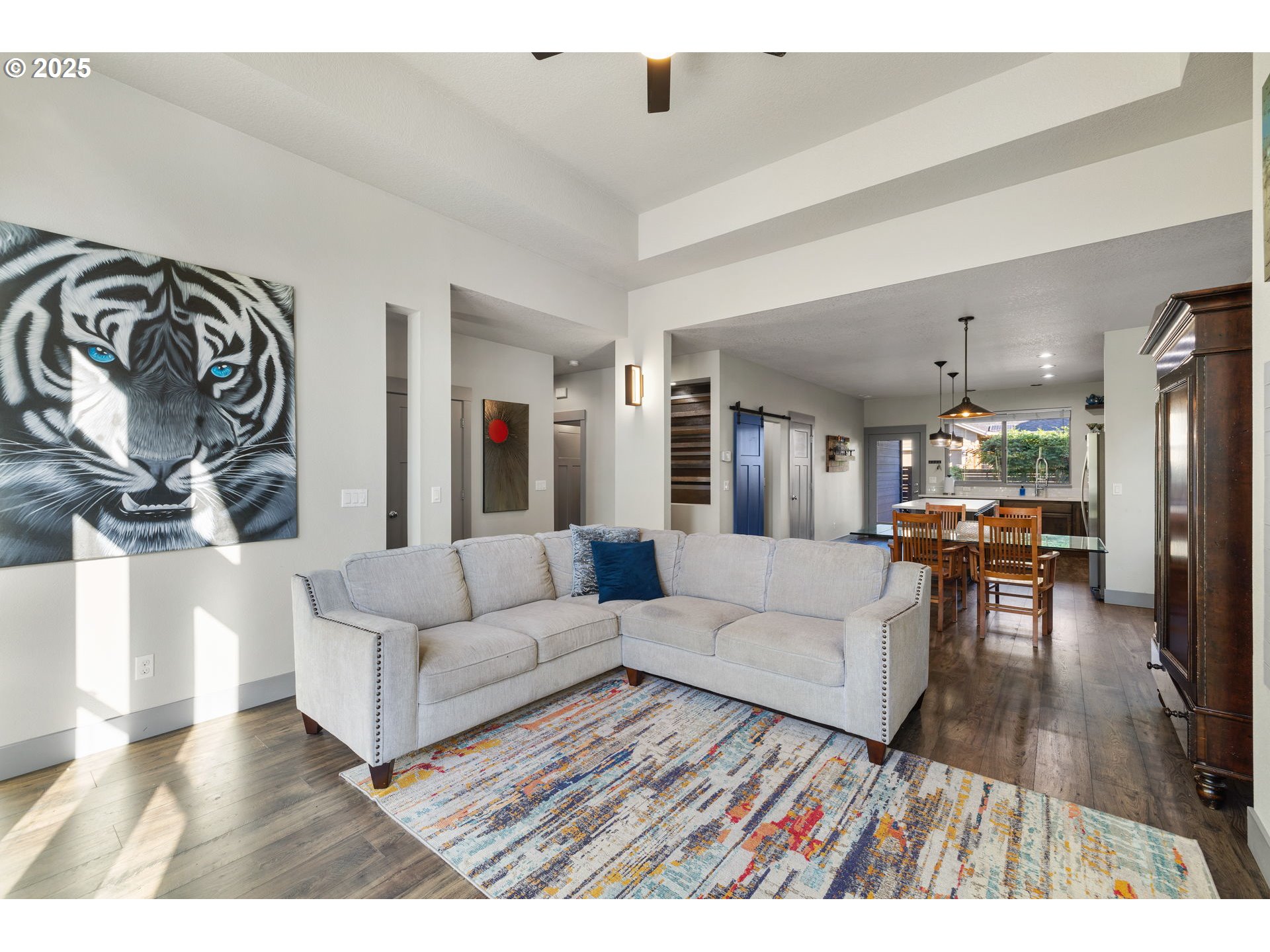 OPEN HOUSE SUNDAY 12-2PM. Custom built Contemporary style home w/covered front patio, 4 lg bedrooms, 3.1 bathrooms. Living room w/gas fireplace, laminate floors, ceiling fan and high ceiling. Kitchen w/island, walk-in pantry, stainless appliances all stay, laminate floors, quartz countertops. Bedroom or office on main floor w/closet. Master suite w/walk-in closet, double sinks, shower, tub, ceiling fan. Vaulted 22x18 family room/game room on 3rd floor has full bathroom w/walk in closet or 2nd storage area, could be used as 5th bedroom. Extra 15x11 bonus room for storage or kids play area. Utility room w/built-ins w/tile floors. Fenced back yard w/covered patio, 2 car garage w/parking in driveway and front of home, Alley way in back good place for kids to ride bikes. Walking distance to parks, walking trails at Clackamas Community College and Saturday Market, also dog park. new AC 2022.