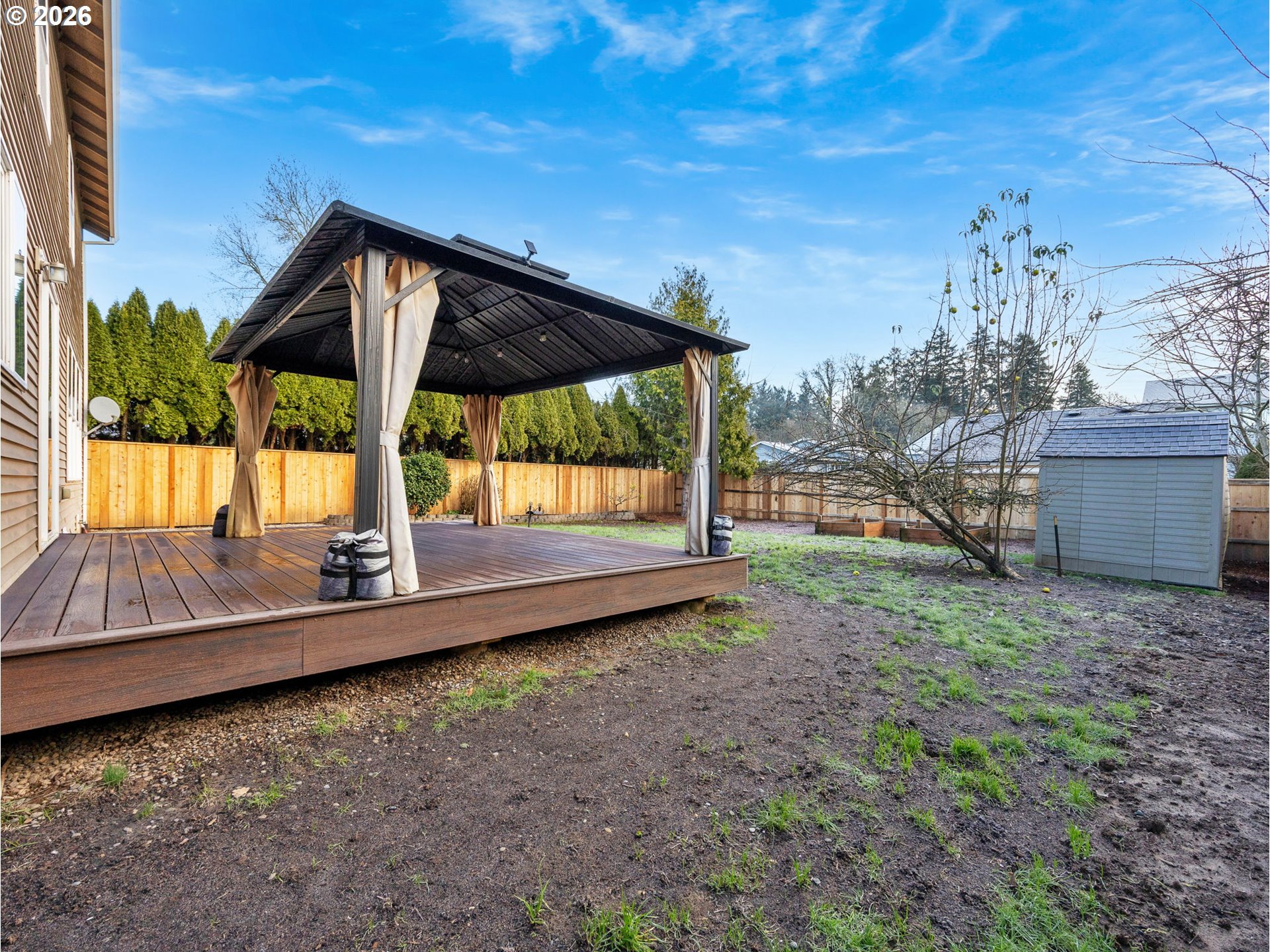 Deck, Fenced, Garden, Gazebo, Patio, Porch, Sprinkler, ToolShed, Yard