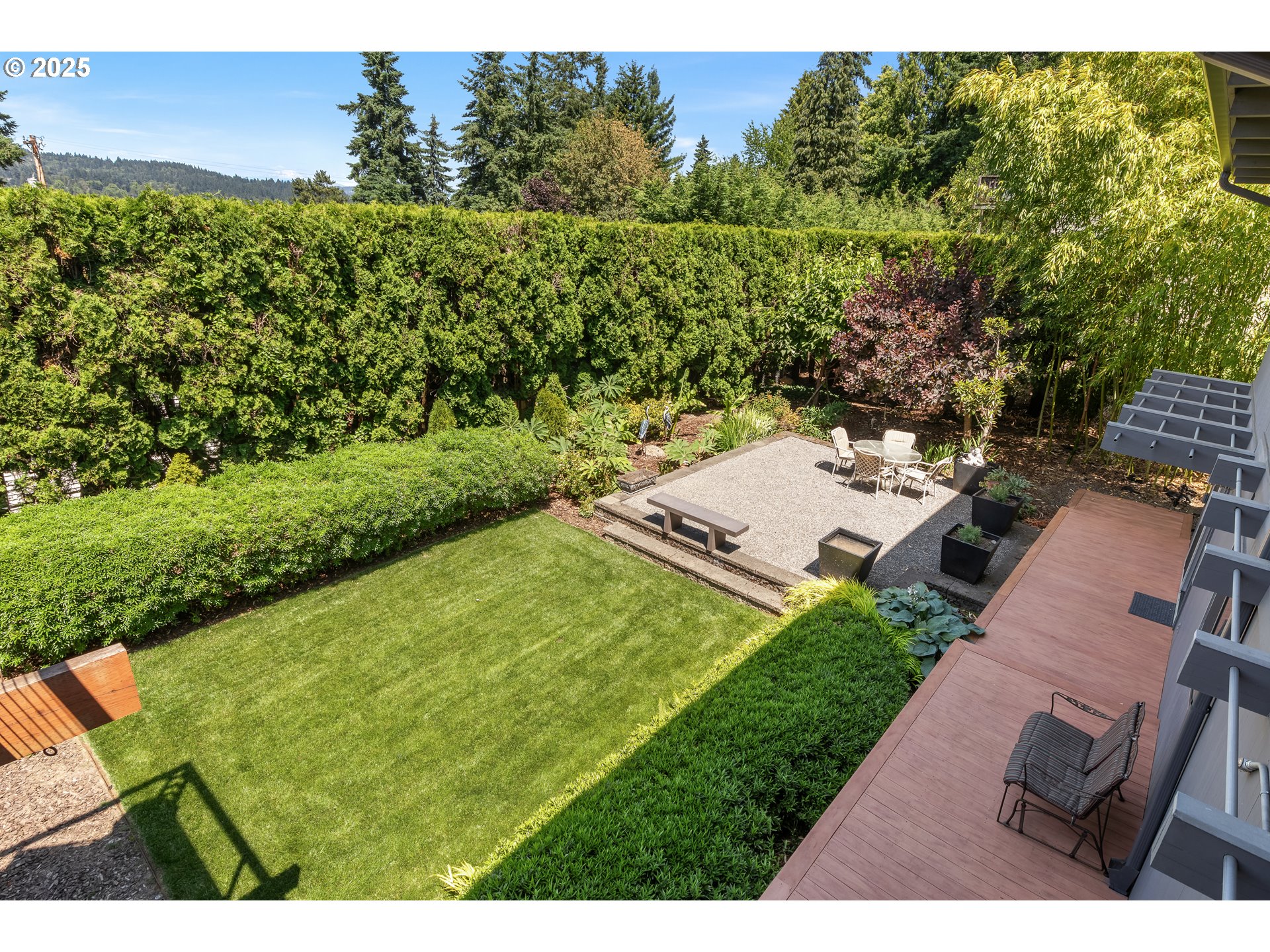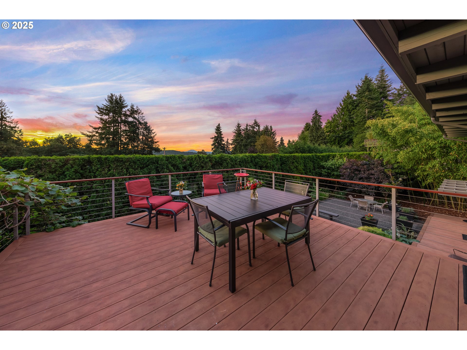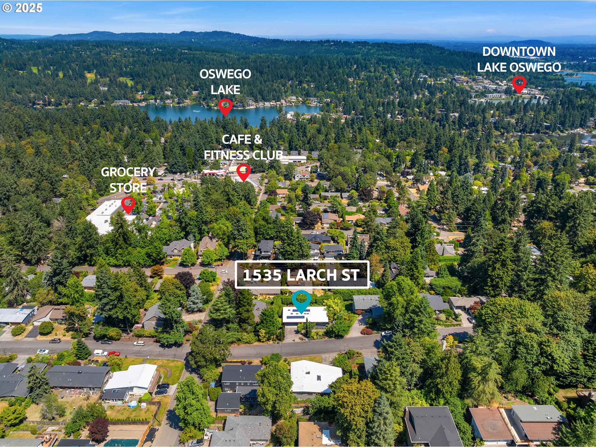 Private oasis with views in Lake Oswego! This updated mid-century modern gem offers both serenity and style. Just two short blocks from New Seasons and a few minutes from Lakeridge High School, parks, restaurants, and the new rec center, it's situated near the most desirable amenities in the city. Multiple options for home offices, making working from home a breeze. A four-foot-wide front door opens to a light-filled living space, where a wall of picture windows frame beautiful views of the hills to the north and Mt. St. Helens beyond. The open-concept main level highlights natural materials- an exposed wood ceiling, clean lines, and a striking nearly 17-foot waterfall island with 2 dishwashers. A glass door leads to a spacious deck overlooking the fully fenced, manicured backyard bordered by mature arborvitae. The setting is private, peaceful, and designed for both entertaining and relaxation. Two main-level bedrooms include en suite baths. The daylight basement offers a second living area with wet bar and backyard access. A large laundry room includes built-ins and a closet, while three separate storage areas ensure space for everything from garden tools to paddleboards. New roof, newer HVAC, updated baths, leased solar with low utilities, and more. Set on a lush 10,000 sq ft lot in a prime location, within 5 minutes of Lake Oswego Recreation and Aquatics Center and LO Public Golf Course (0.9 miles), Lakeridge High School (1.3 miles), Luscher Farm (1.5 miles), Hazelia Field with dog park (1.1 miles), George Rogers Park and the Willamette River (1.1 miles), Aspen Park (0.1 miles) Freepons Park (0.4 miles), and close to a hub of shops and cafes. Swanky and cool, it offers the benefits of condo-style living without the fees.