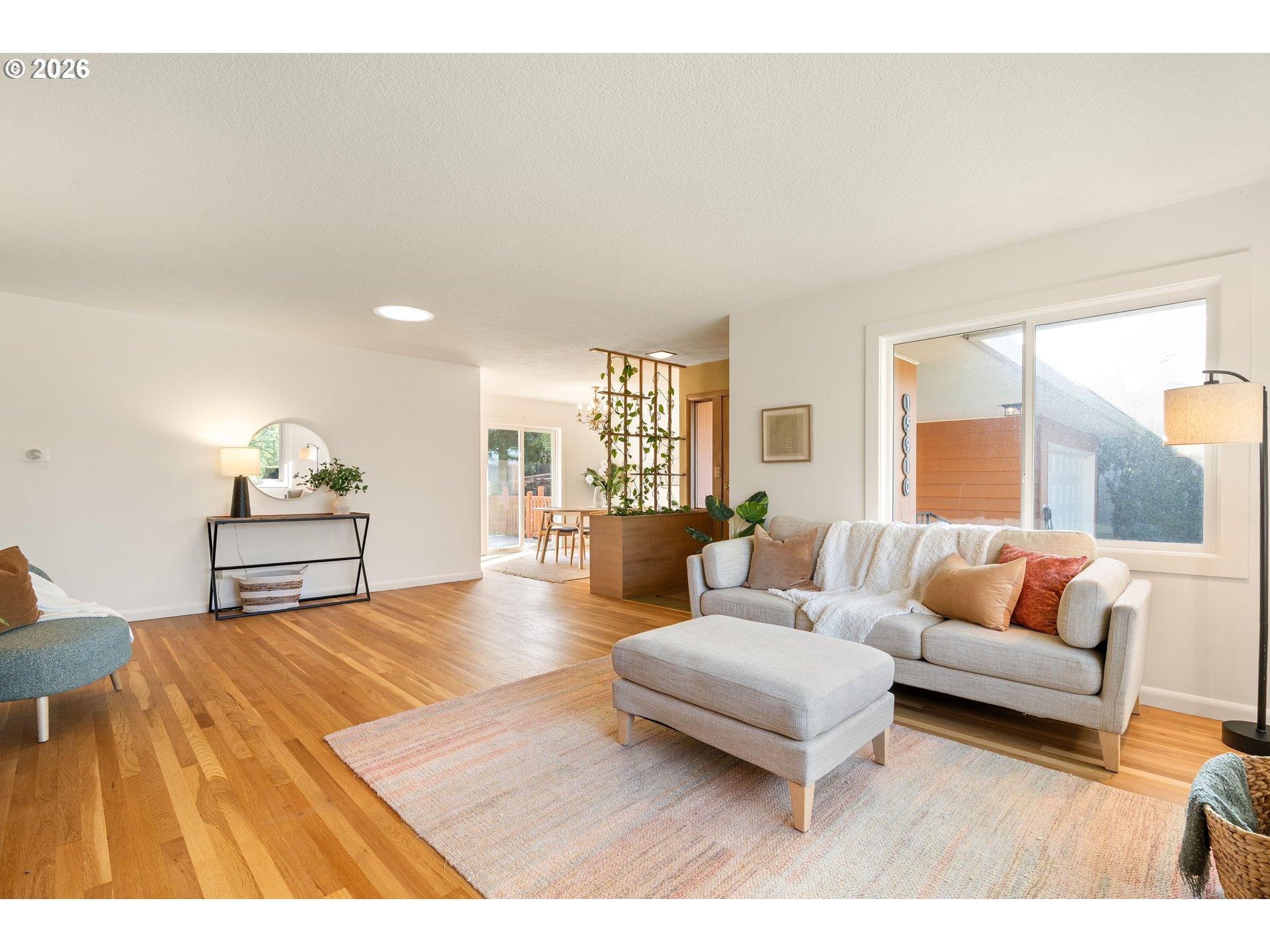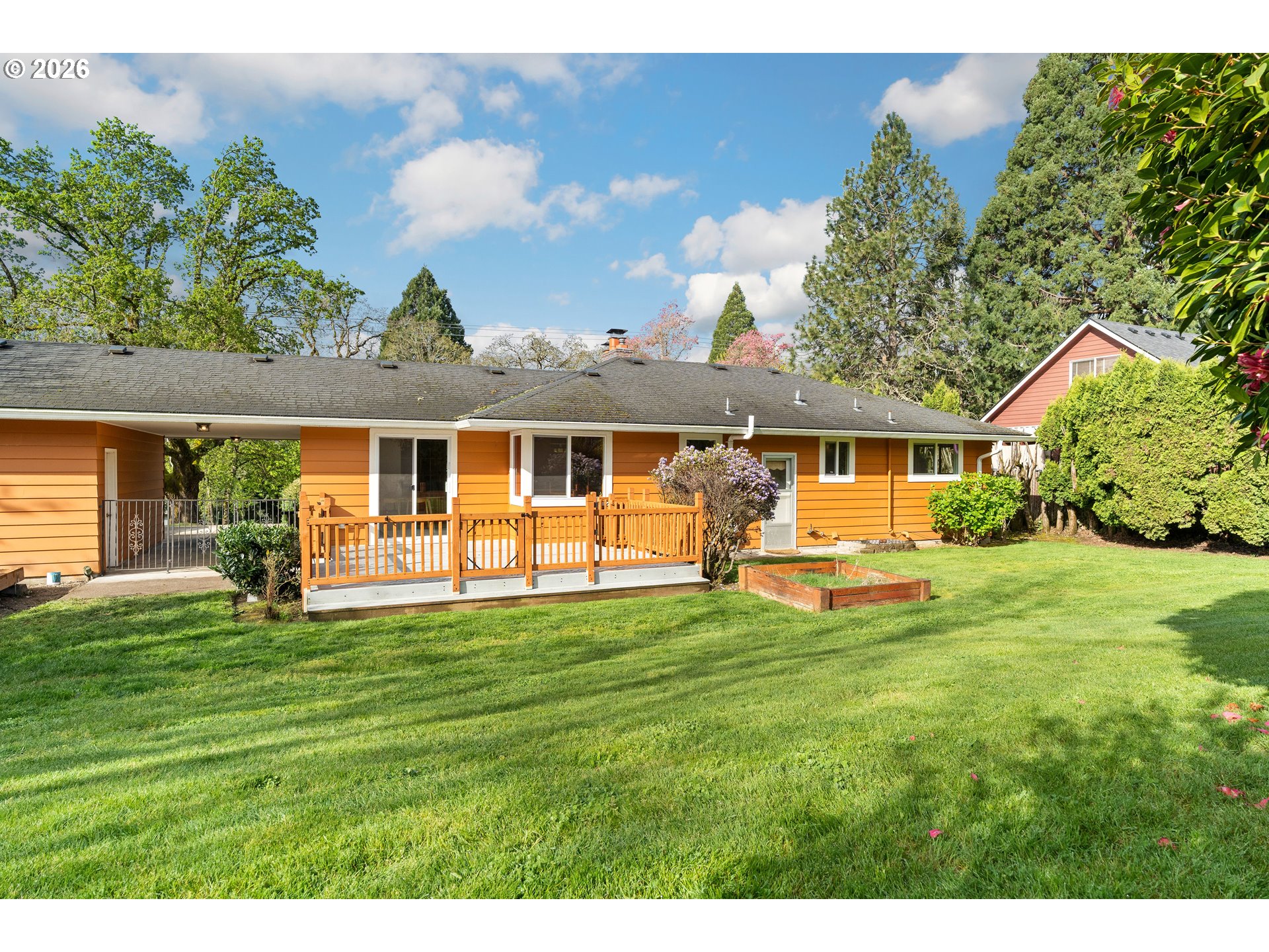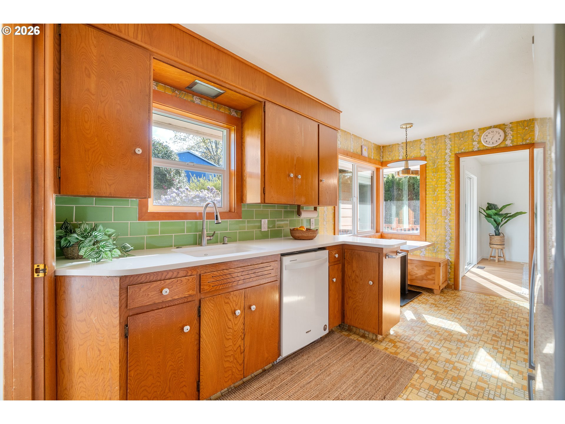 Everyone loves a mid-century home, and for good reason. Built with old growth timber, functional layouts, and beautiful wood floors, these homes offer warmth and character that is hard to replicate.This classic ranch sits on a large lot and welcomes you with a spacious driveway, charming front porch, and built-in flower bed. A breezeway connects the home to the detached two-car garage. Inside, the entry features a built-in planter, climbing vines, original wood divider, and coat closet.The living room is anchored by a quintessential 50s brick fireplace and filled with natural light from west- and south-facing picture windows. Enjoy views of the Southwest Hills across the Willamette River. A formal dining room and cozy kitchen nook provide flexibility, while the kitchen stays true to its era with charming wallpaper and original cabinetry, complemented by updated countertops, sink, and backsplash.With five bedrooms, three on the main and two downstairs, this home offers excellent flexibility. The lower level includes a spacious family room, updated bathroom, laundry room, and a fifth bedroom or office. Original built-ins add both charm and function, and the classic pink tile in the bathroom preserves its mid-century character.Major updates include new PEX plumbing, sewer and water lines, water heater, and electrical panel with garage subpanel. The home also features central A/C, radon system, EV charger, foundation strapping, and sump pumps.Additional improvements include new windows and trim, solar tubes, updated basement lighting, egress windows, fenced back patio, new gutters, newer driveway slab, exterior paint (2023), and a powered garage door opener.A rare opportunity to own a mid-century home with thoughtful modern updates.