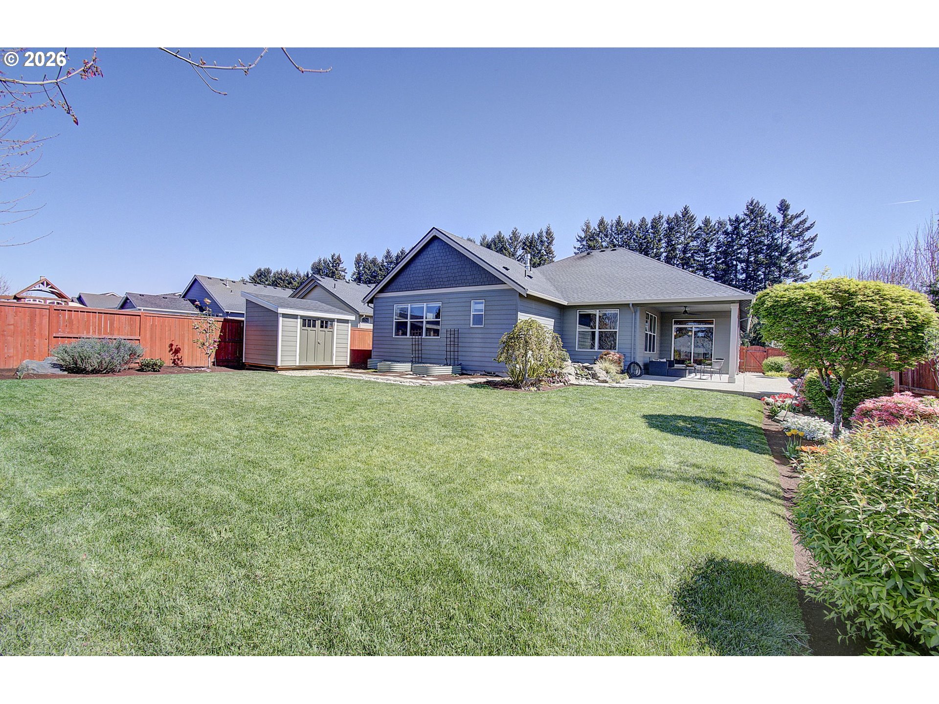 OPEN HOUSE SAT 4/11 AND SUN 4/12 @ 1-3 PM! Step into this meticulously maintained 2019-built home in desirable Abernethy Landing, offering easy single-level living with modern upgrades. This 3-bedroom, 2-bath home spans 2,122 sq ft on a 0.23-acre lot, featuring a bright open layout with vaulted and 9-foot ceilings. The kitchen is ideal for everyday living and entertaining with quartz countertops, soft-close cabinetry, stainless steel appliances, gas cooktop, pantry, and a large island. The spacious primary suite includes dual sinks, a walk-in shower, and a large walk-in closet. Enjoy added efficiency and peace of mind with central A/C, solar panels, and a backup emergency battery. The 2-car garage features an epoxy floor, plus exterior conveniences like hot/cold water and a holiday lighting outlet. The fully fenced backyard is low-maintenance and beautifully landscaped with a covered patio, tool shed, water feature, irrigation system, and mature trees and plantings. Low HOA of $40/month and a prime location near parks, schools, and shopping complete this exceptional offering. All appliances, including washer and dryer, are included.