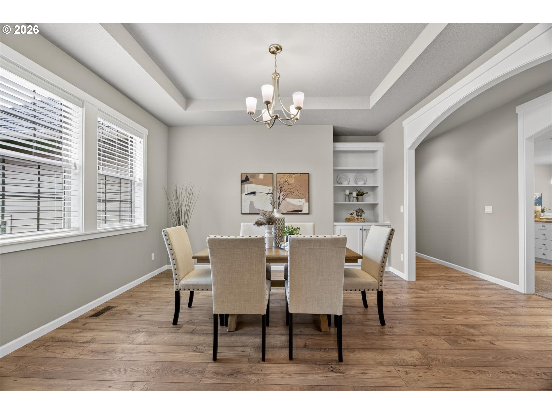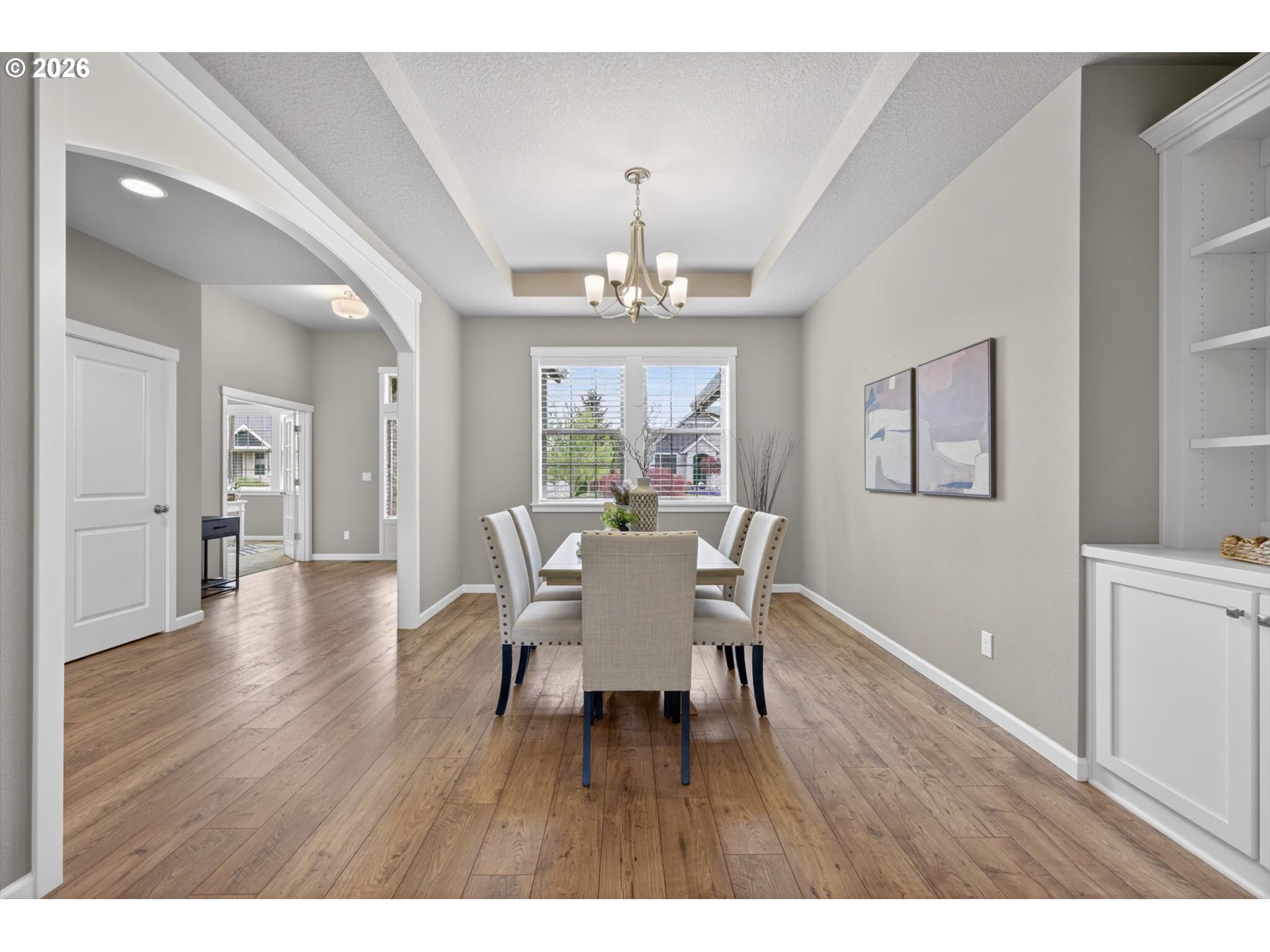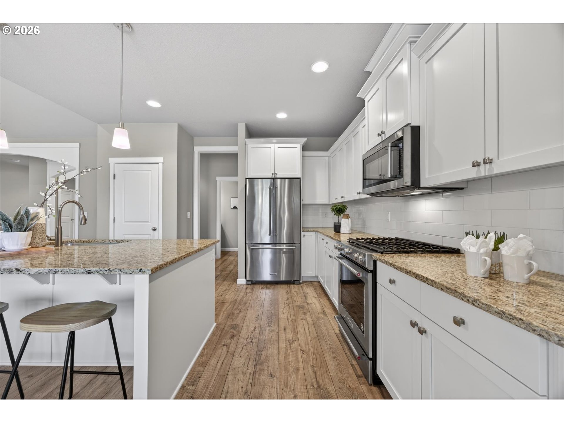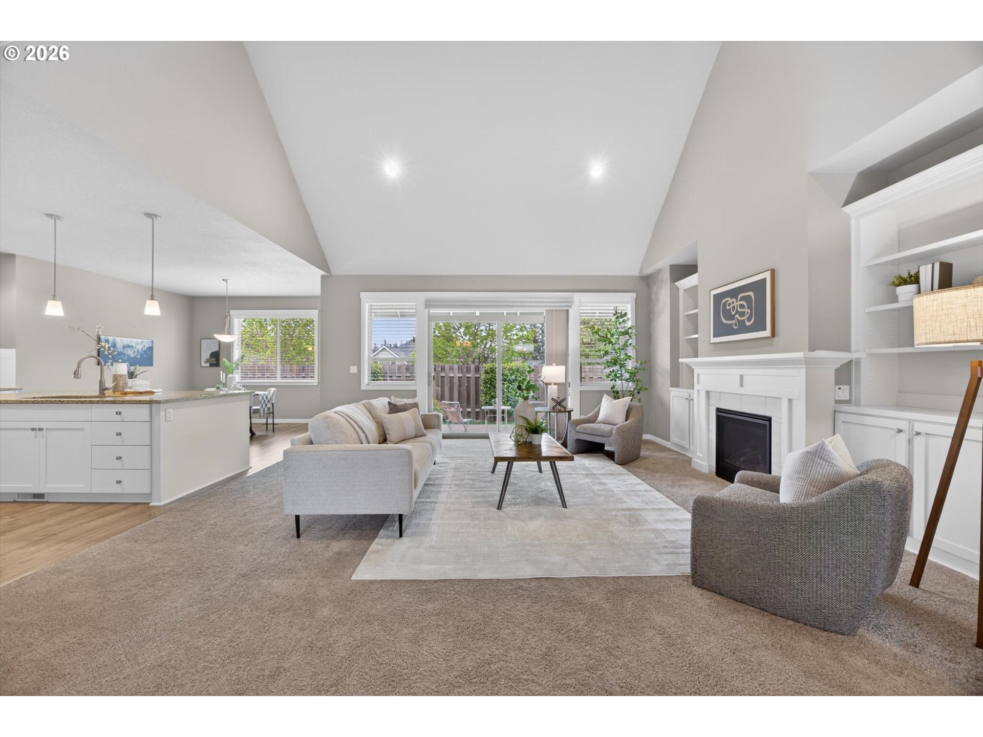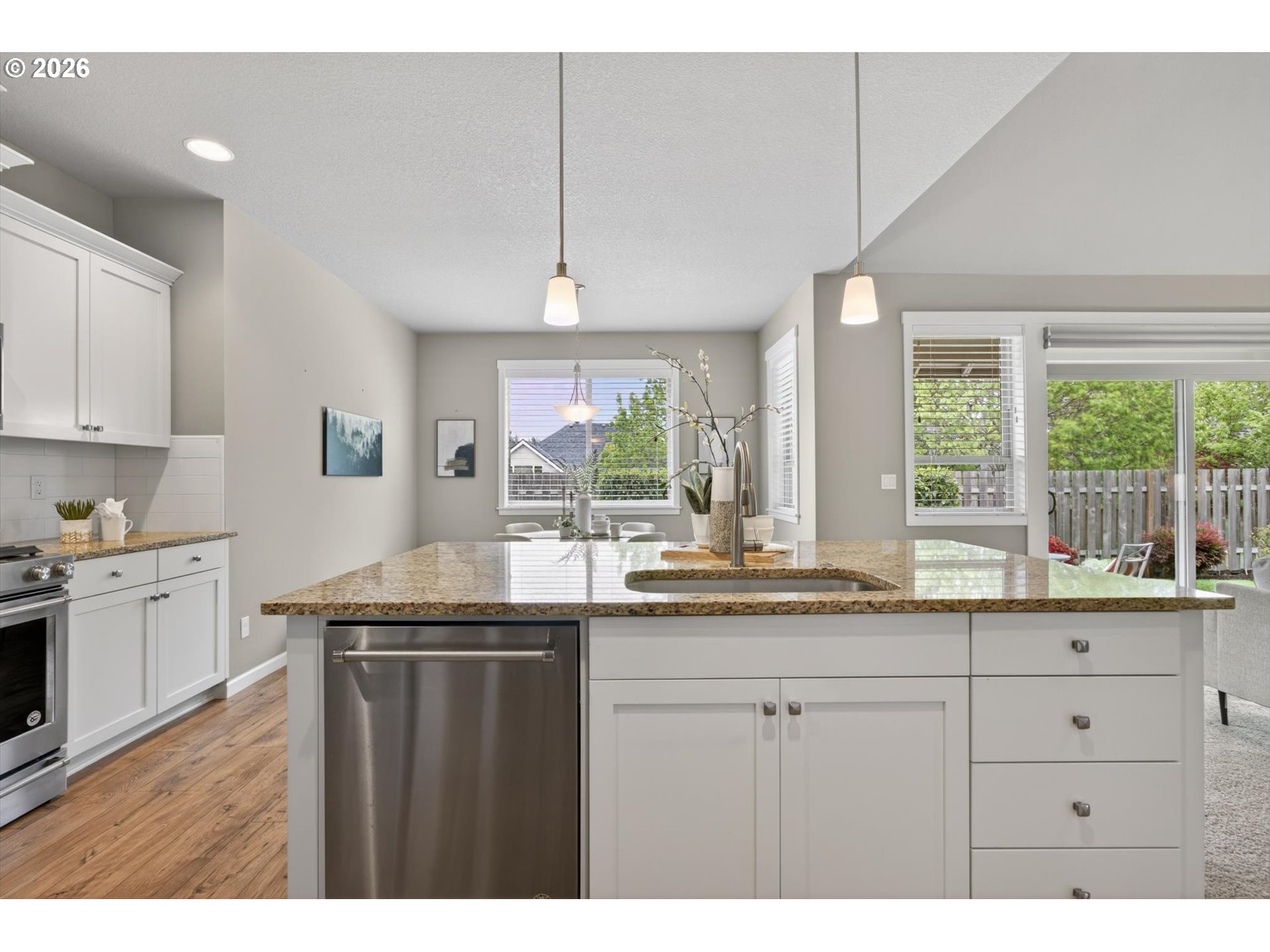 Immaculate single level home backing to nature pathway. Over 2550sf. Spacious living with vaulted ceilings. Great room floor plan. Main-level primary suite with spa-like bath, two additional bedrooms, and a den/office/4th bedroom. Gourmet kitchen with slab granite, island, pantry and sunny eating nook opens to vaulted great room with custom built-ins and cozy fireplace. Slider to covered patio. Spacious 3 car garage, tankless water heater, 95% efficient furnace, level yard with irrigation. mins to downtown Canby, Wait Park and Moalla River State Park