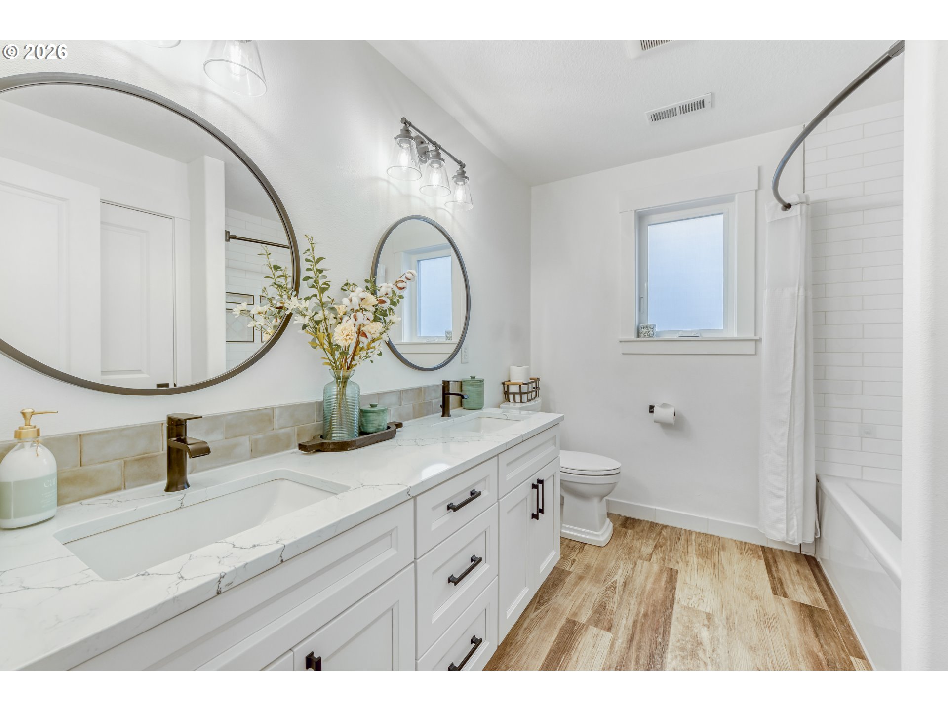 Stunning newer construction in Oregon City! This beautifully maintained 3-bedroom, 2.5-bath home offers 1,632 sq ft of light-filled living space on a flat, easy-to-care-for lot. Built in 2021 and meticulously kept, the home still feels like new with thoughtful upgrades and quality finishes throughout.The main level features an inviting, open layout with beautiful vinyl plank flooring, a cozy gas fireplace, and abundant natural light. The kitchen is a standout with quartz countertops, a gorgeous tile backsplash, and a functional design that flows seamlessly into the dining nook—perfect for everyday living and entertaining.Upstairs, the primary suite offers a relaxing retreat with a beautiful ensuite bathroom, walk-in shower, and generous walk-in closet. Two additional bedrooms, a full bath with quartz counters and double sinks, and a conveniently located laundry room complete the upper level.Step outside to enjoy the covered back patio and flat, easy-to-care-for backyard—ideal for year-round use. Enjoy the added convenience of a 2-car garage and large RV parking with hookups.This move-in ready home combines modern style, comfort, and functionality in a well-situated Oregon City location with easy access to everyday amenities.