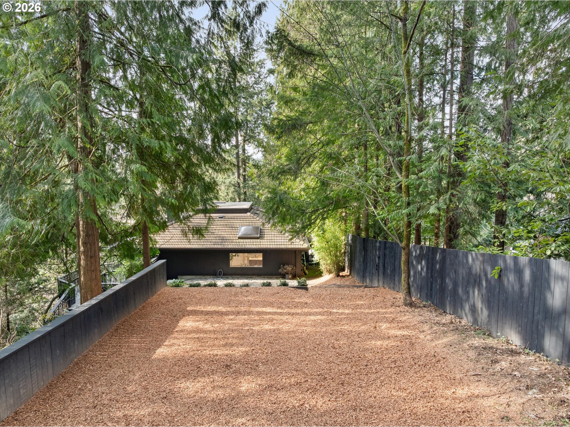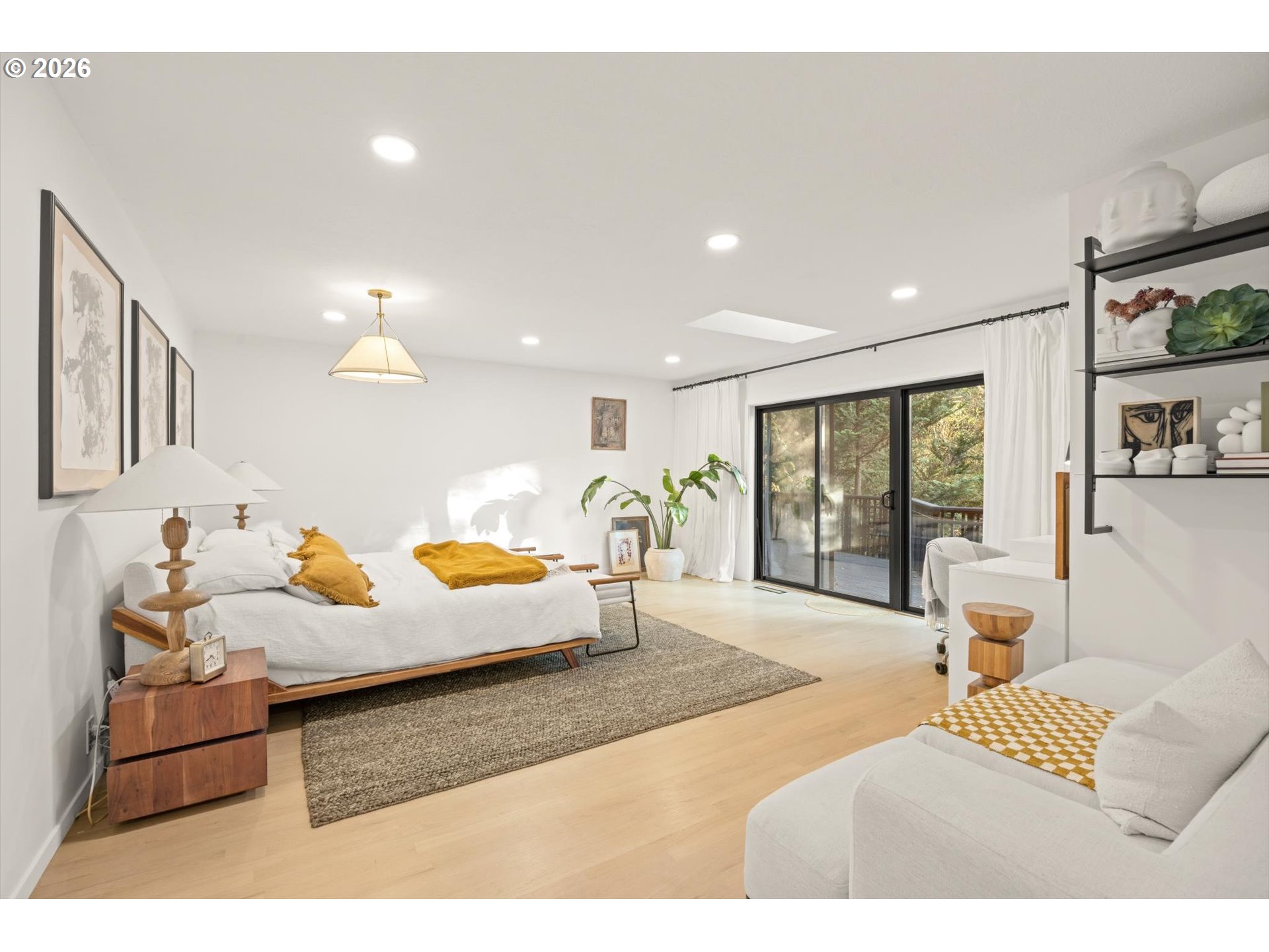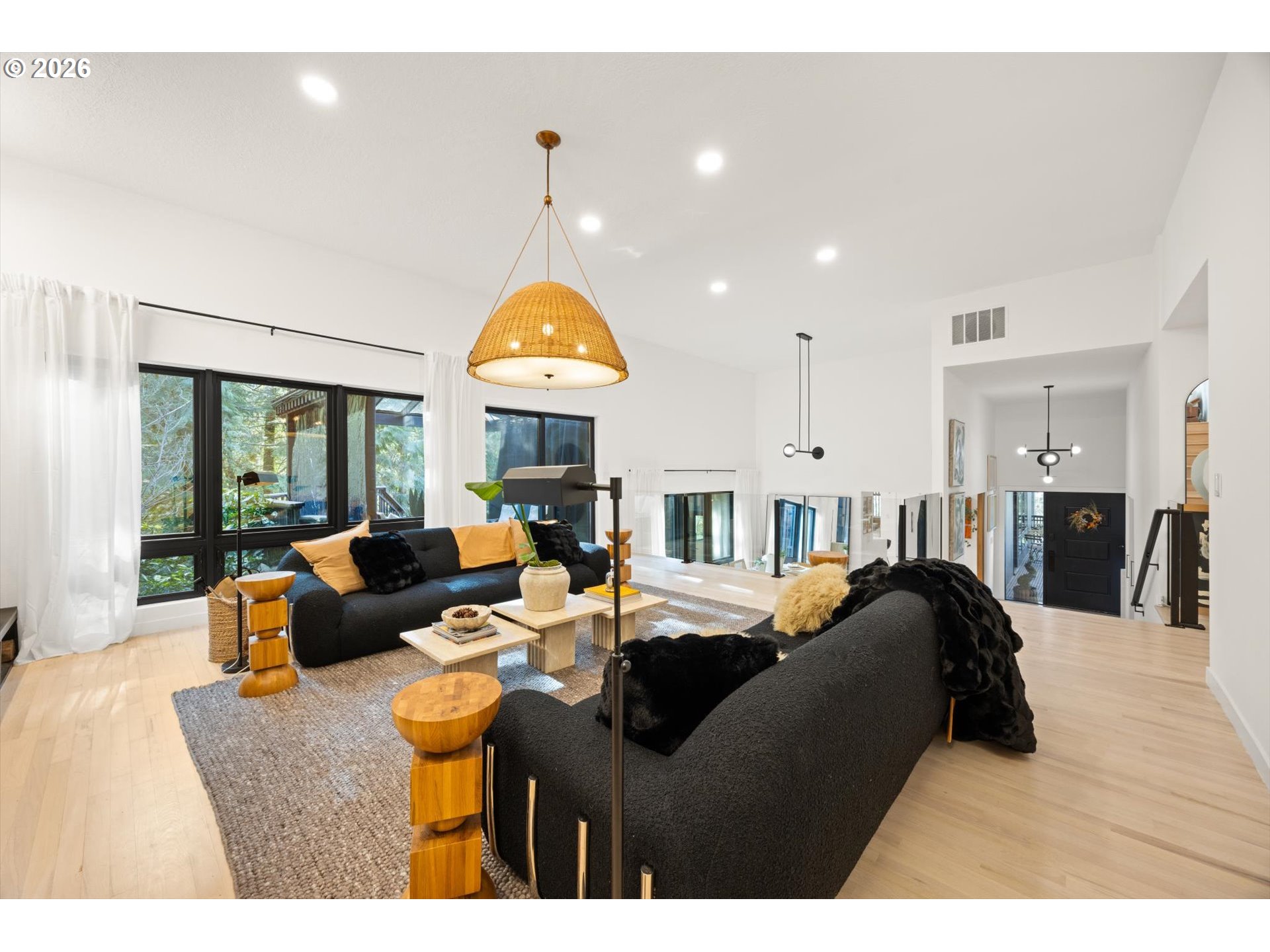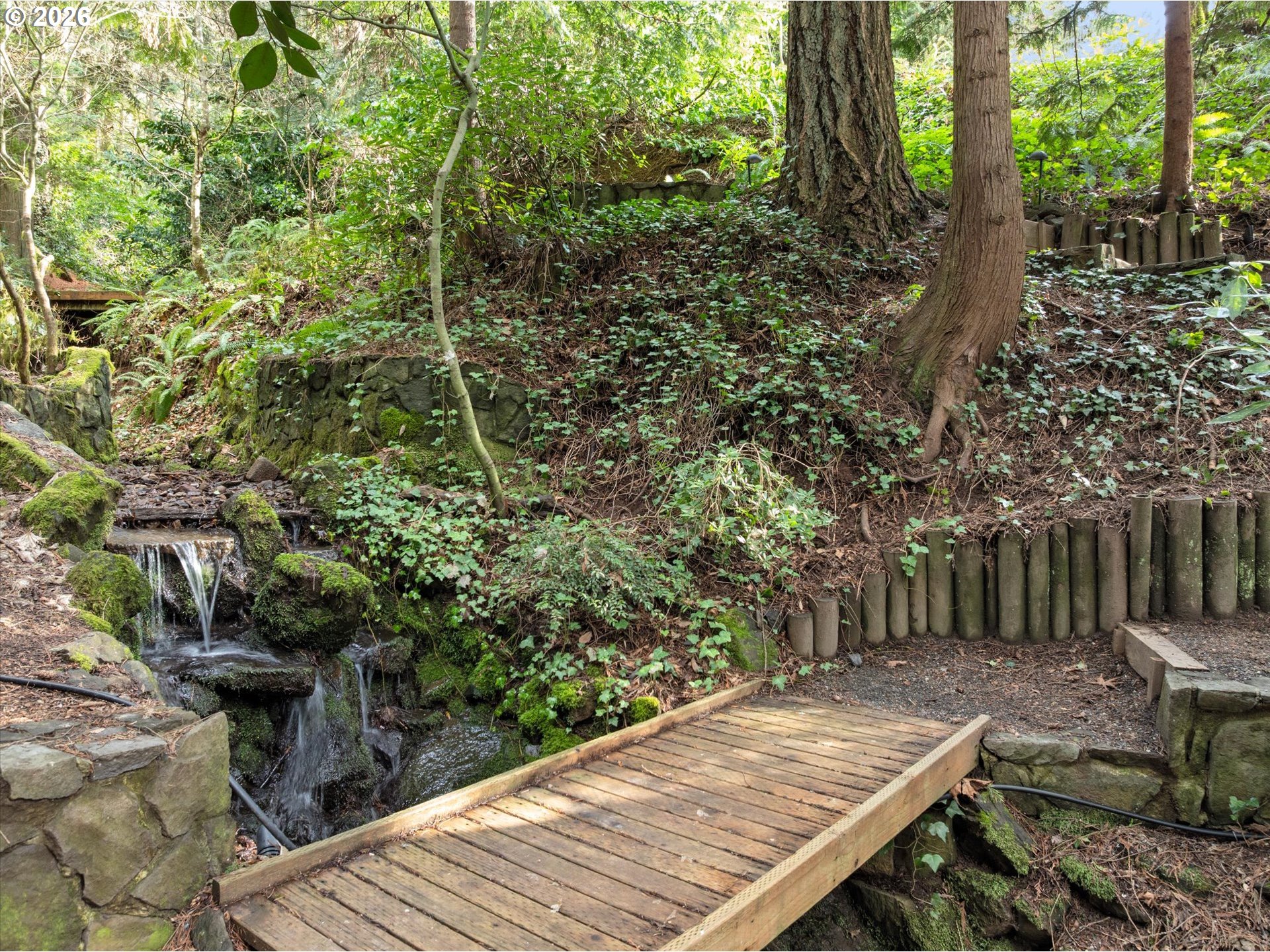 Extensively remodeled modern retreat on a private 0.98-acre cul-de-sac estate in the coveted Blue Heron neighborhood across from Oswego Lake, blending art, nature, and contemporary design. The property features lush gardens designed by renowned landscape architect Kurisu of the original Portland Japanese Gardens, a live creek, two waterfalls, bridges, and a Japanese-inspired trail system leading to a peaceful treehouse-style retreat. Enjoy rare access to four lake easements—Alder Point Club, Blue Heron, Maple Circle, and Lakeview Recreation Club—plus proximity to top-rated Lake Oswego schools, downtown Lake Oswego, and Bridgeport Village. The open, light-filled interior offers 4 bedrooms, multiple living spaces, and year-round nature views. The chef’s kitchen includes over $75K in upgrades with handcrafted Four Seasons cabinetry, custom white oak panels, an oversized island, built-in dining nook, Bosch oven/gas cooktop, Miele speed microwave and built-in espresso machine, and a paneled Fisher & Paykel refrigerator. A second living room features a European Stuv wood-burning stove and access to a deck set among the trees. The primary suite opens to a private treetop deck with direct trail access and includes a custom walk-in closet and spa-style bath with walk-in shower, designer fixtures, heated terrazzo floors, and radiant heat. Three additional bedrooms overlook the surrounding greenery. A remodeled office or flex space with sound-dampening custom oak slat walls and a private entrance is ideal for working from home or meeting clients. Major systems have been fully upgraded with new Rheem water heater, dual air conditioners, and two high-efficiency furnaces, completing this rare combination of privacy, luxury, and access to the Lake Oswego lifestyle.