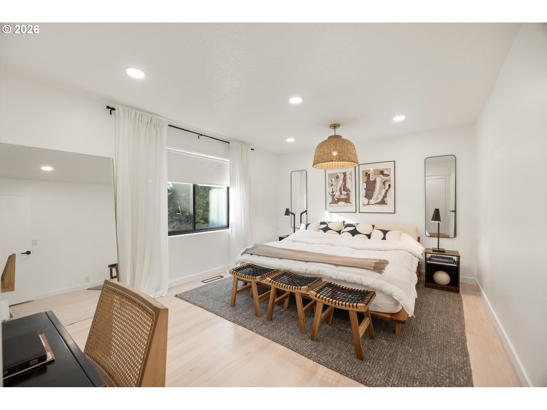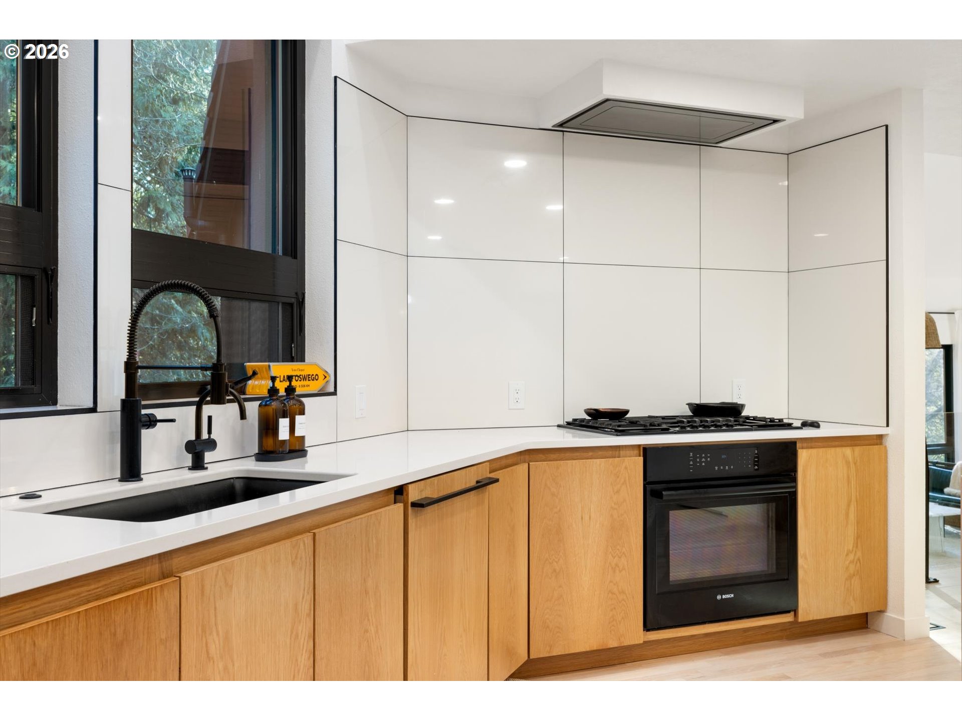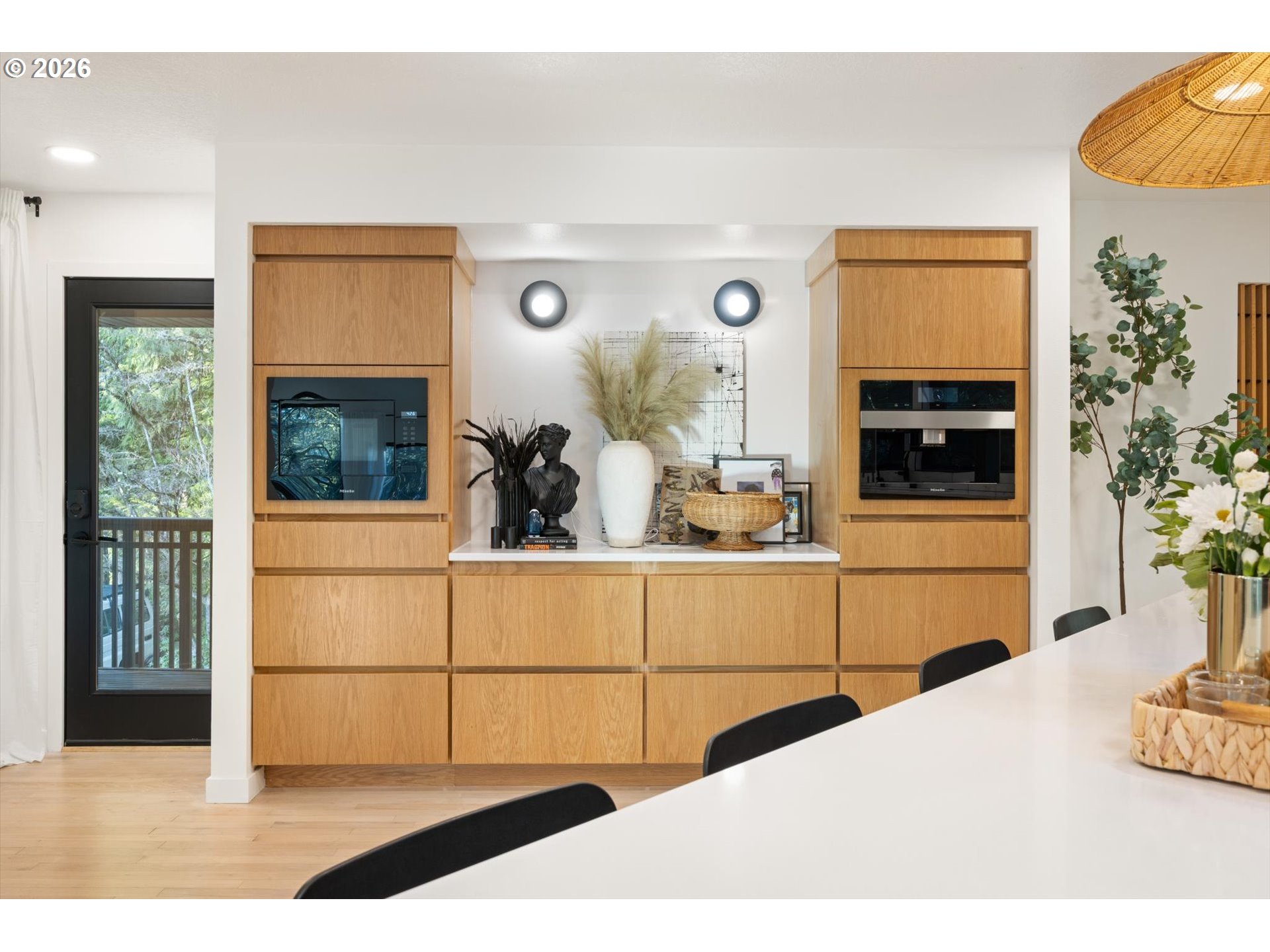 Extensively remodeled modern retreat on a private 0.98-acre cul-de-sac estate in the coveted Blue Heron neighborhood across from Oswego Lake, blending art, nature, and contemporary design. The property features lush gardens designed by renowned landscape architect Kurisu of the original Portland Japanese Gardens, a live creek, two waterfalls, bridges, and a Japanese-inspired trail system leading to a peaceful treehouse-style retreat. Enjoy rare access to four lake easements—Alder Point Club, Blue Heron, Maple Circle, and Lakeview Recreation Club—plus proximity to top-rated Lake Oswego schools, downtown Lake Oswego, and Bridgeport Village. The open, light-filled interior offers 4 bedrooms, multiple living spaces, and year-round nature views. The chef’s kitchen includes over $75K in upgrades with handcrafted Four Seasons cabinetry, custom white oak panels, an oversized island, built-in dining nook, Bosch oven/gas cooktop, Miele speed microwave and built-in espresso machine, and a paneled Fisher & Paykel refrigerator. A second living room features a European Stuv wood-burning stove and access to a deck set among the trees. The primary suite opens to a private treetop deck with direct trail access and includes a custom walk-in closet and spa-style bath with walk-in shower, designer fixtures, heated terrazzo floors, and radiant heat. Three additional bedrooms overlook the surrounding greenery. A remodeled office or flex space with sound-dampening custom oak slat walls and a private entrance is ideal for working from home or meeting clients. Major systems have been fully upgraded with new Rheem water heater, dual air conditioners, and two high-efficiency furnaces, completing this rare combination of privacy, luxury, and access to the Lake Oswego lifestyle.