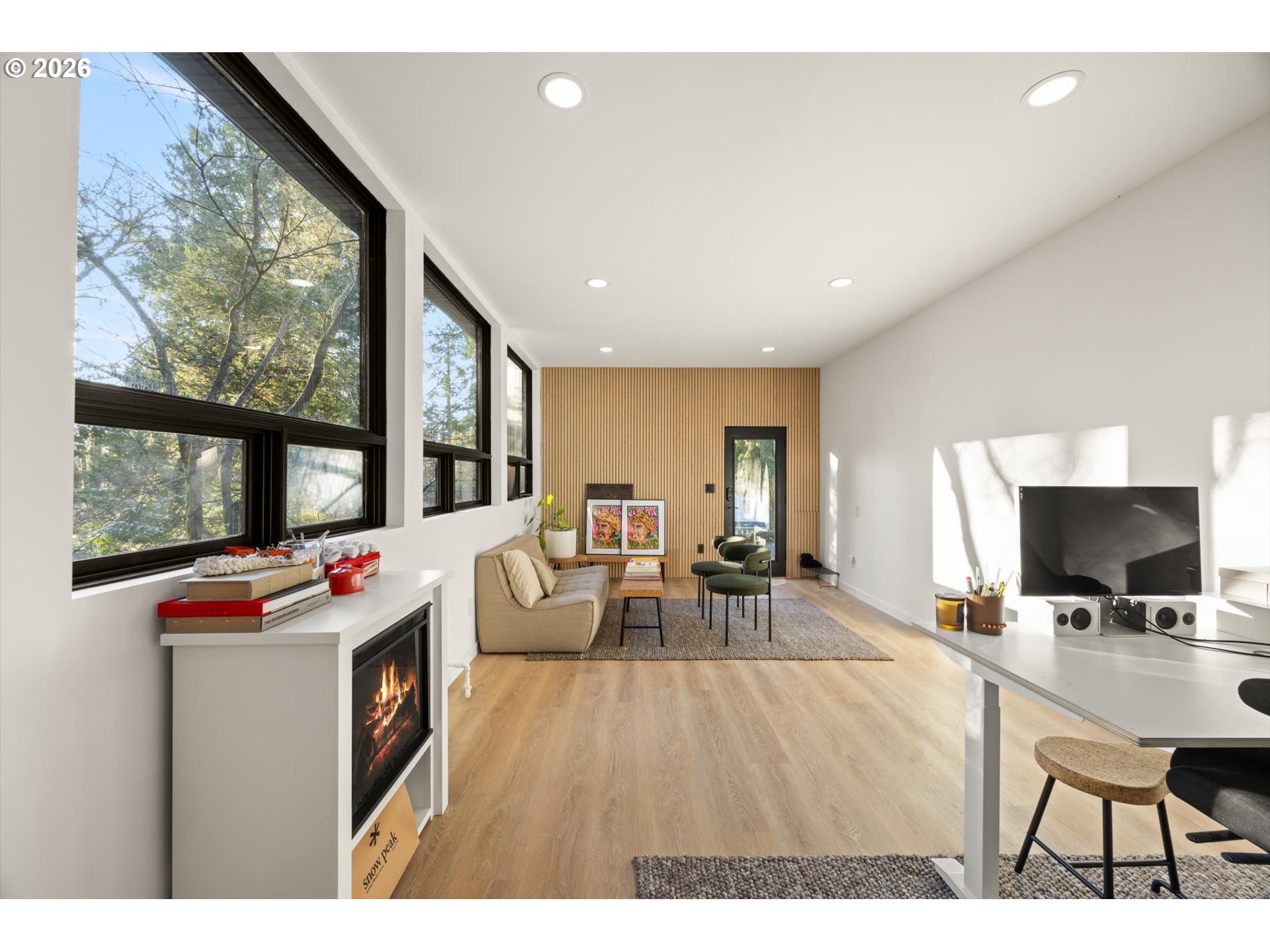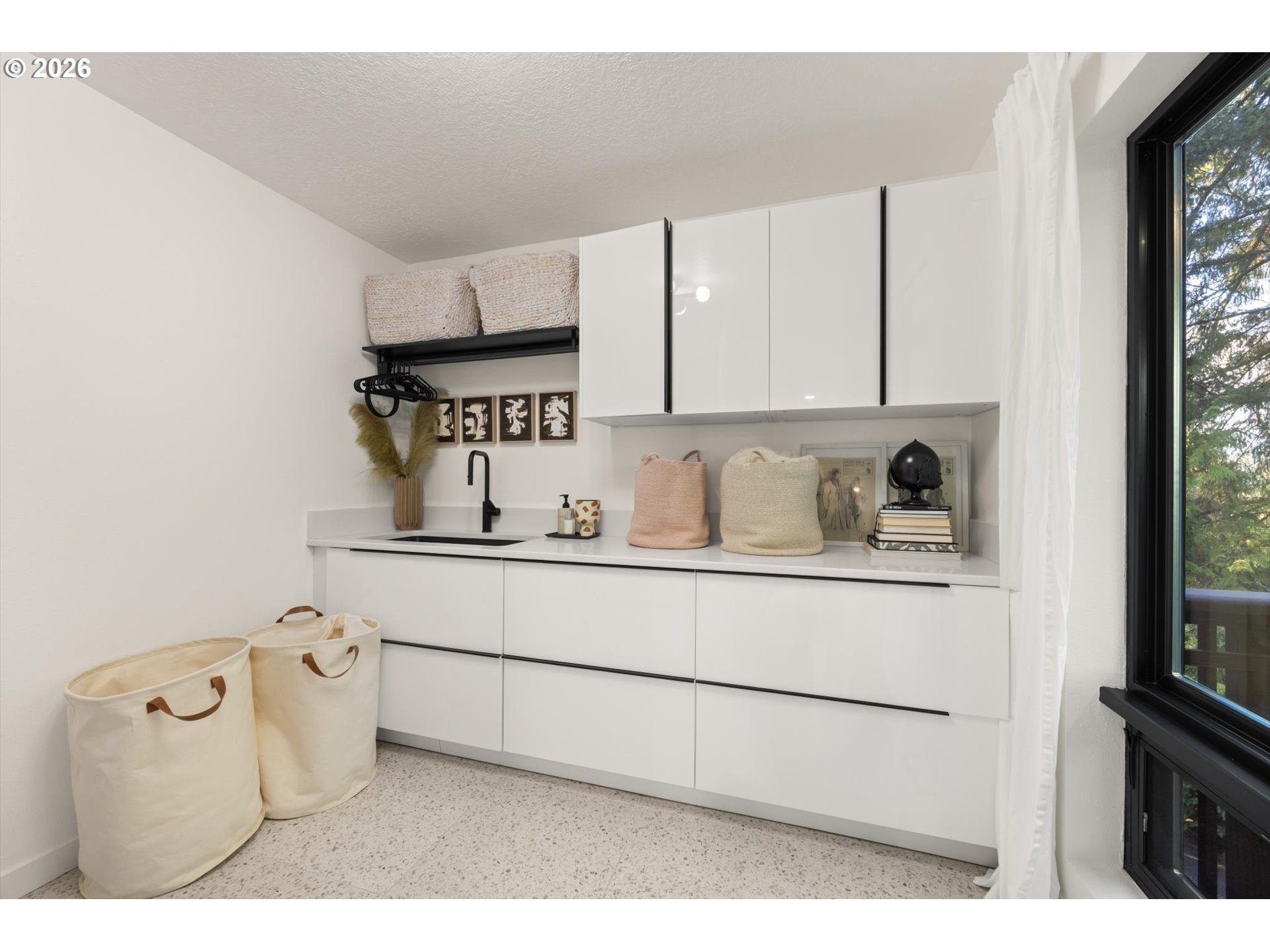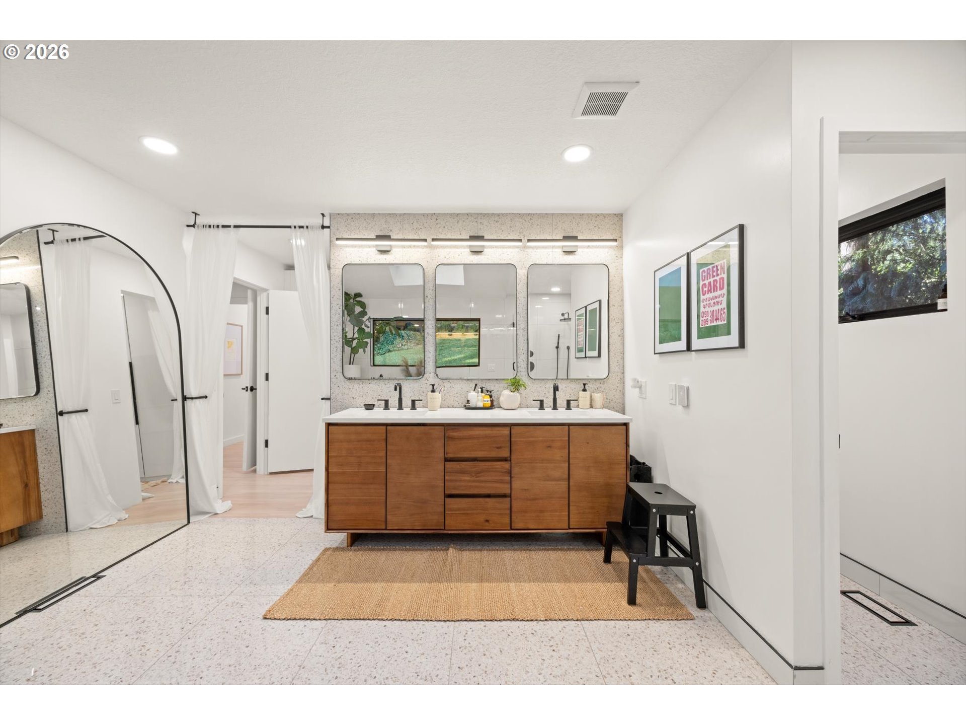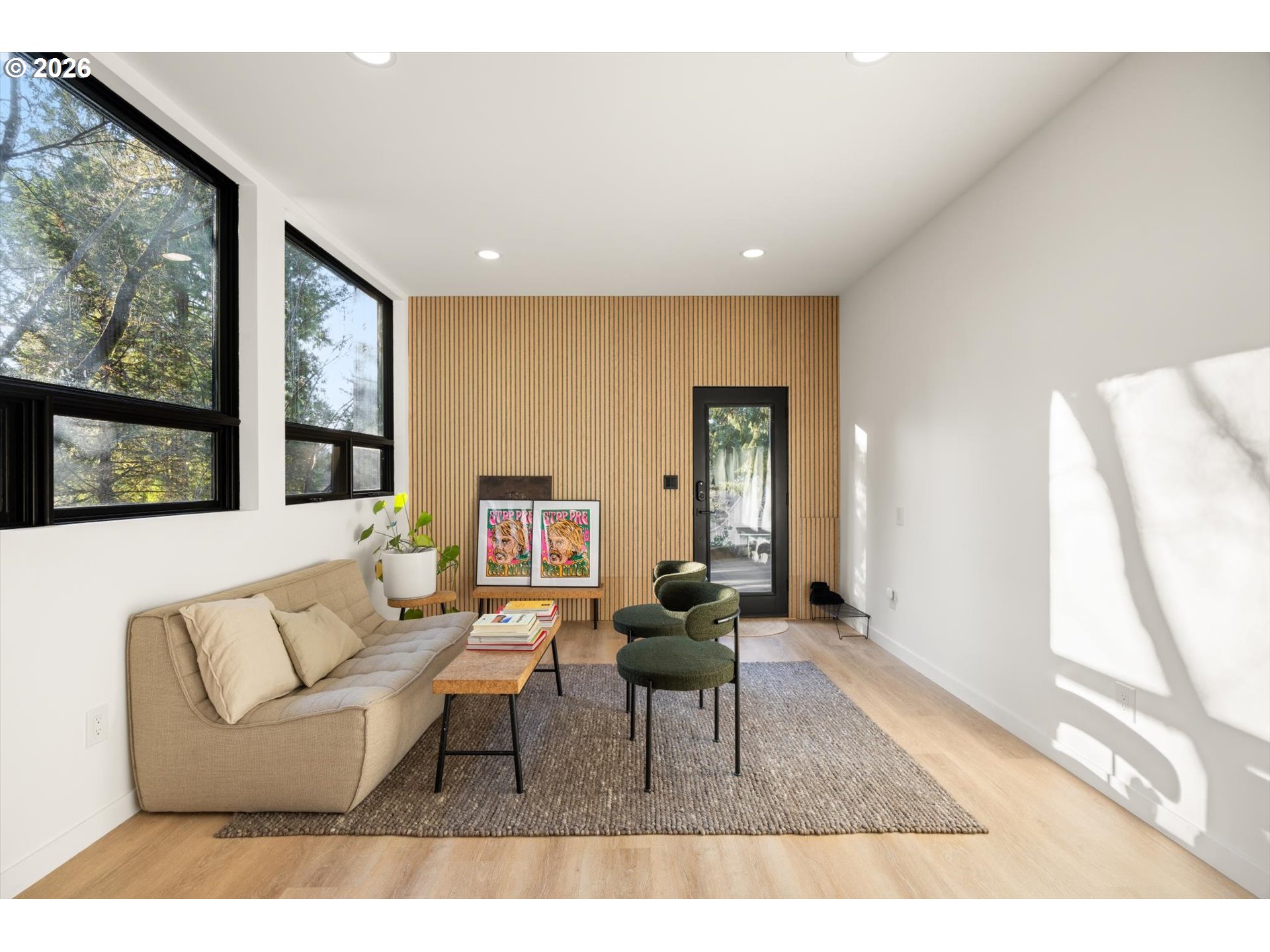 Extensively remodeled modern retreat on a private 0.98-acre cul-de-sac estate in the coveted Blue Heron neighborhood across from Oswego Lake, blending art, nature, and contemporary design. The property features lush gardens designed by renowned landscape architect Kurisu of the original Portland Japanese Gardens, a live creek, two waterfalls, bridges, and a Japanese-inspired trail system leading to a peaceful treehouse-style retreat. Enjoy rare access to four lake easements—Alder Point Club, Blue Heron, Maple Circle, and Lakeview Recreation Club—plus proximity to top-rated Lake Oswego schools, downtown Lake Oswego, and Bridgeport Village. The open, light-filled interior offers 4 bedrooms, multiple living spaces, and year-round nature views. The chef’s kitchen includes over $75K in upgrades with handcrafted Four Seasons cabinetry, custom white oak panels, an oversized island, built-in dining nook, Bosch oven/gas cooktop, Miele speed microwave and built-in espresso machine, and a paneled Fisher & Paykel refrigerator. A second living room features a European Stuv wood-burning stove and access to a deck set among the trees. The primary suite opens to a private treetop deck with direct trail access and includes a custom walk-in closet and spa-style bath with walk-in shower, designer fixtures, heated terrazzo floors, and radiant heat. Three additional bedrooms overlook the surrounding greenery. A remodeled office or flex space with sound-dampening custom oak slat walls and a private entrance is ideal for working from home or meeting clients. Major systems have been fully upgraded with new Rheem water heater, dual air conditioners, and two high-efficiency furnaces, completing this rare combination of privacy, luxury, and access to the Lake Oswego lifestyle.