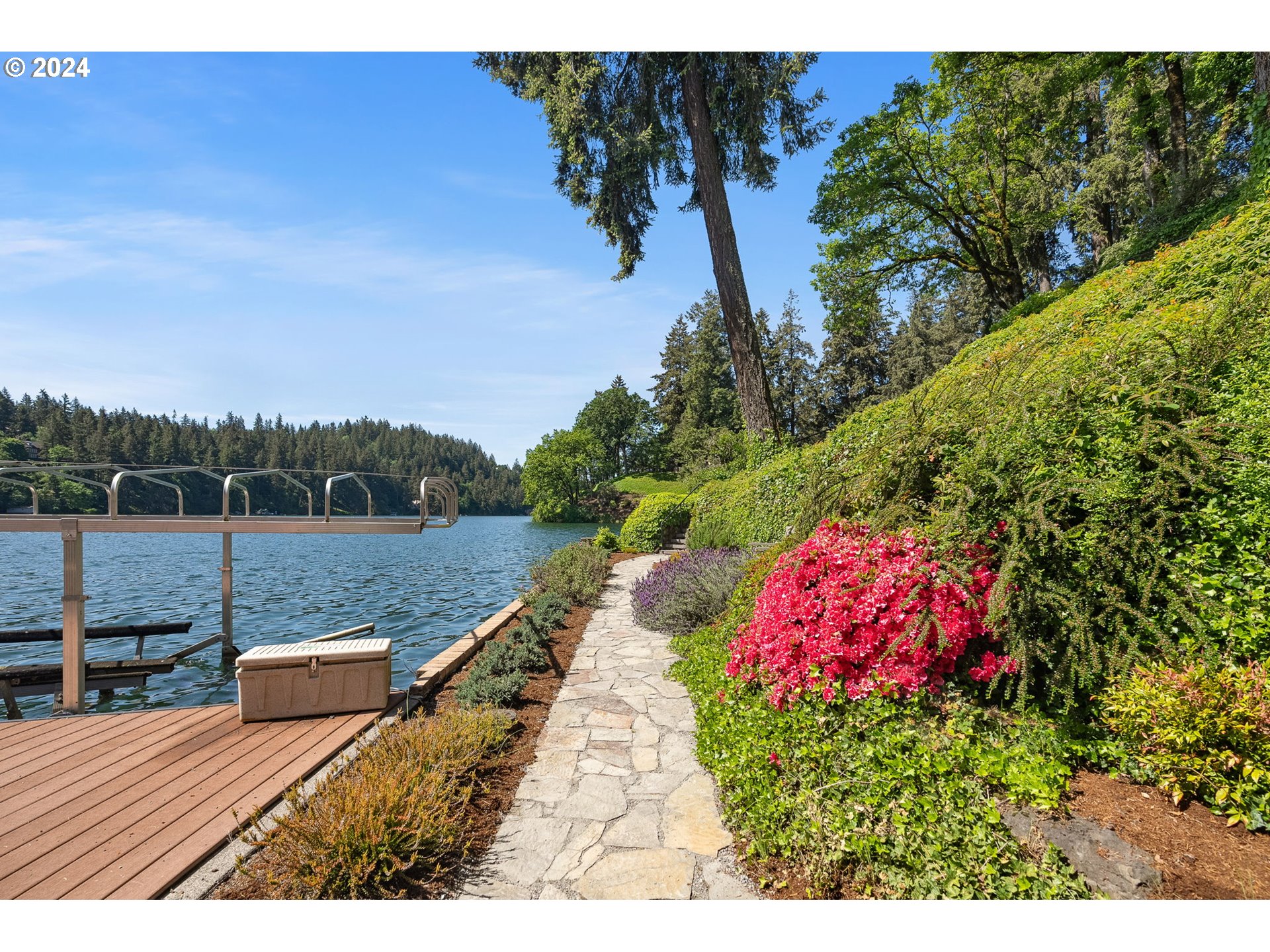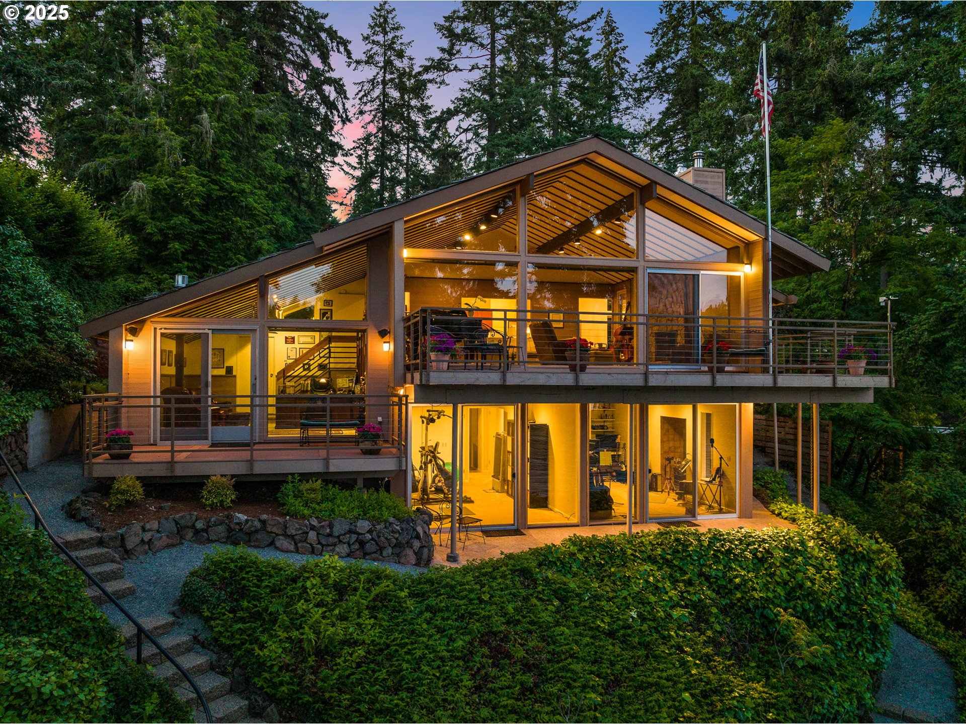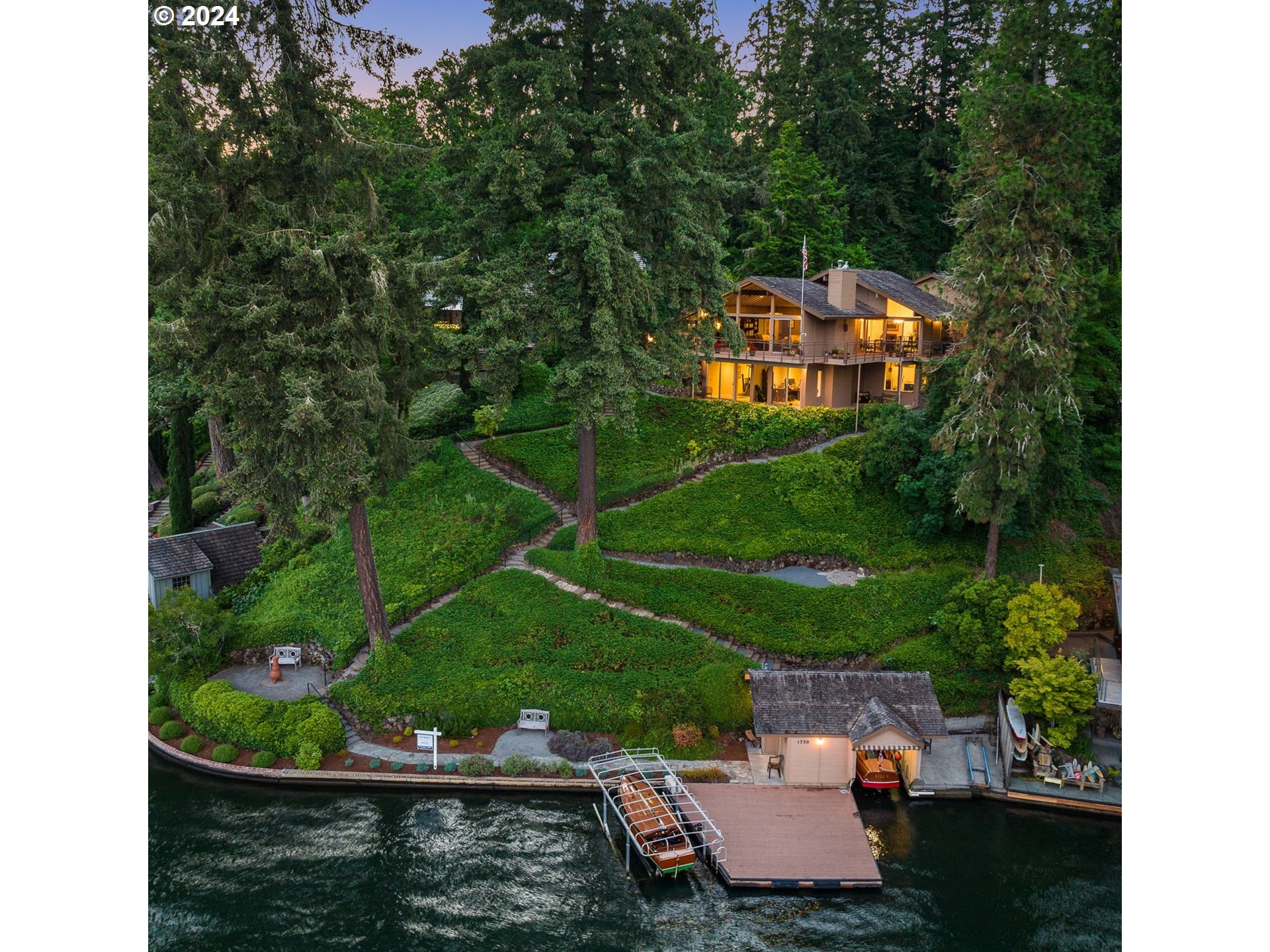 Expansive Lakefront Property in Lake Oswego. A rare opportunity to own one of the largest parcels on Lake Oswego’s main lake. Set on over half an acre of mature landscaped grounds with 130 feet of private waterfront, this exceptional estate offers a truly immersive lakefront lifestyle. A gated drive and ample guest parking provide both privacy and ease, while towering trees and lush greenery frame the setting. Thoughtfully sited to capture panoramic lake views, the midcentury modern residence features a light filled main level with skylights, a dramatic stone fireplace, and expansive windows that open to a generous deck ideal for soaking in the serene waterfront surroundings. The flexible floor plan includes three bedrooms, an office, and a bonus room, offering a strong foundation for personalization or expansion. A gentle, picturesque path leads to the shoreline, where a dock, boathouse with half bath, and two boat lifts await. There's plenty of room to add an outdoor kitchen or lounge area to further elevate this exceptional lakefront setting. Just minutes by car or boat to the Lake Oswego Farmers Market, restaurants, and downtown amenities, this is a once in a generation offering in one of Oregon’s most sought after communities.