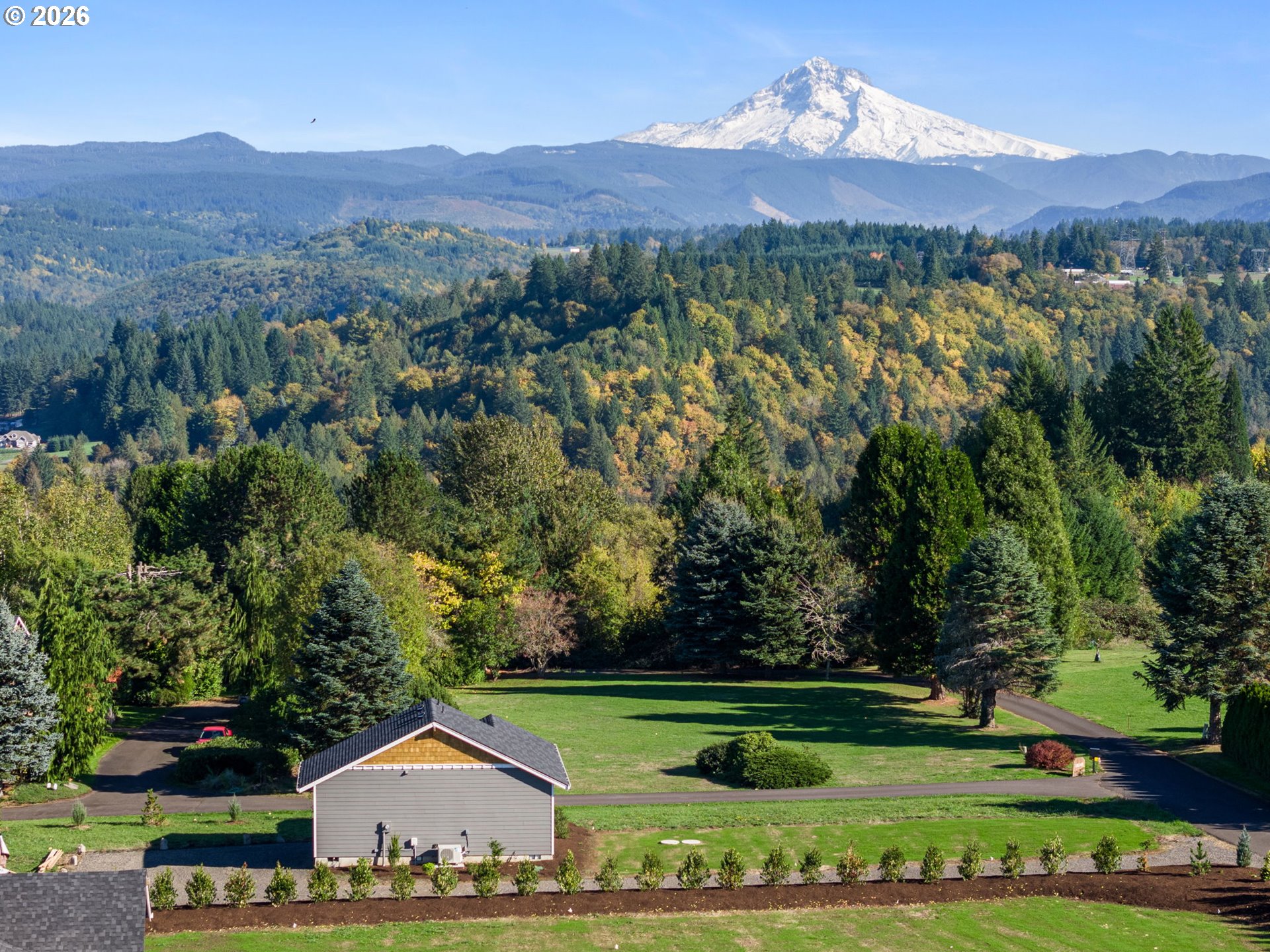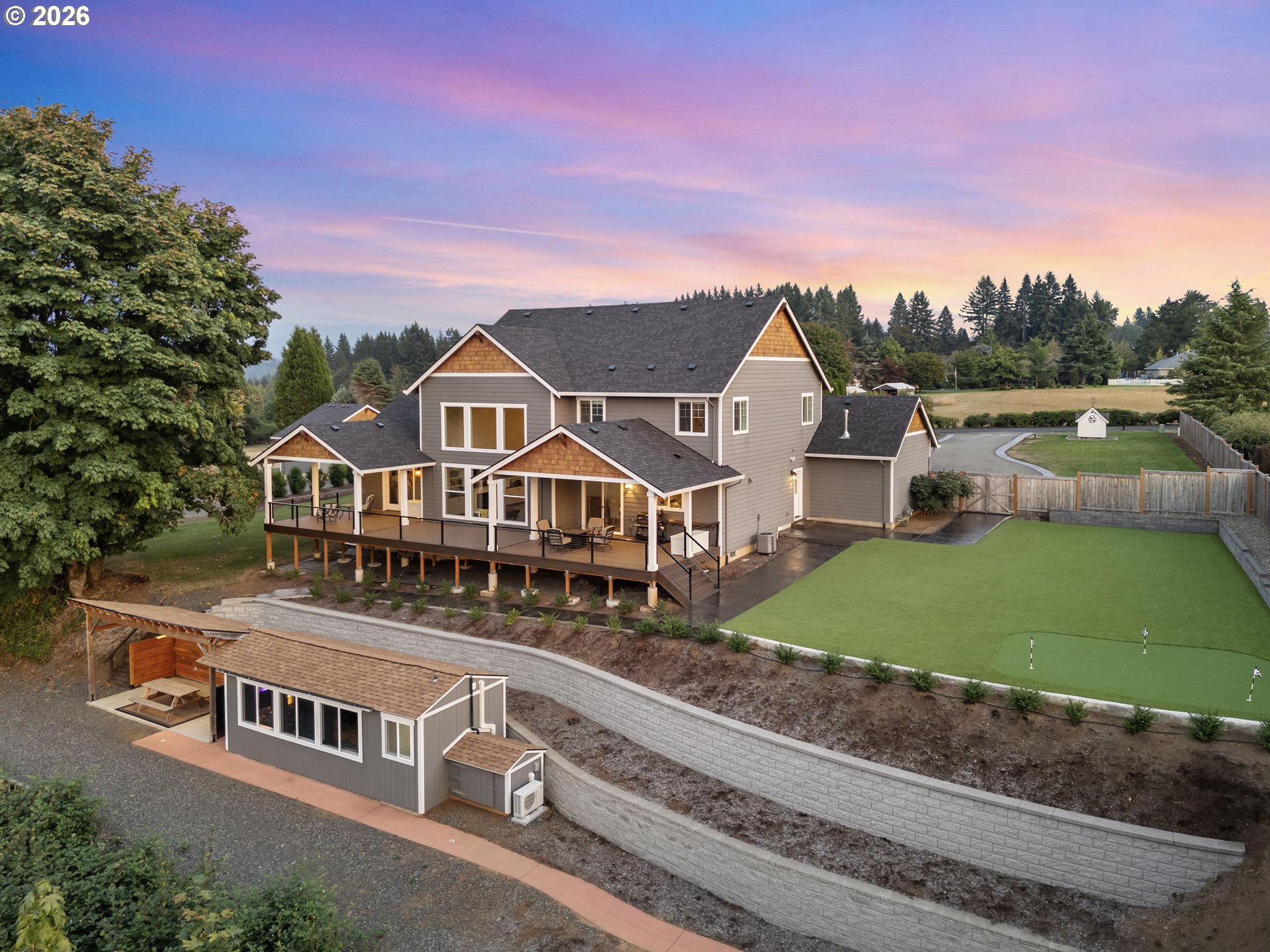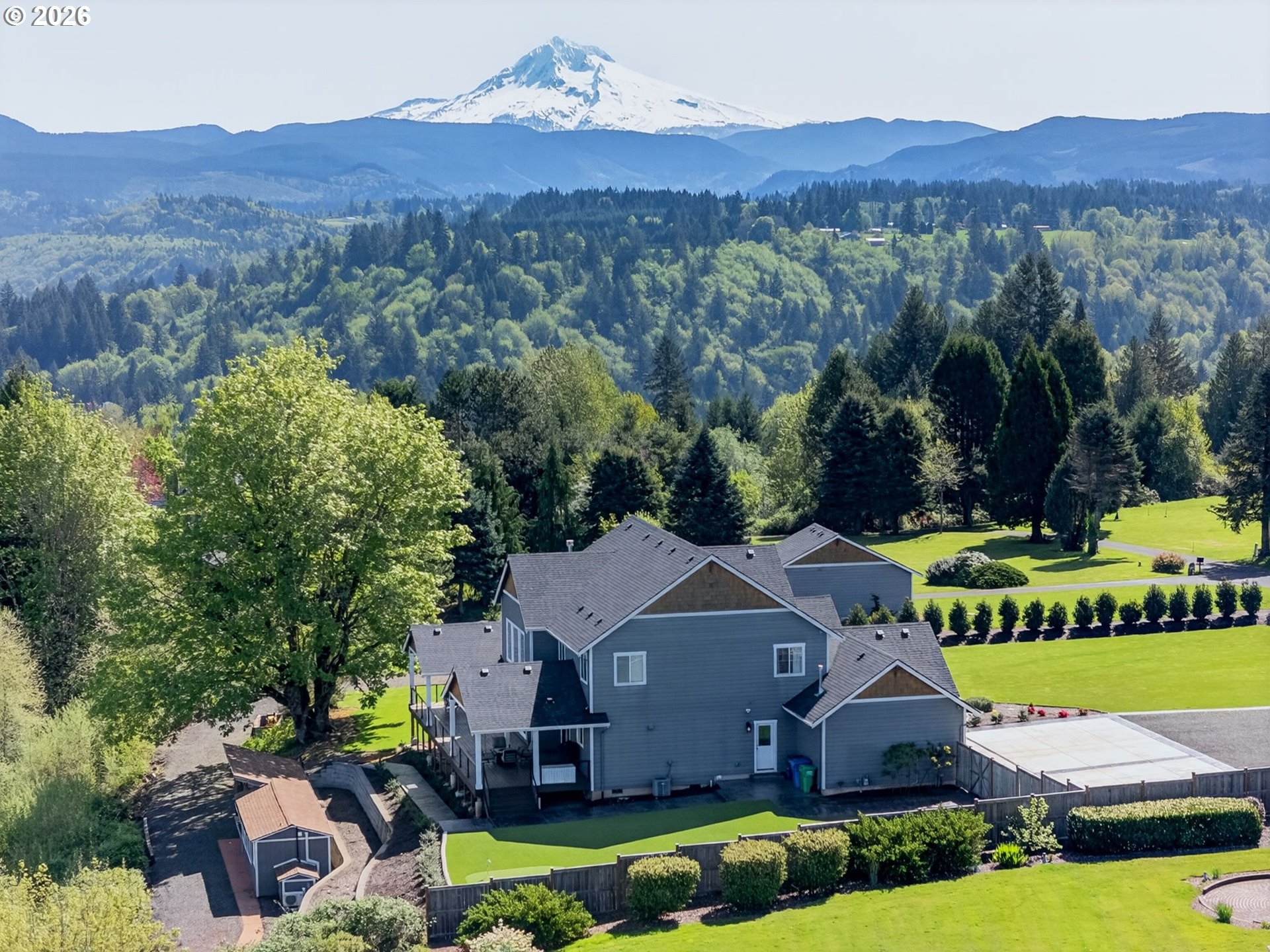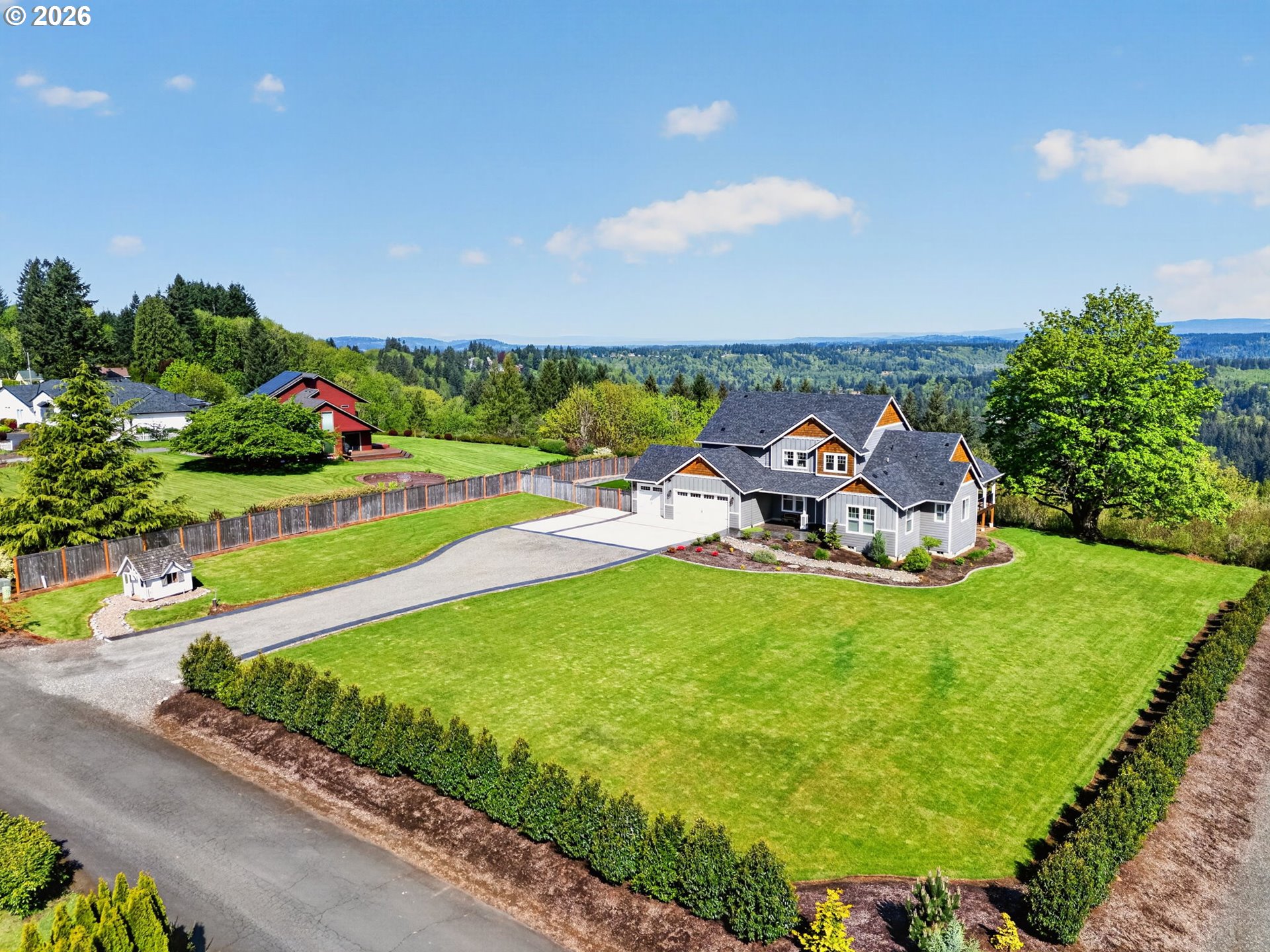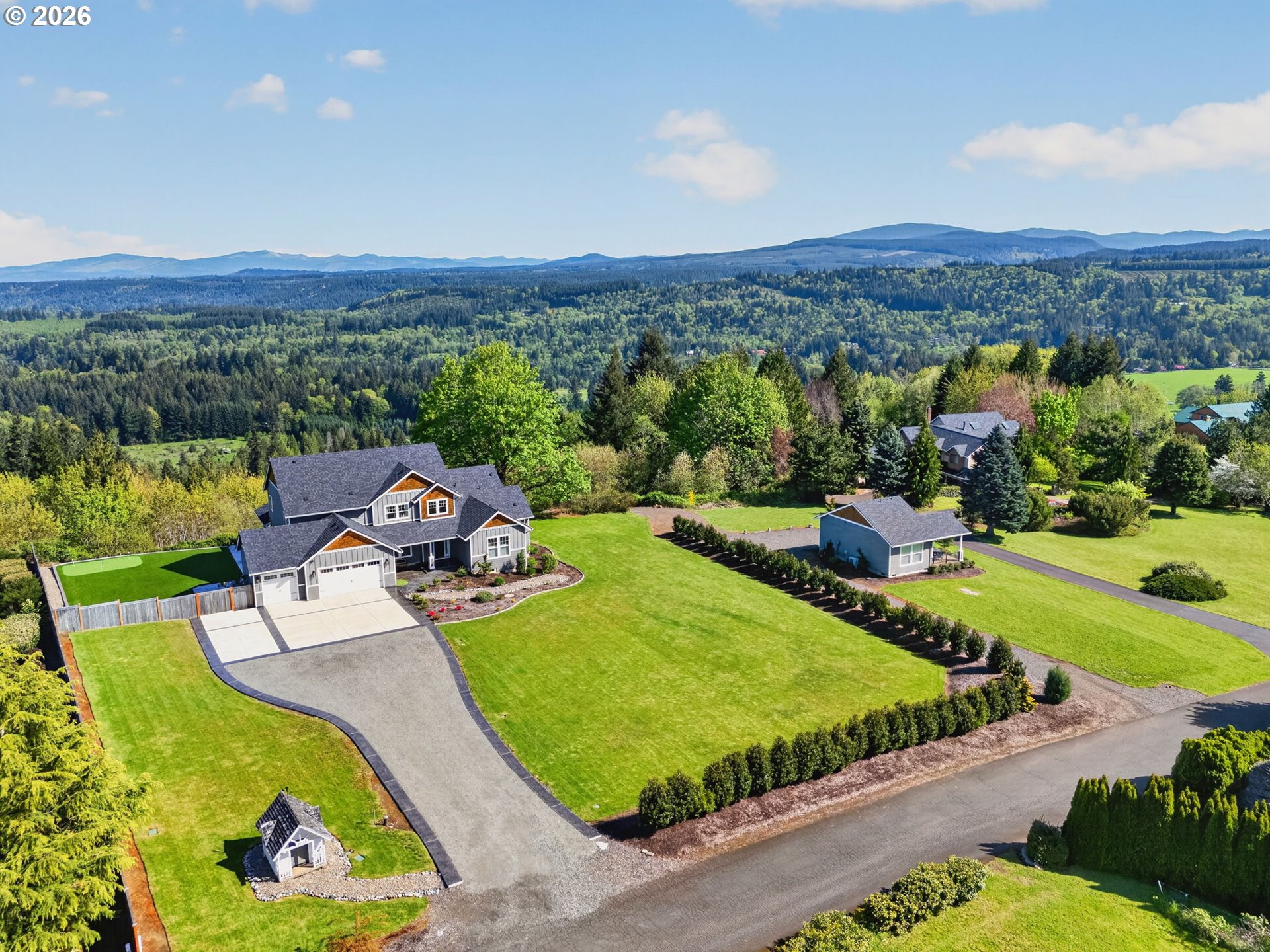 Open House 4/26 @ 12-3pm! Luxury meets lifestyle on nearly 5 private acres with breathtaking panoramic valley and mountain views, including Mt. Hood, in this stunning 2022-built custom home. Tucked at the end of a private street, this Craftsman offers 4 bedrooms, 2.5 bathrooms, including a beautifully appointed detached 1 bedroom/1 bathroom ADU—ideal for guests, multigenerational living, or income potential. Inside, the main level is designed for both everyday living and entertaining, featuring soaring ceilings, expansive windows that frame the views, and an open-concept layout. The chef’s kitchen is equipped with quartz counters, double ovens, gas appliances, a large island, pantry and generous dining space. The primary suite on the main level offers a true retreat with French doors to the deck, two walk-in closets, dual vanities, and a spa-style walk-in shower. Upstairs, three additional bedrooms and a versatile loft provide flexible living options. Dedicated office is located on the main floor. The detached ADU (approx. 512 sq ft) is fully equipped with kitchen, living space, bedroom, bath, and private entrance—currently set up as an income producing short-term rental. Outdoor living is where this property truly shines. Enjoy the expansive covered deck with sweeping views, professionally landscaped grounds, large level lawn, and custom putting green—creating a private resort-like setting. And don't miss the golf simulator in the garage! Ample parking, a 3-car garage, RV/boat storage, and an addition 230 sf outbuilding with Hvac/ac & full bathroom provide functionality to match the beauty (currently used as a studio/office, but would make a great airbnb as well). A rare combination of new construction, usable acreage, income potential, and unforgettable views—just minutes to town yet offering complete privacy!