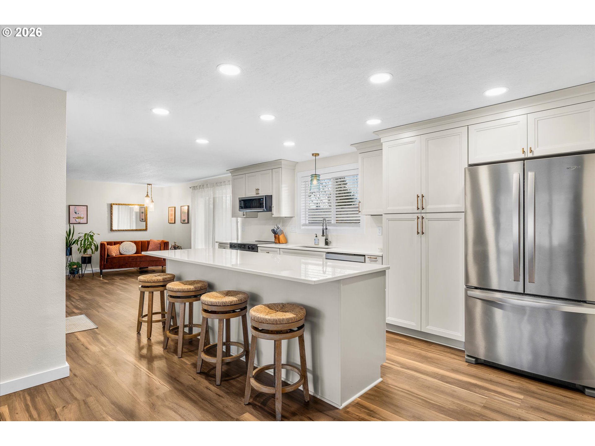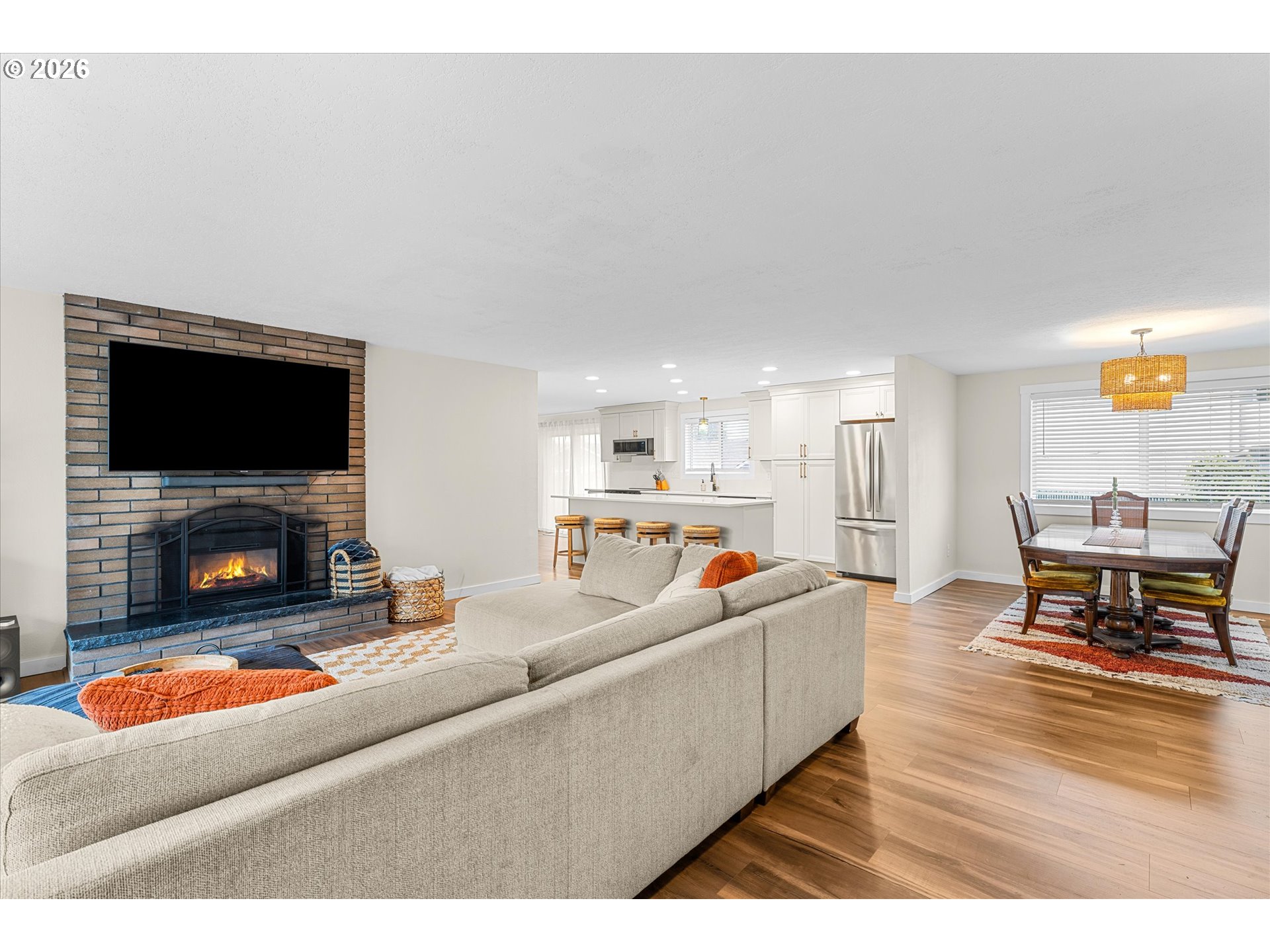 Tucked away on a quiet cul-de-sac in the heart of Gladstone, this beautifully updated one-level balances mid-century charm with modern style and functional living. The open-concept living area serves as the centerpiece of the home, anchored by a brick fireplace and a striking kitchen island with gorgeous quartz slab countertops. The kitchen is fully equipped with newer stainless steel appliances, creating a space designed for effortless hosting.Thoughtful updates include new windows, a new sliding door to the backyard, new interior doors, new trim, new flooring throughout, new light fixtures, new window coverings and updated bathrooms. Outside, the large, fully fenced yard provides the perfect opportunity for recreation or gardening. A two-car garage and central air conditioning provide year-round comfort and convenience. Situated just moments from Gladstone High School, this is a rare, turn-key opportunity in a prime location.