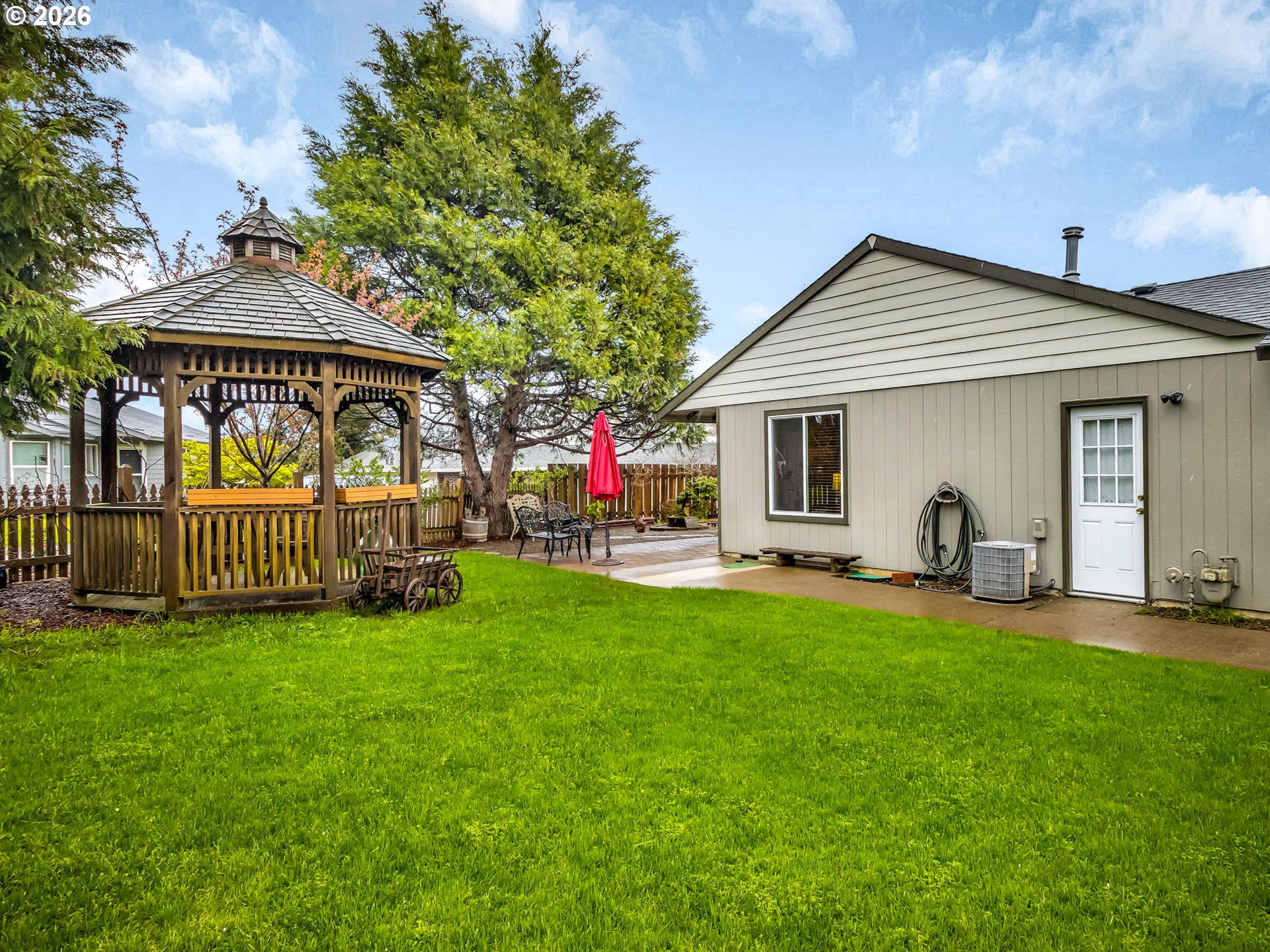 Stylish living with this meticulously updated, one-story contemporary gem nestled in a desirable neighborhood. This home offers the perfect balance of convenience and serenity, just moments from shopping, schools, restaurants and vibrant walking trails. The heart of this home is a stunningly redesigned kitchen, cabinets equipped with soft-close drawers & hardware and gorgeous granite countertops designed for both function and style. Vaulted ceilings in the spacious living room create an airy ambiance filled with natural light, perfect for welcoming guests or relaxing. Step outside into a private, fully fenced sanctuary—a true gardener’s delight teeming with beautiful flowers, mature bushes, and serene trees. Enjoy raised garden beds, a versatile garden shed equipped with a concrete floor and electricity, and a charming gazebo that acts as an idyllic spot for morning coffee or evening entertaining. Enjoy the convenience of a dedicated laundry room (LG washer/dryer included) and year-round comfort with central heating and cooling. The expansive lot offers the potential for side-yard RV parking, catering to all your recreational needs.