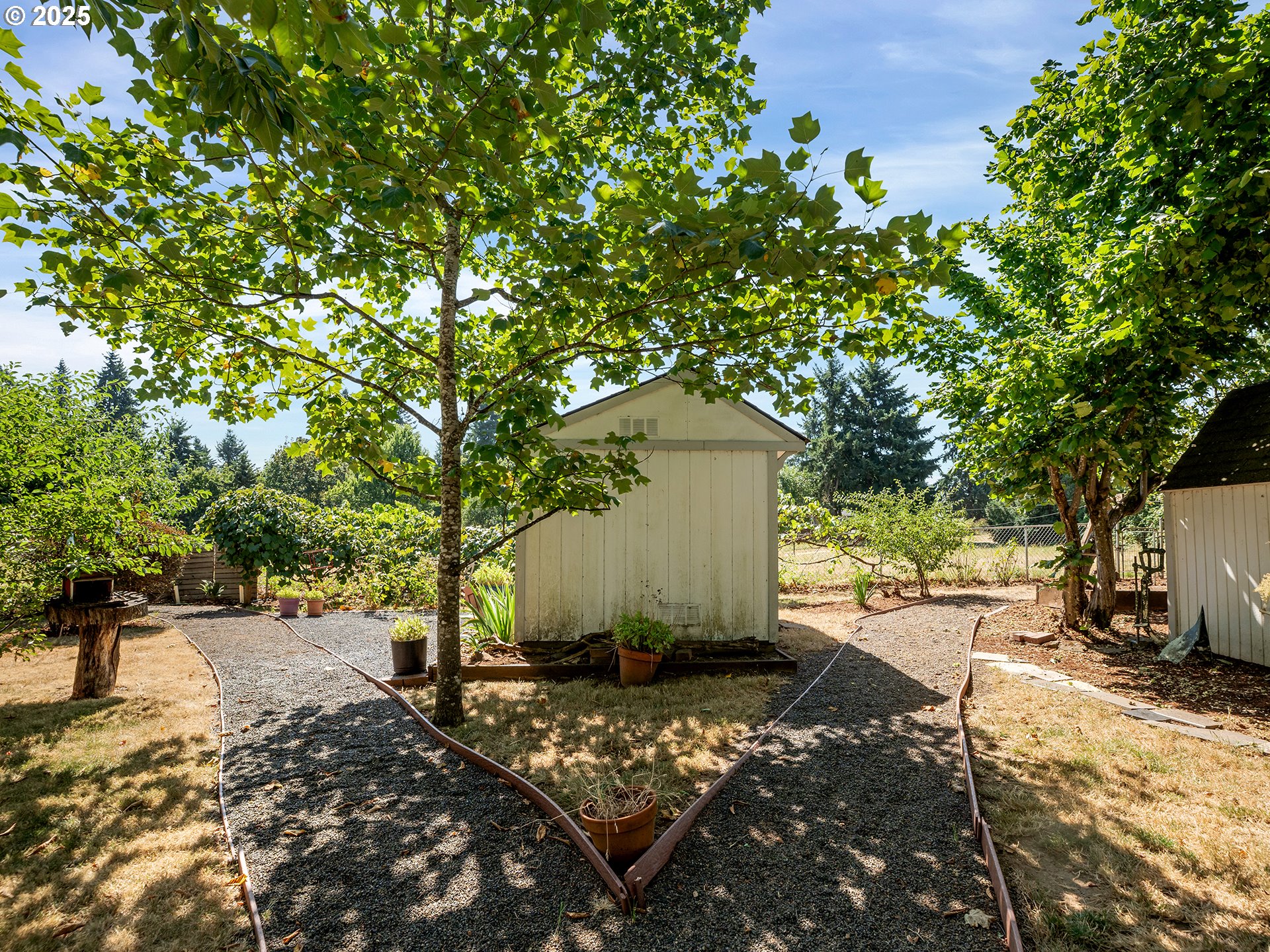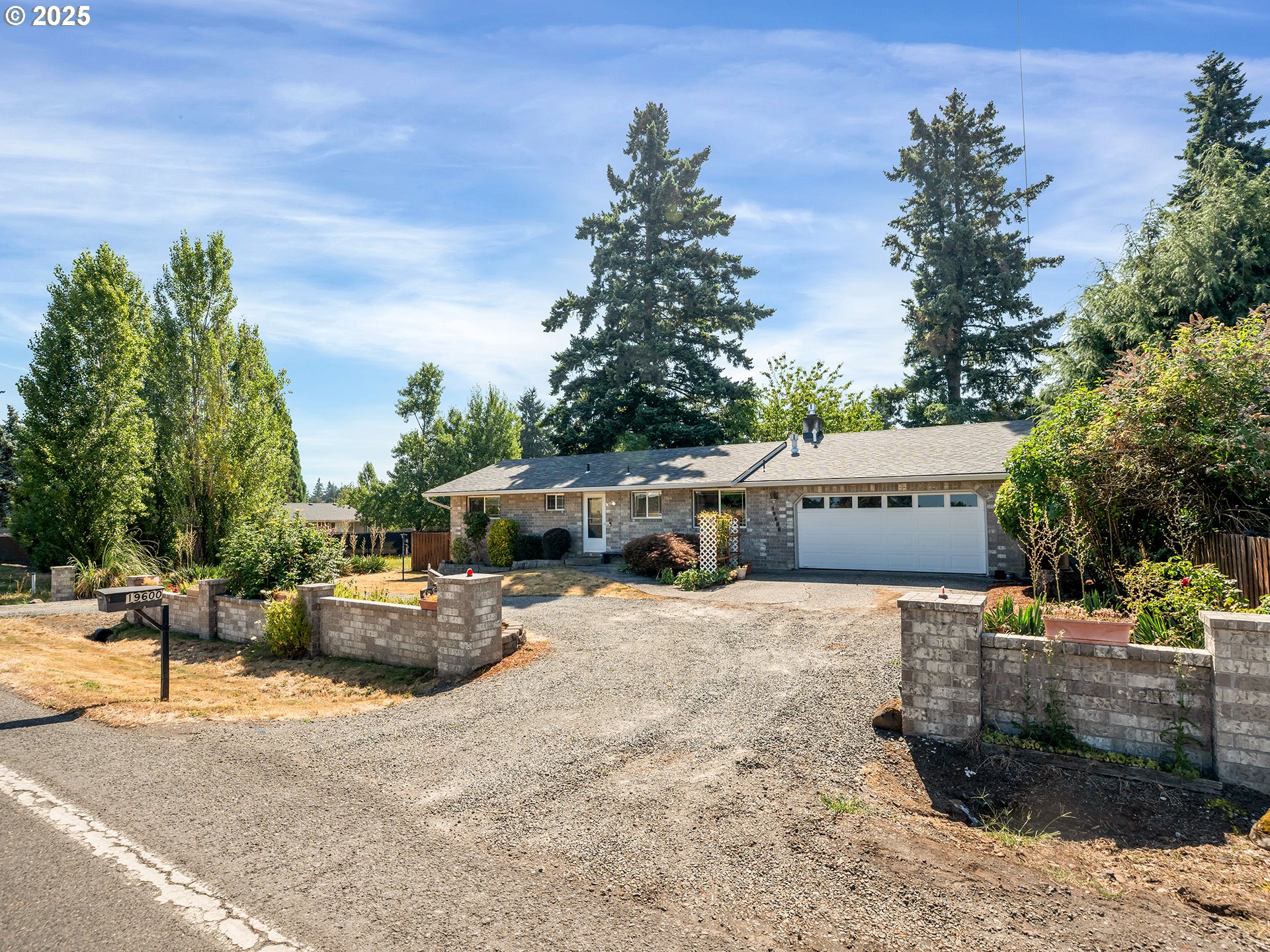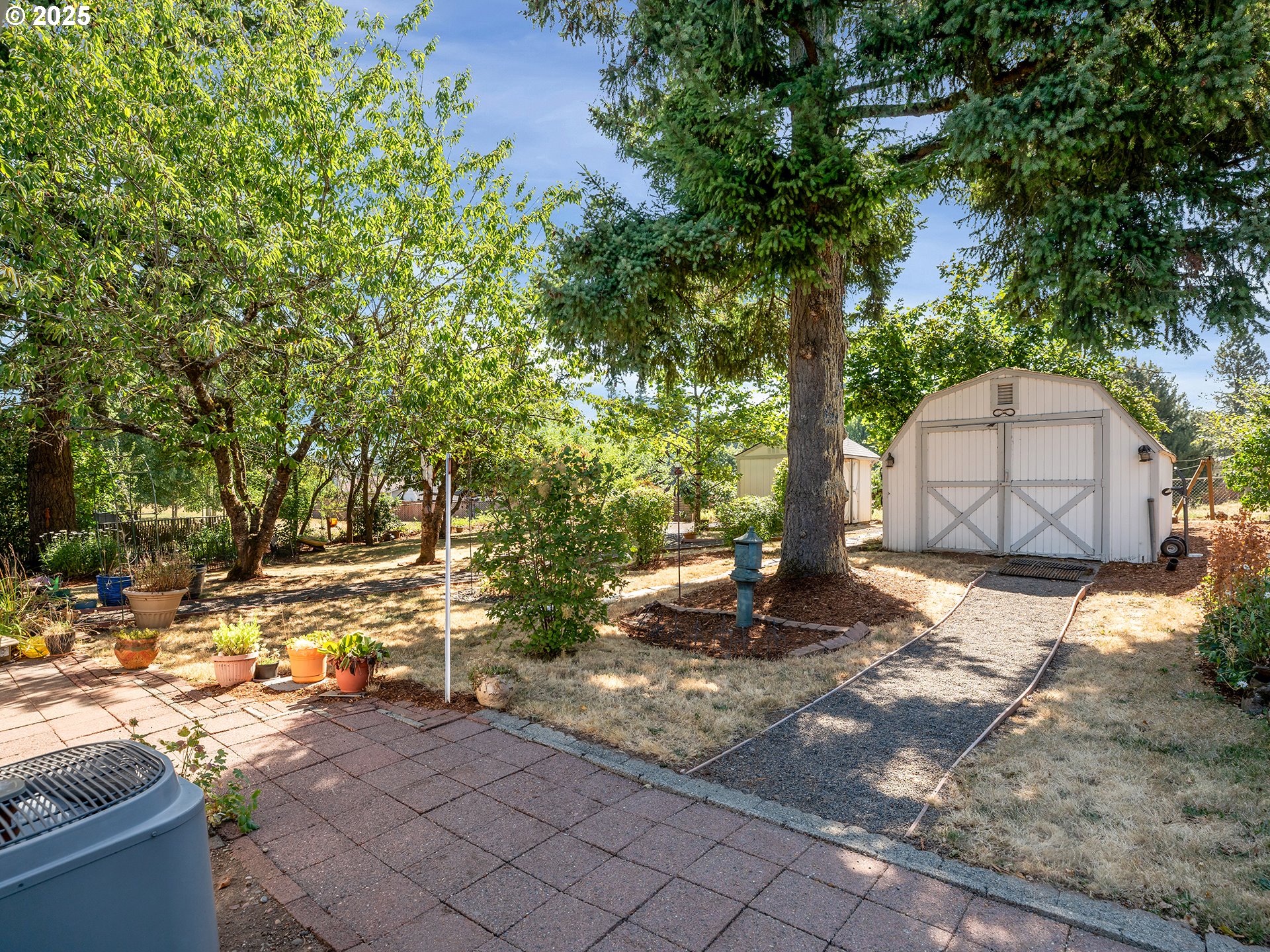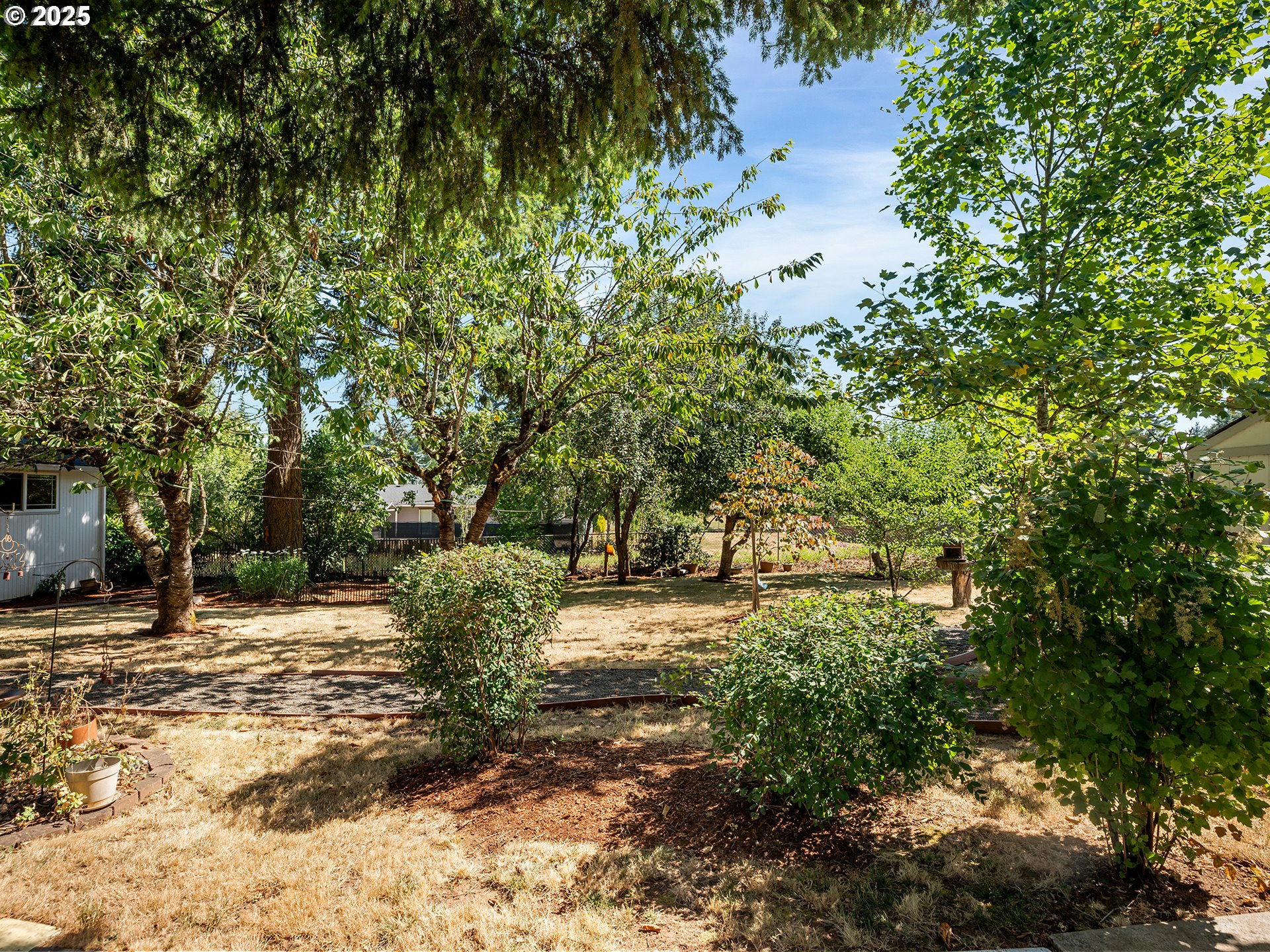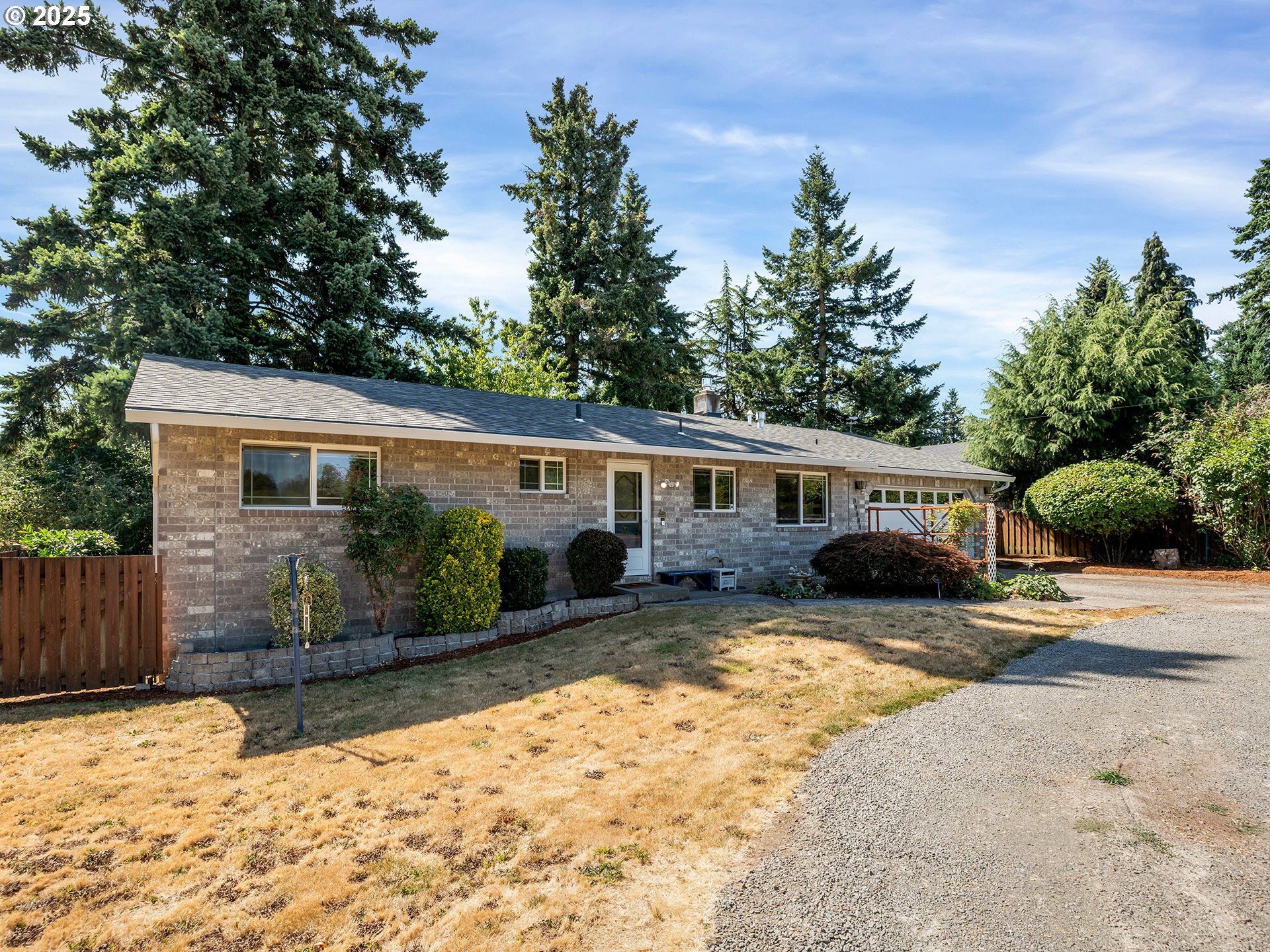 Excellent single level home in the popular Finnegans neighborhood on a wonderful, lusciously landscaped large (0.28 acre) private lot surrounded by greenspace on three sides and with flowers galore and multiple fruit trees including apples, plums, cherries, a grape arbor and a filbert tree! This bountiful lot also has the convenience of a circular driveway, backyard patio and two sheds (12x16 & 12x8) for ample outdoor storage. Inside the easy flow floorplan consists of three bedrooms (two with new carpeting as of June 2025), two bathrooms, an extended kitchen for either additional work/storage space or an eat-in option. Use the center room for either a living room or dining room with a cozy fireplace and the additional room as you wish for bonus space. Other features include mostly solid surface floors, double paned vinyl windows with newer blinds throughout (approx 2019), updated kitchen in 2019 (with quartz countertops, soft close cabinets and drawers and pull out shelves), updated bathroom in 2025, water heater approx 6yrs old, HVAC (with central A/C) approx 4yrs old, newer roof (2025), updated paint inside and out (approx 2019), updated canned lighting added in 2024, crawlspace refresh including Visqueen vapor barrier and insulation (2024). Home also comes with a newer Generac generator and is part of the Clackamas River Water District. Annual HOA dues of $79/year are for greenspace and park/rec facility maintenance only.