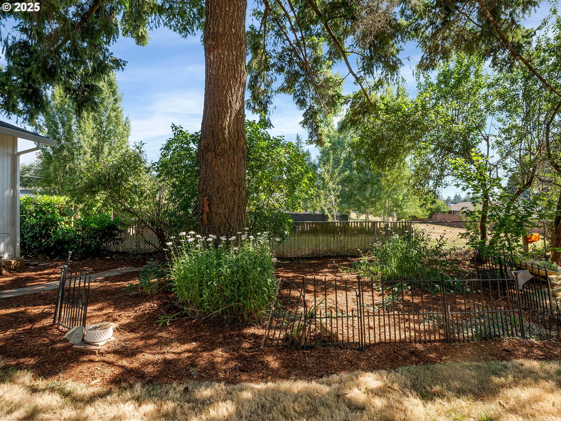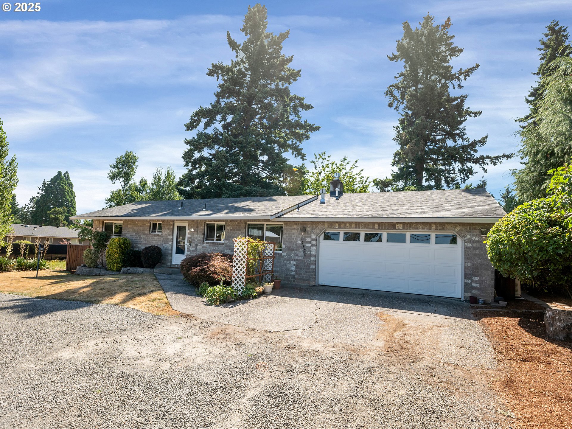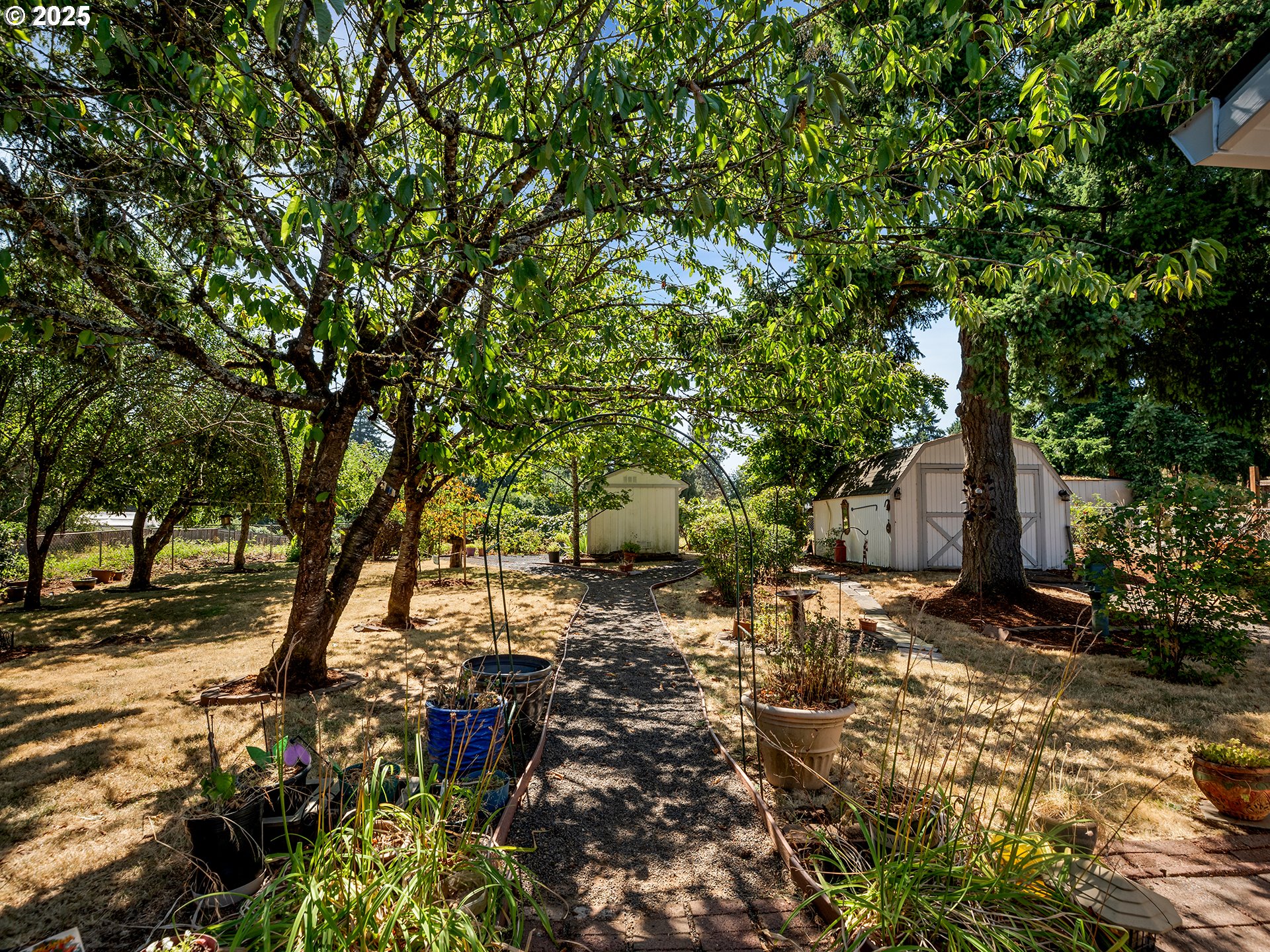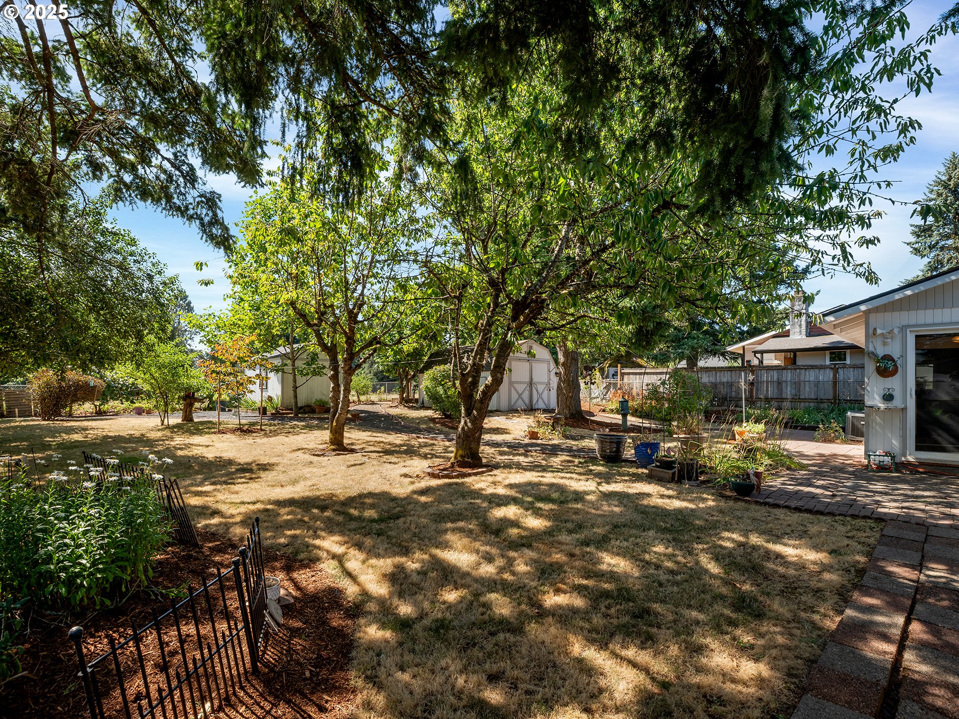 Excellent single level home in the popular Finnegans neighborhood on a wonderful, lusciously landscaped large (0.28 acre) private lot surrounded by greenspace on three sides and with flowers galore and multiple fruit trees including apples, plums, cherries, a grape arbor and a filbert tree! This bountiful lot also has the convenience of a circular driveway, backyard patio and two sheds (12x16 & 12x8) for ample outdoor storage. Inside the easy flow floorplan consists of three bedrooms (two with new carpeting as of June 2025), two bathrooms, an extended kitchen for either additional work/storage space or an eat-in option. Use the center room for either a living room or dining room with a cozy fireplace and the additional room as you wish for bonus space. Other features include mostly solid surface floors, double paned vinyl windows with newer blinds throughout (approx 2019), updated kitchen in 2019 (with quartz countertops, soft close cabinets and drawers and pull out shelves), updated bathroom in 2025, water heater approx 6yrs old, HVAC (with central A/C) approx 4yrs old, newer roof (2025), updated paint inside and out (approx 2019), updated canned lighting added in 2024, crawlspace refresh including Visqueen vapor barrier and insulation (2024). Home also comes with a newer Generac generator and is part of the Clackamas River Water District. Annual HOA dues of $79/year are for greenspace and park/rec facility maintenance only.